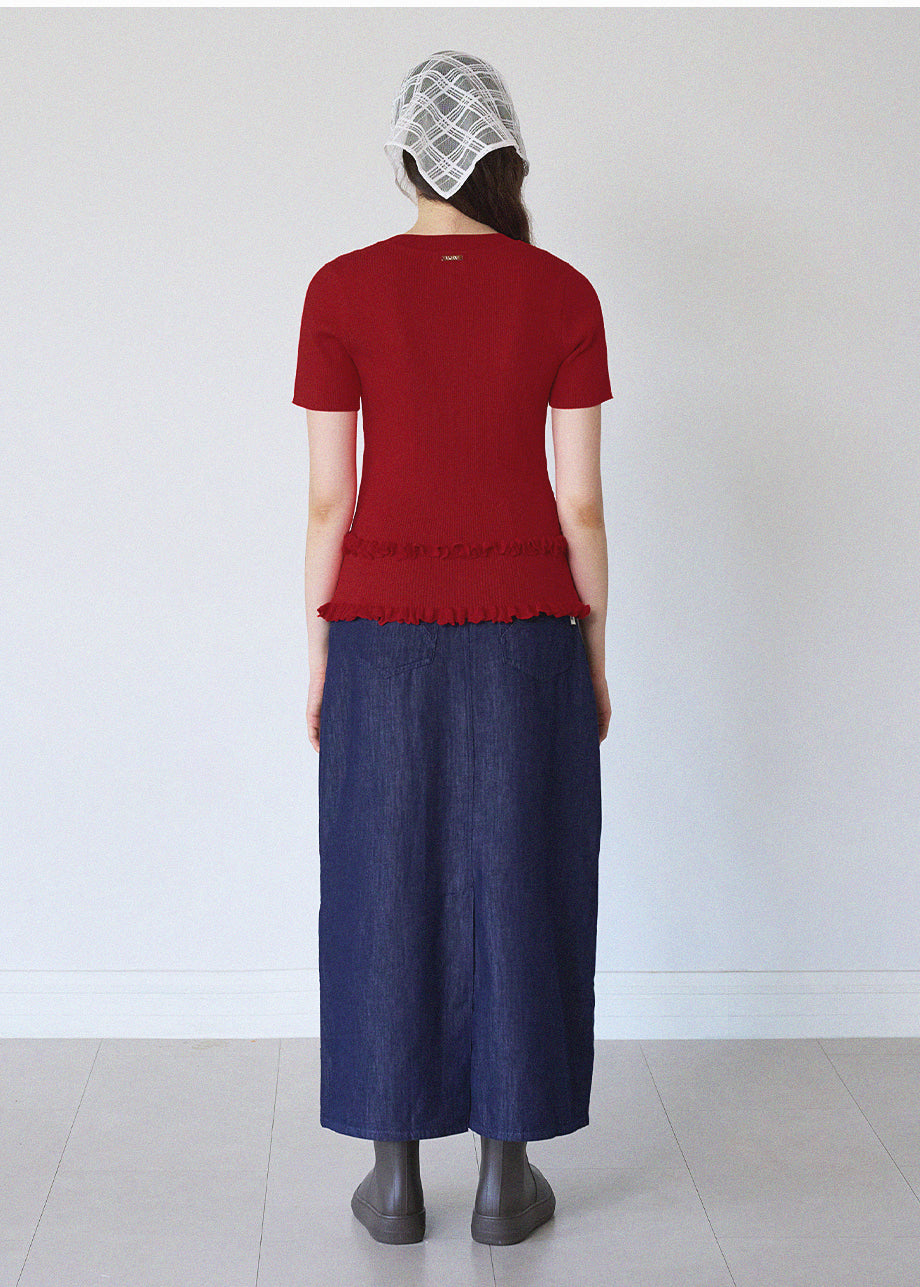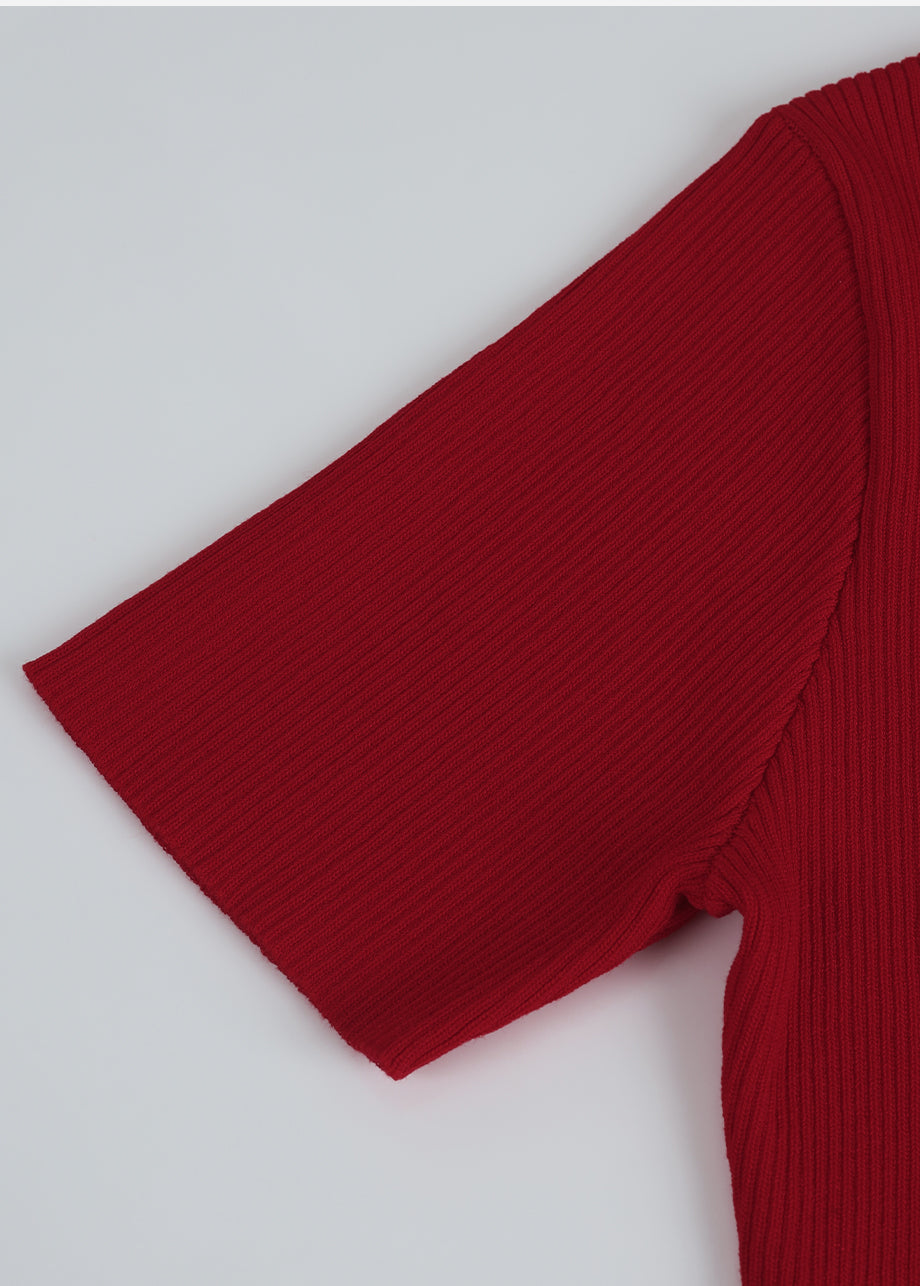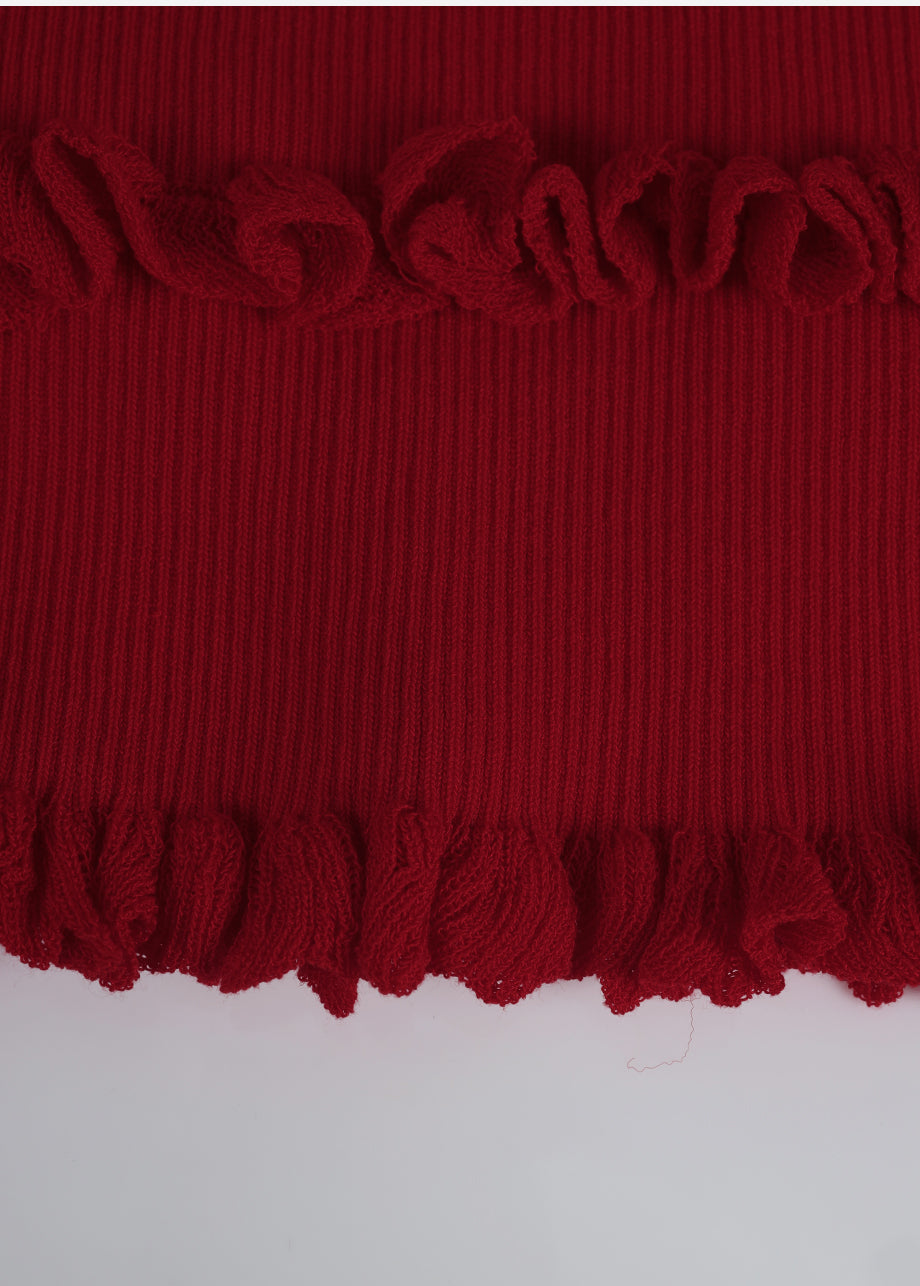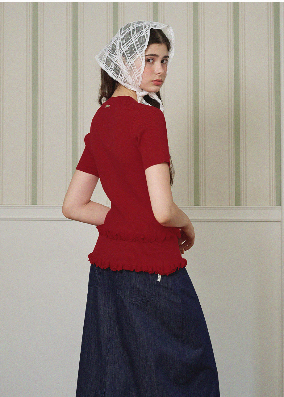 ラブリームード漂うニットTシャツです。しっかりとしたリブ編みで体型が目立ちにくく、安心して着用できます。Vネックとスリムなフィット感でスリムなシルエットを演出。裾に向かってAラインに広がるシルエットと、ユニークな編みのフリルディテールがアクセントに。*装飾が施された製品のため、クリーニング専門店でのお手入れをおすすめいたします。