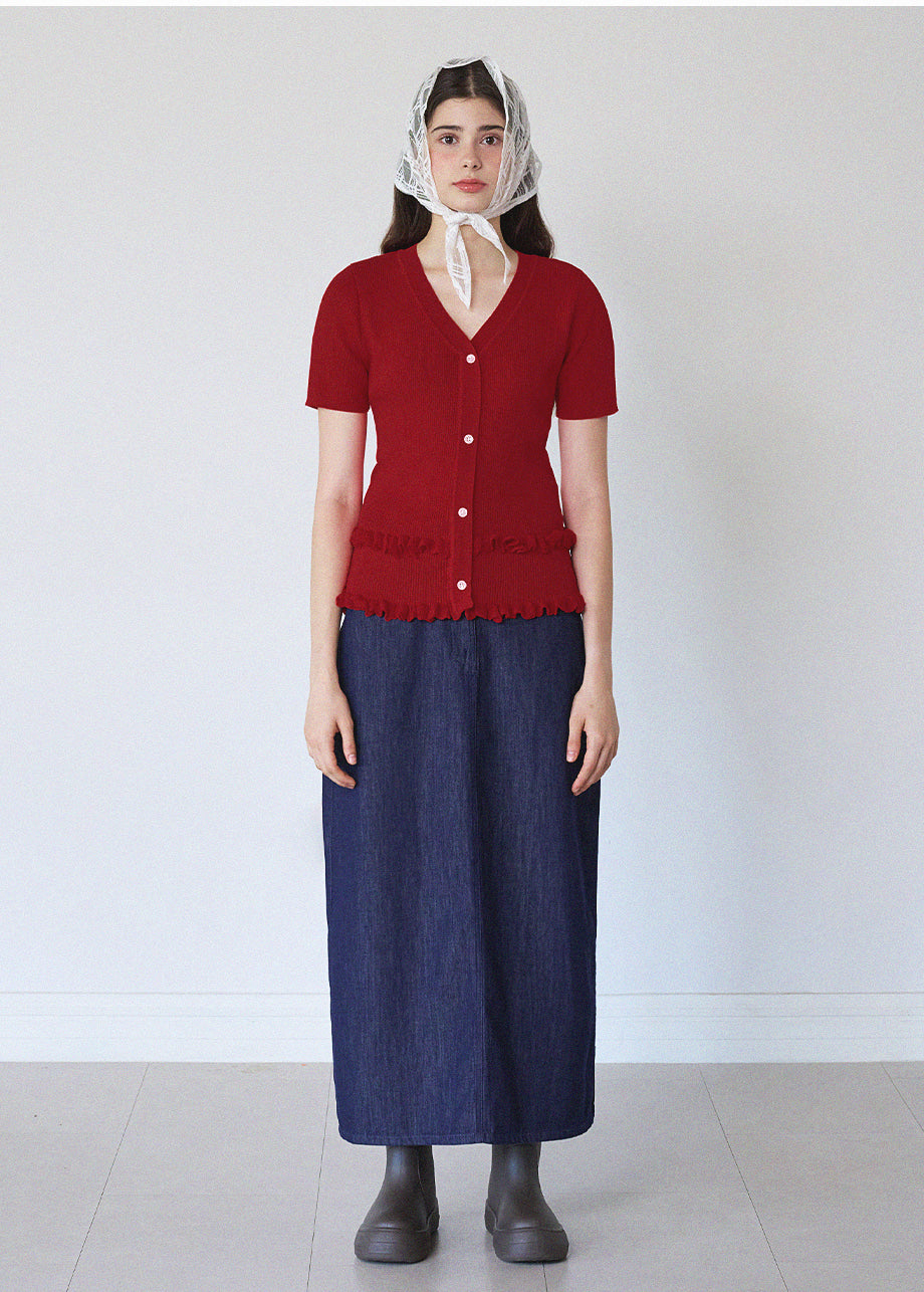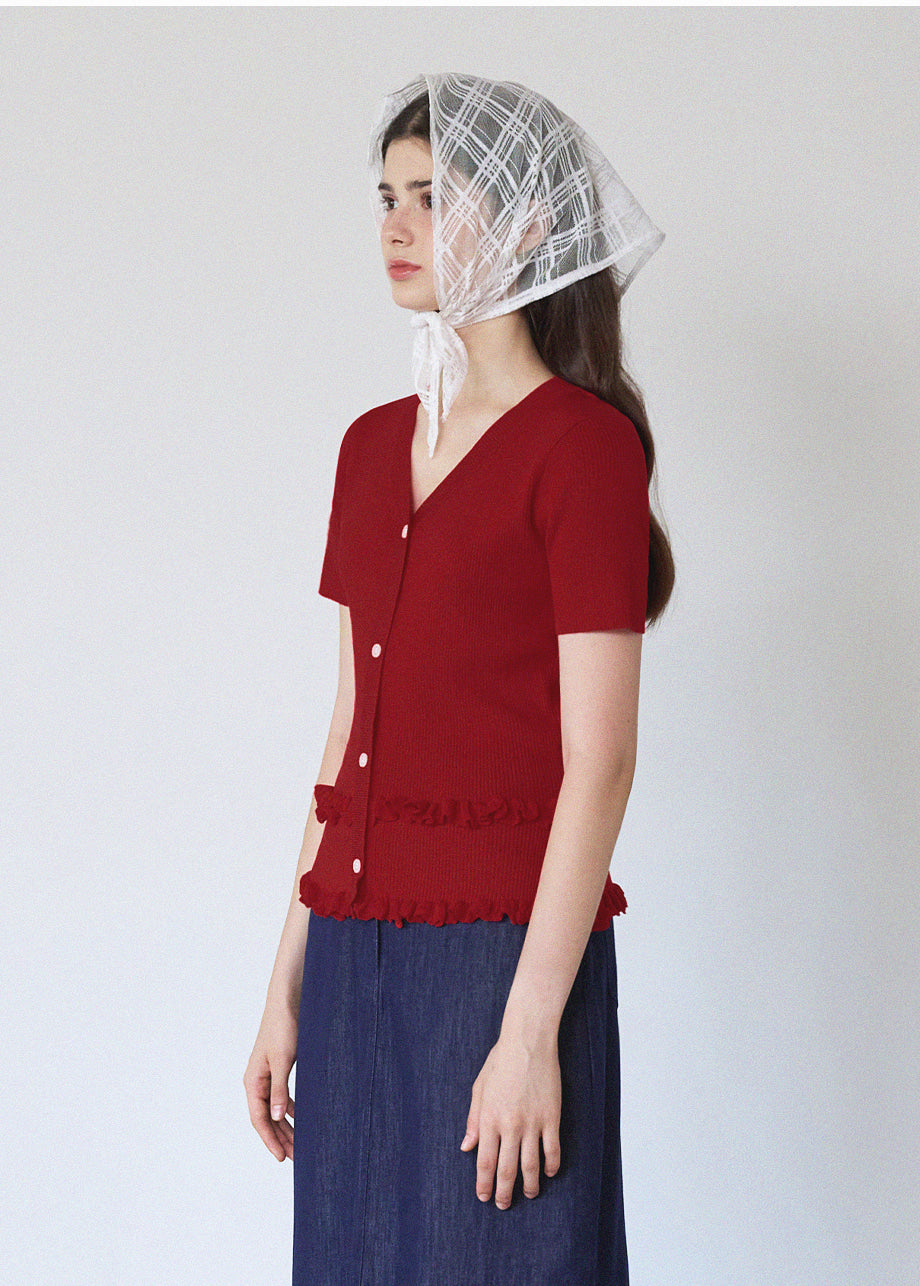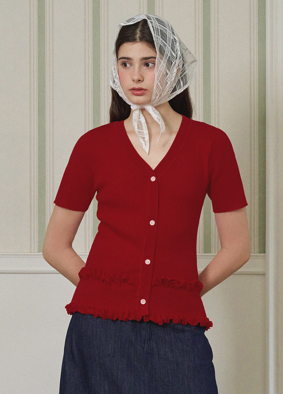 ラブリームード漂うニットTシャツです。しっかりとしたリブ編みで体型が目立ちにくく、安心して着用できます。Vネックとスリムなフィット感でスリムなシルエットを演出。裾に向かってAラインに広がるシルエットと、ユニークな編みのフリルディテールがアクセントに。*装飾が施された製品のため、クリーニング専門店でのお手入れをおすすめいたします。