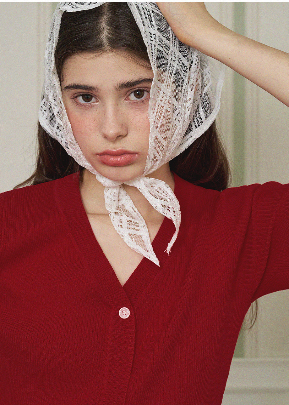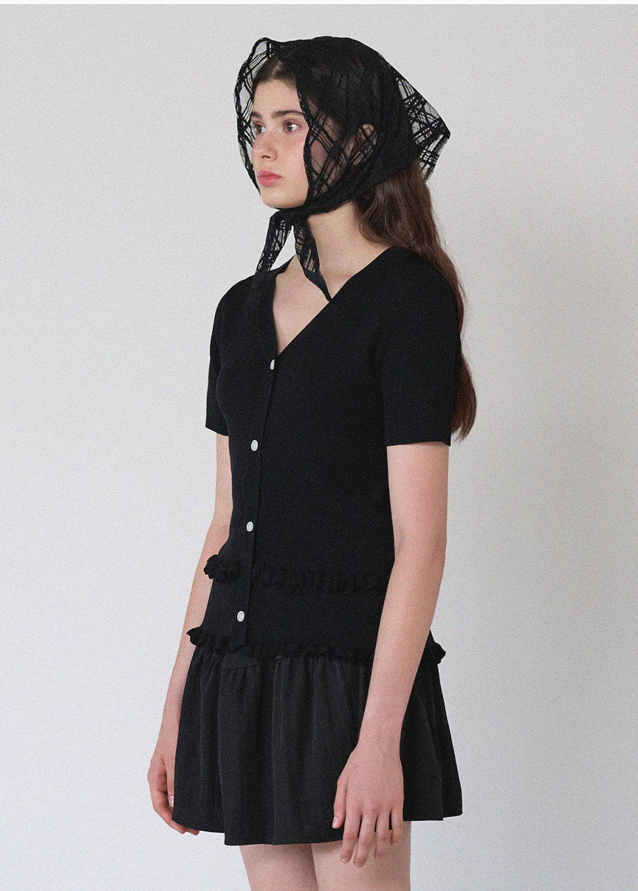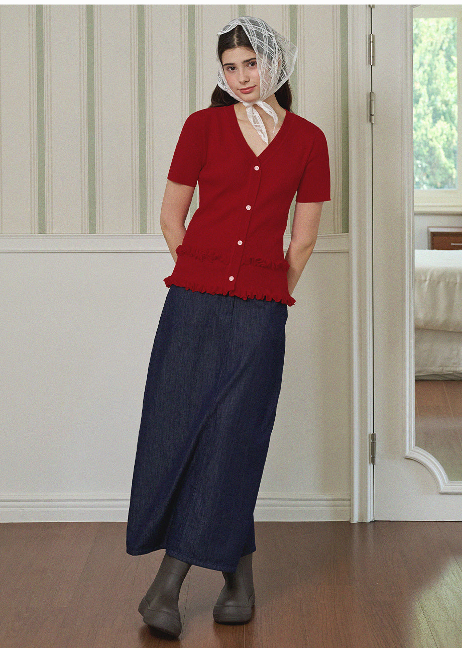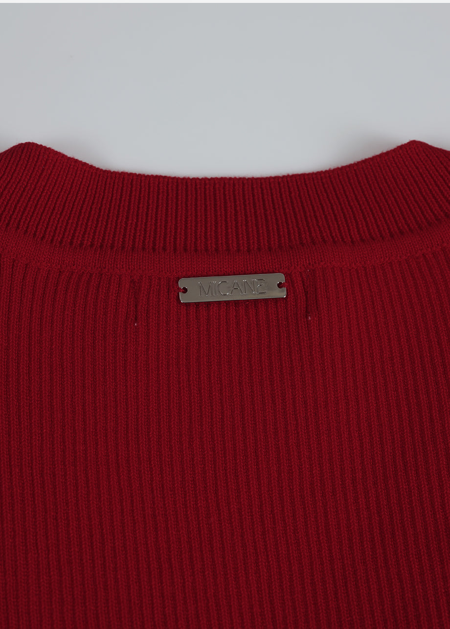 ラブリームード漂うニットTシャツです。しっかりとしたリブ編みで体型が目立ちにくく、安心して着用できます。Vネックとスリムなフィット感でスリムなシルエットを演出。裾に向かってAラインに広がるシルエットと、ユニークな編みのフリルディテールがアクセントに。*装飾が施された製品のため、クリーニング専門店でのお手入れをおすすめいたします。