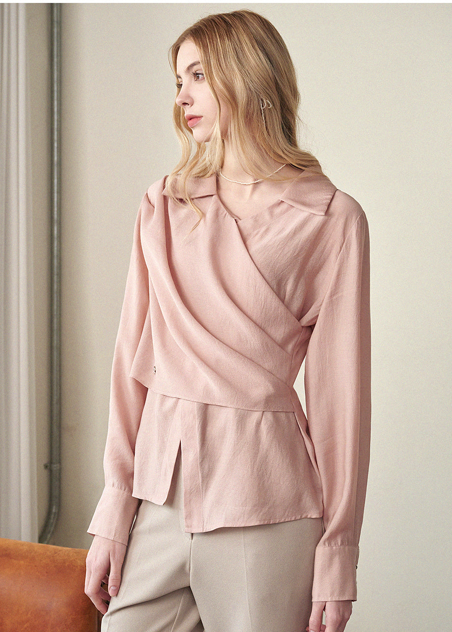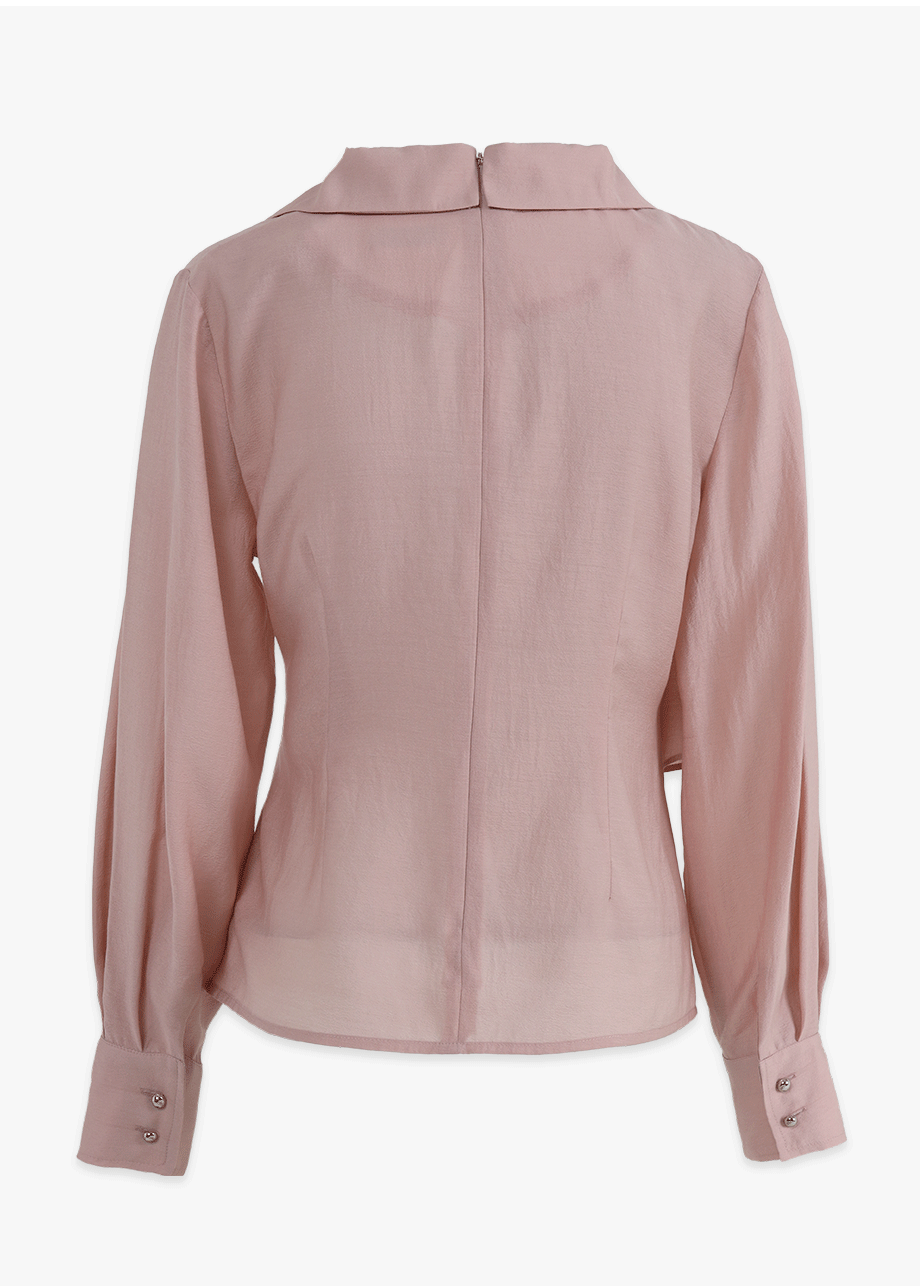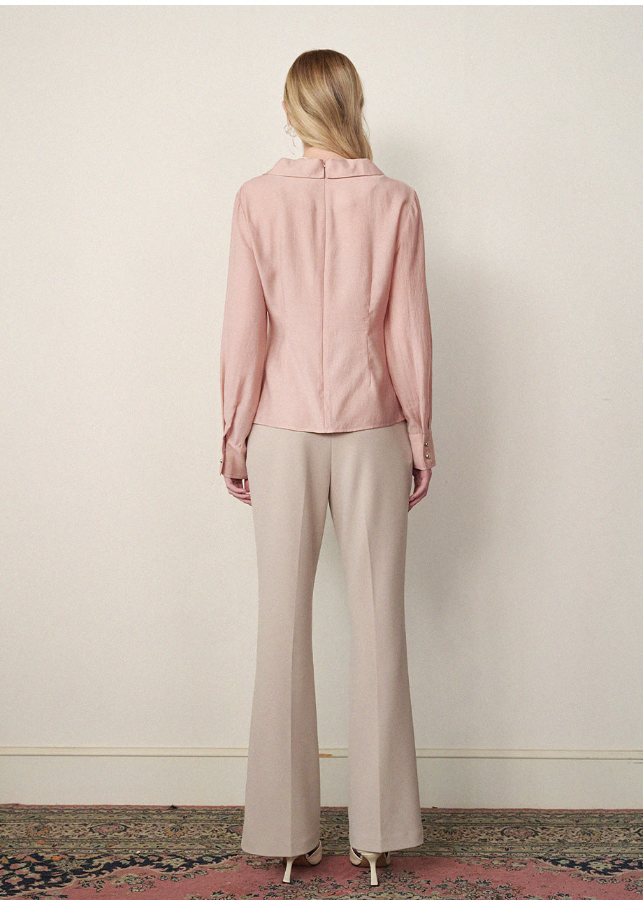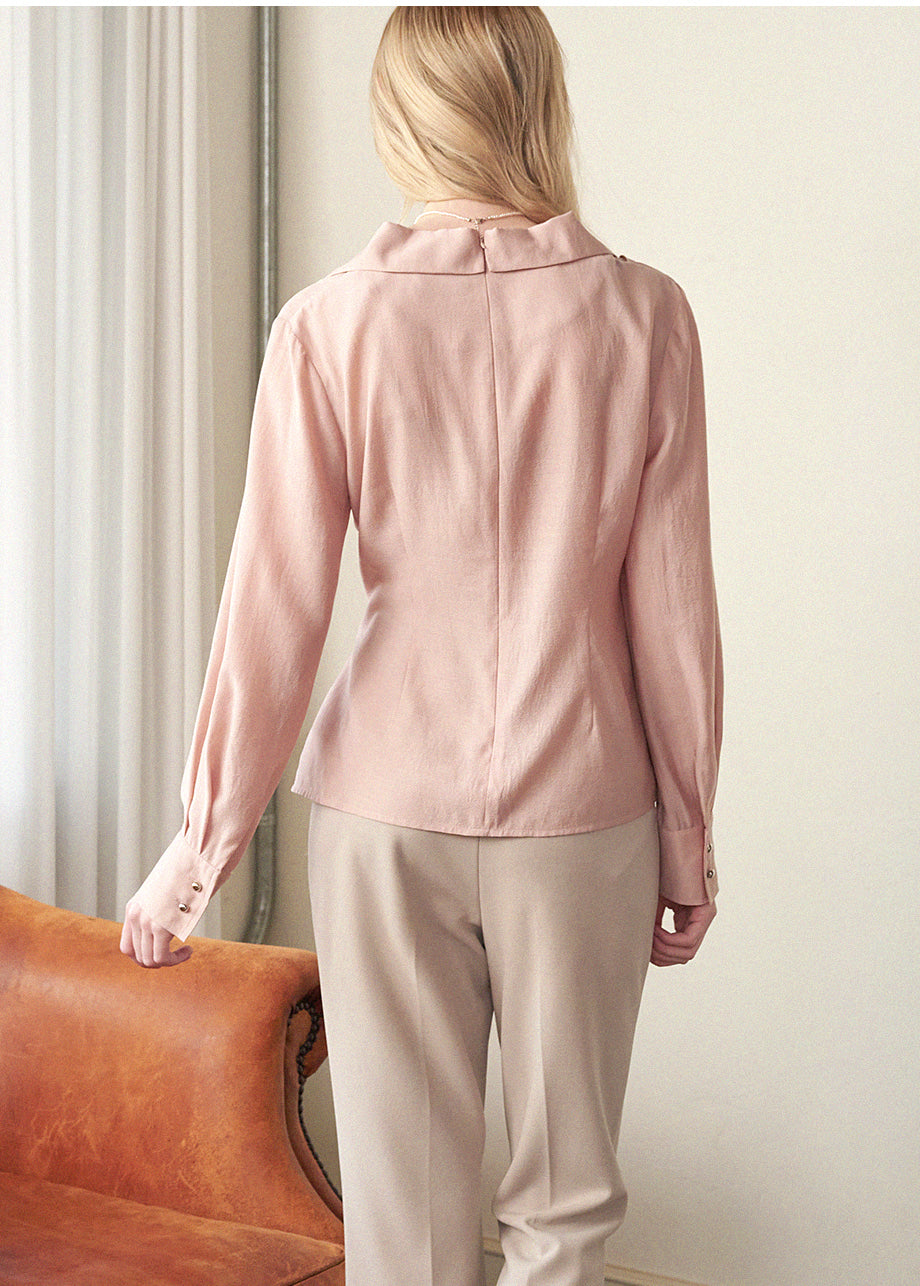 フェミニンムードで着用できるブラウスです。耐久性のあるポリエステルと肌触りの良いアセテートを混紡した生地で、肌への刺激を抑え快適に着用いただけます。