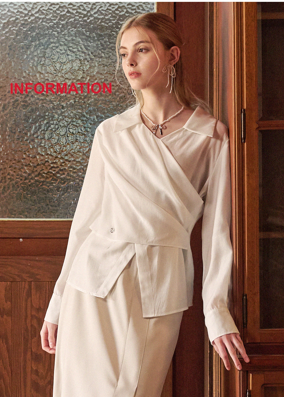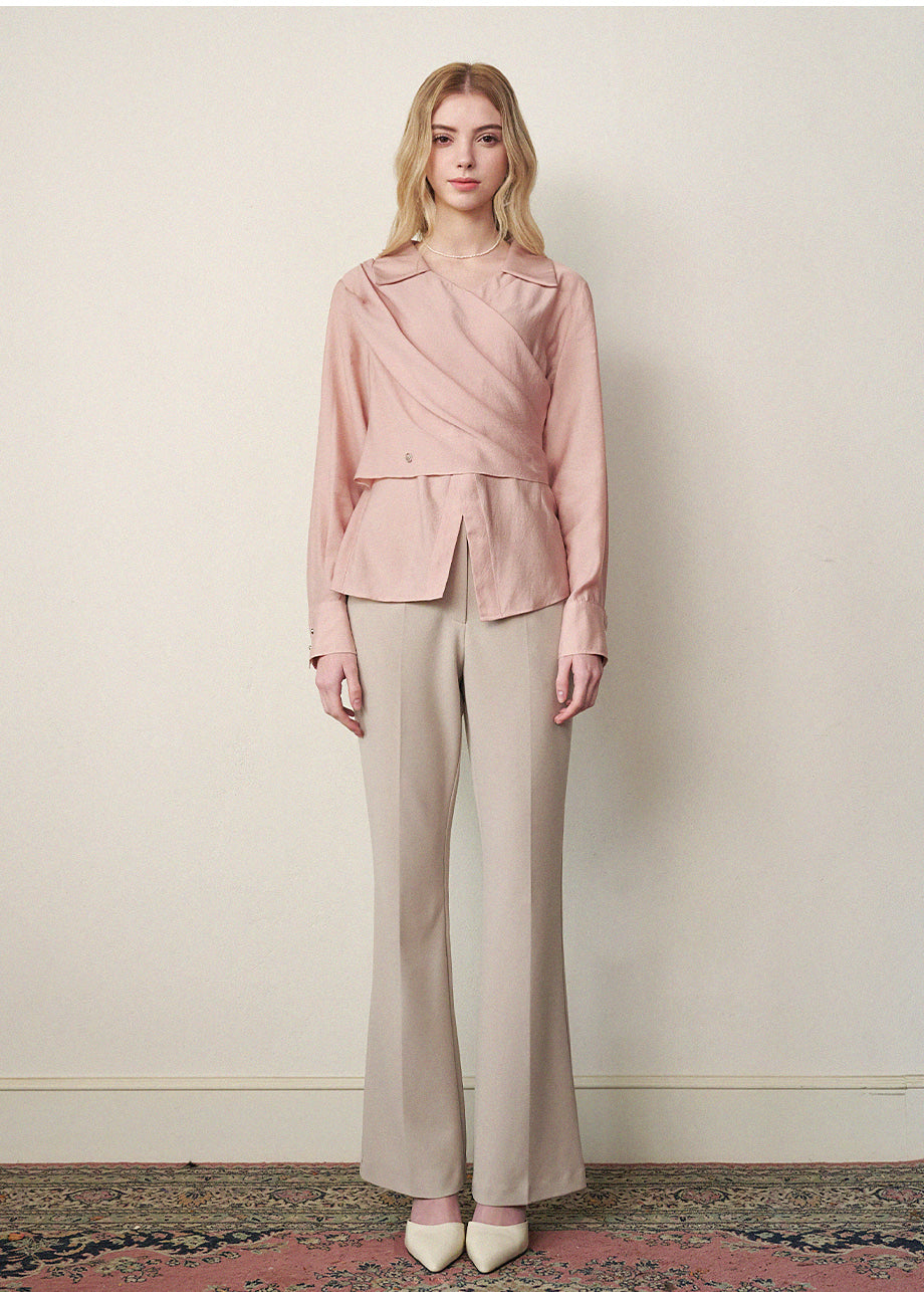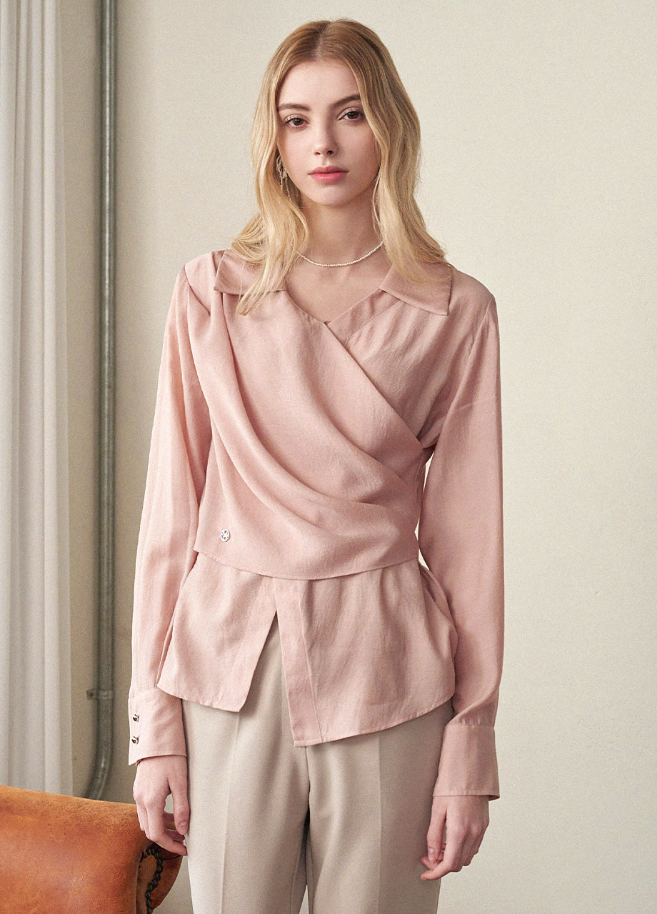 フェミニンムードで着用できるブラウスです。耐久性のあるポリエステルと肌触りの良いアセテートを混紡した生地で、肌への刺激を抑え快適に着用いただけます。