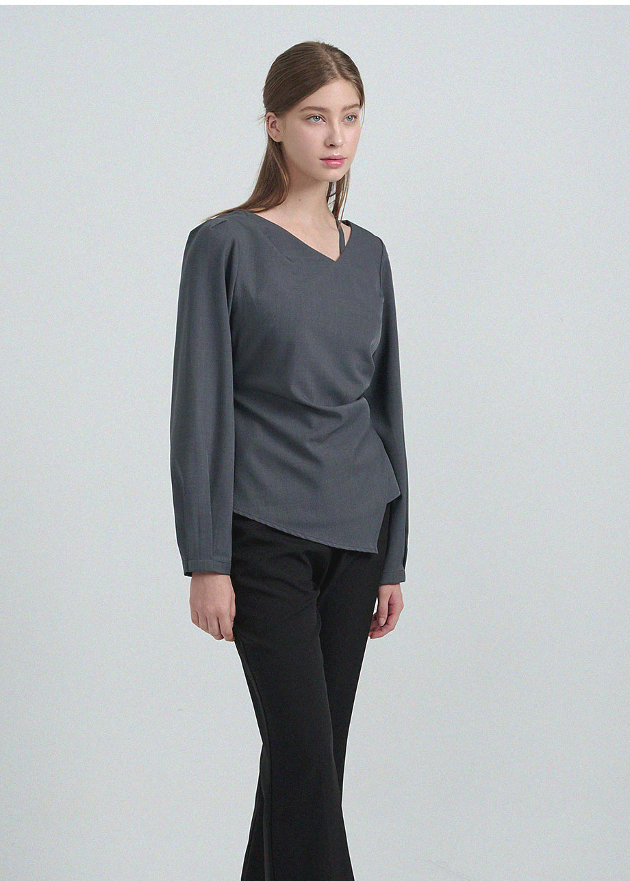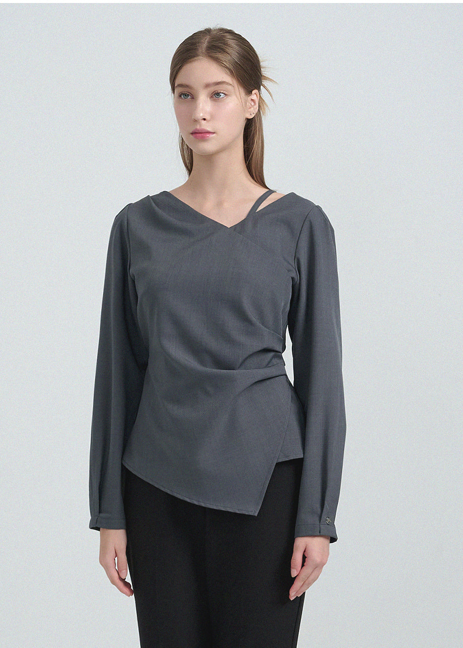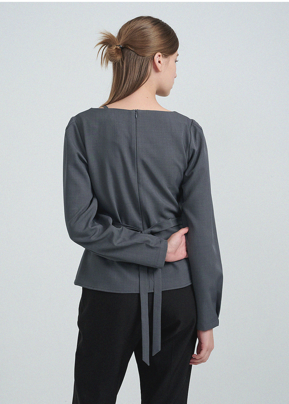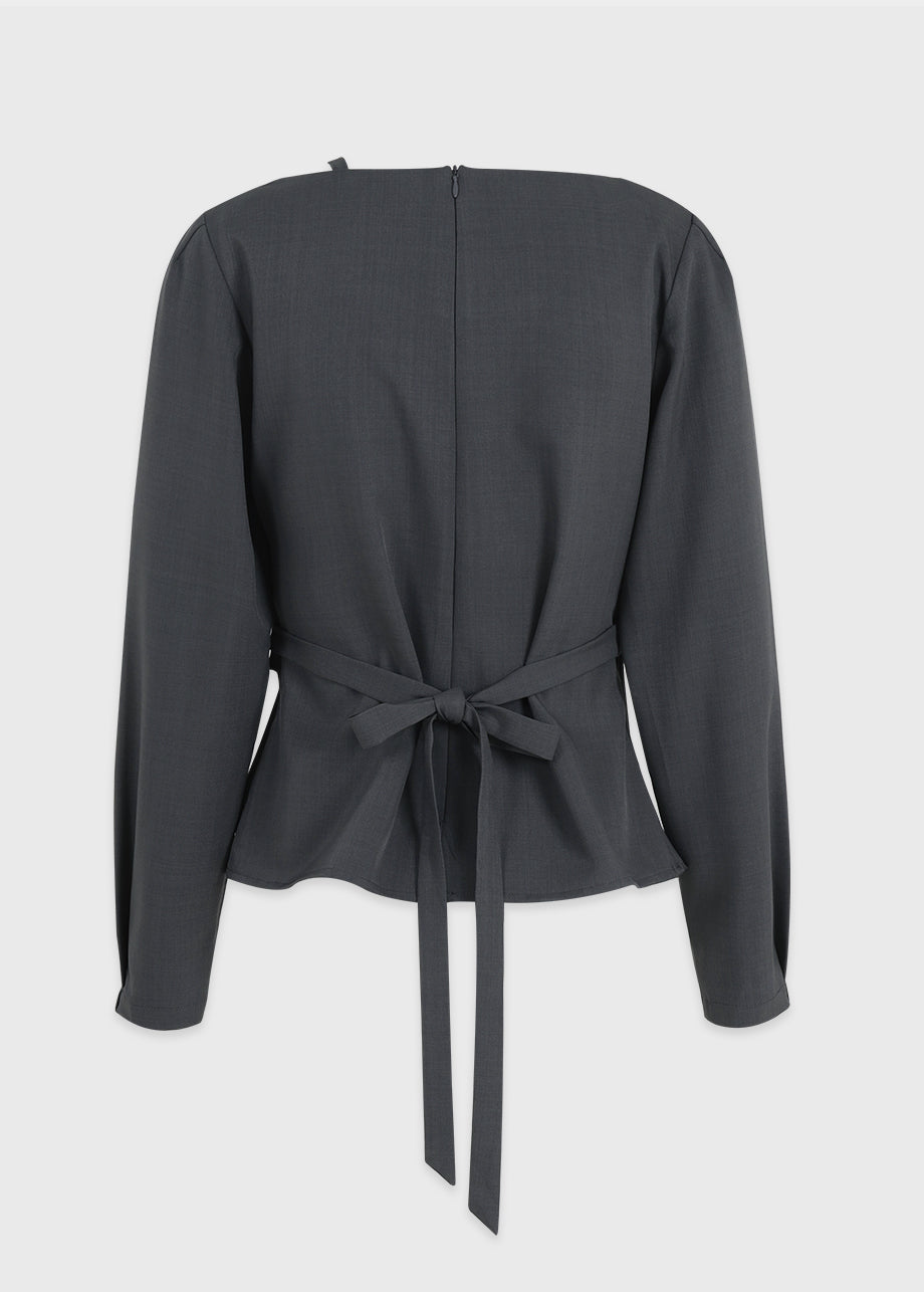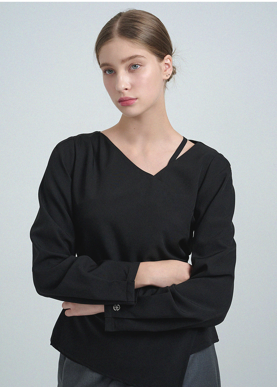 クラシックでフェミニンムードのブラウスです。FWバージョンとして季節感を深く表現した一着。耐久性と質感にこだわった高品質な生地を使用し、上品なムードと安定した着用感が特徴です。ヒップを覆う丈感とウエストをしっかりと整えて、ピンタックでアクセントを加えることで、洗練されたムードとともによりスリムなラインを演出。アンバランスなVネックにストラップをプラスし、ポイントを効かせてお楽しみいただけます。袖のサイドにはペンダント装飾を施し、クオリティを高めました。*装飾が施された製品のため、クリーニング専門店でのお手入れをおすすめいたします。