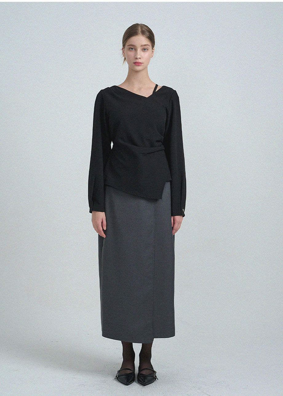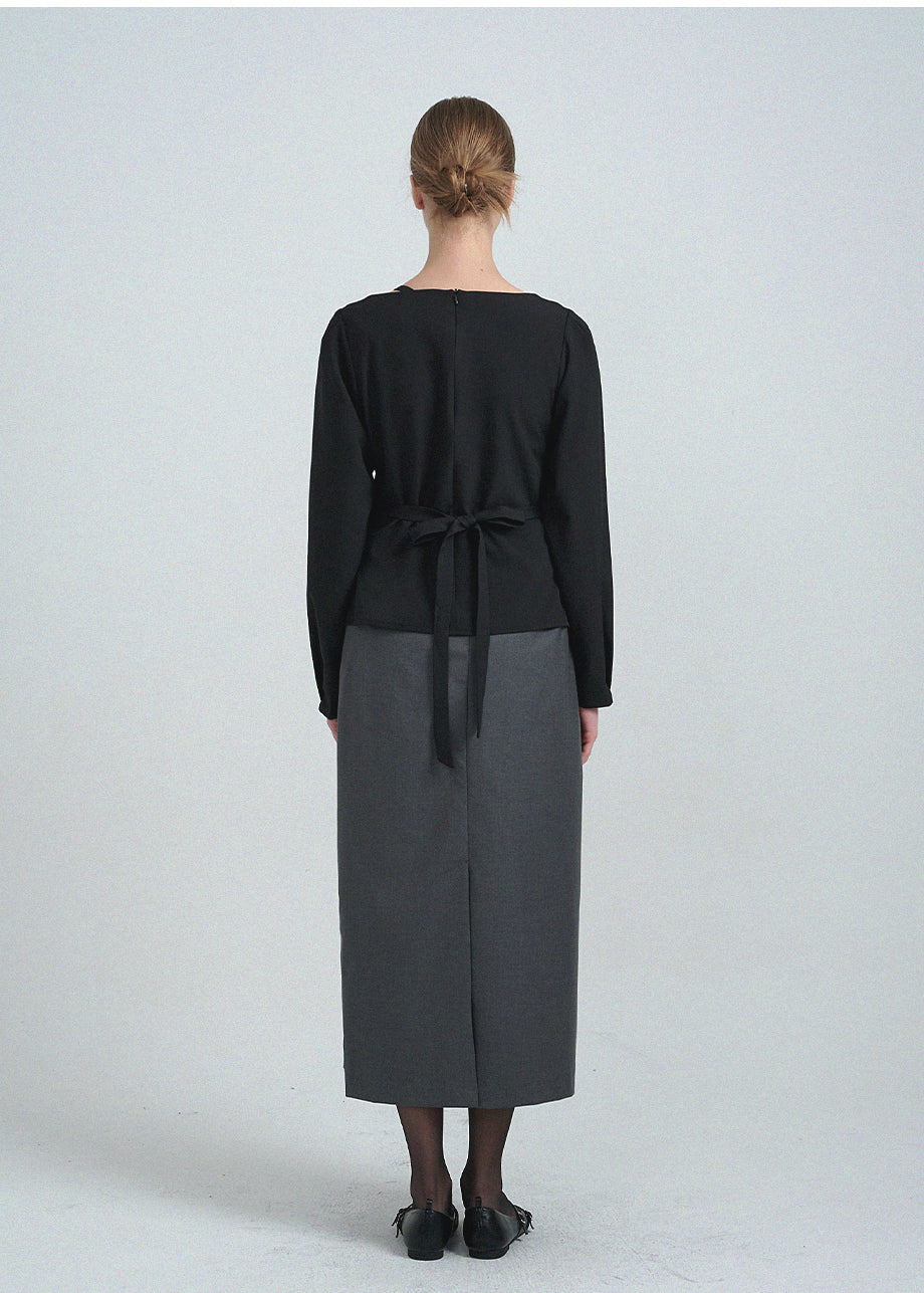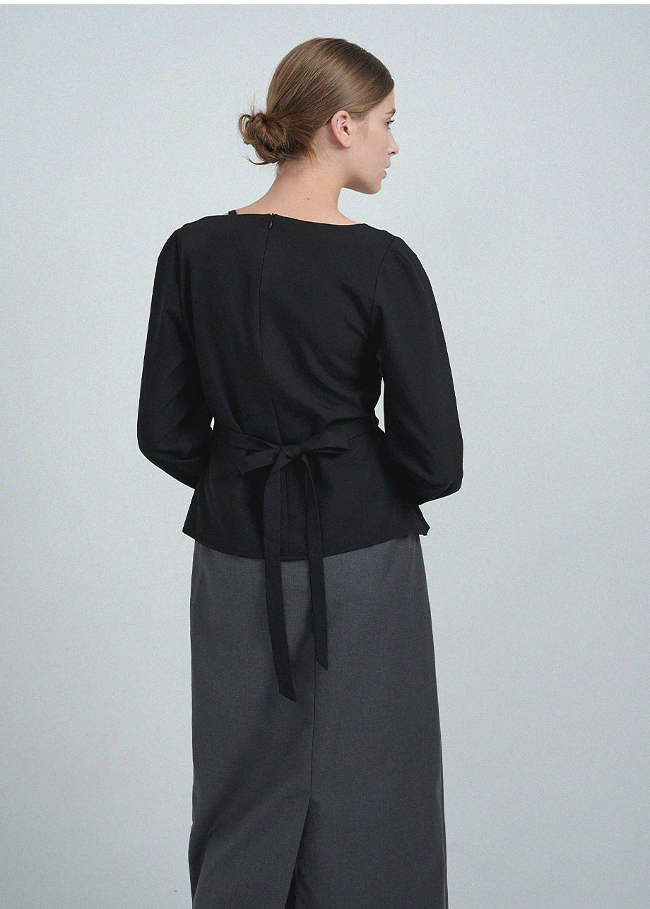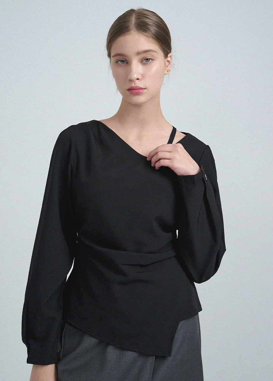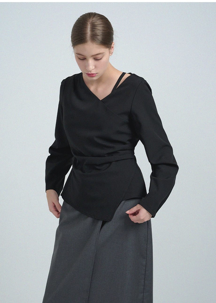 クラシックでフェミニンムードのブラウスです。FWバージョンとして季節感を深く表現した一着。耐久性と質感にこだわった高品質な生地を使用し、上品なムードと安定した着用感が特徴です。ヒップを覆う丈感とウエストをしっかりと整えて、ピンタックでアクセントを加えることで、洗練されたムードとともによりスリムなラインを演出。アンバランスなVネックにストラップをプラスし、ポイントを効かせてお楽しみいただけます。袖のサイドにはペンダント装飾を施し、クオリティを高めました。*装飾が施された製品のため、クリーニング専門店でのお手入れをおすすめいたします。