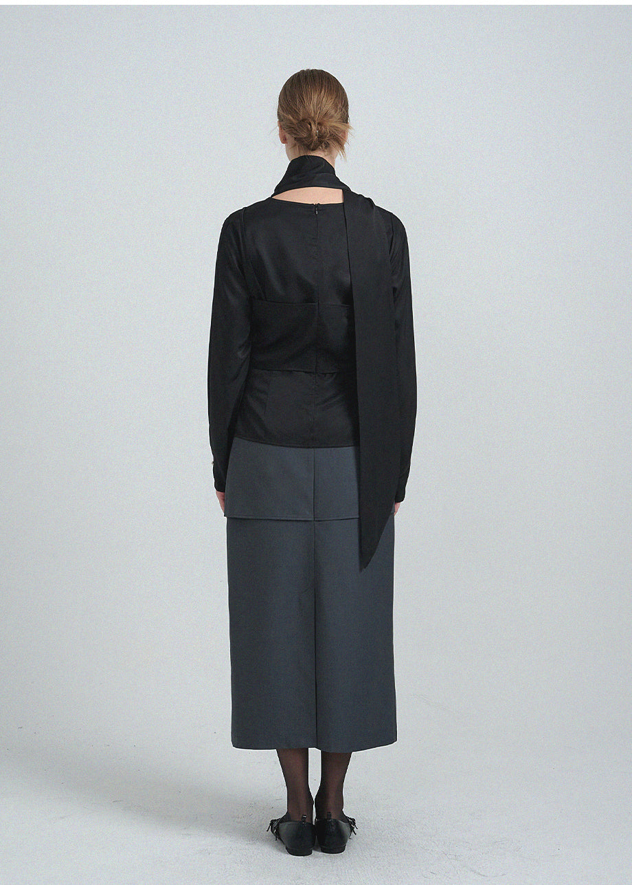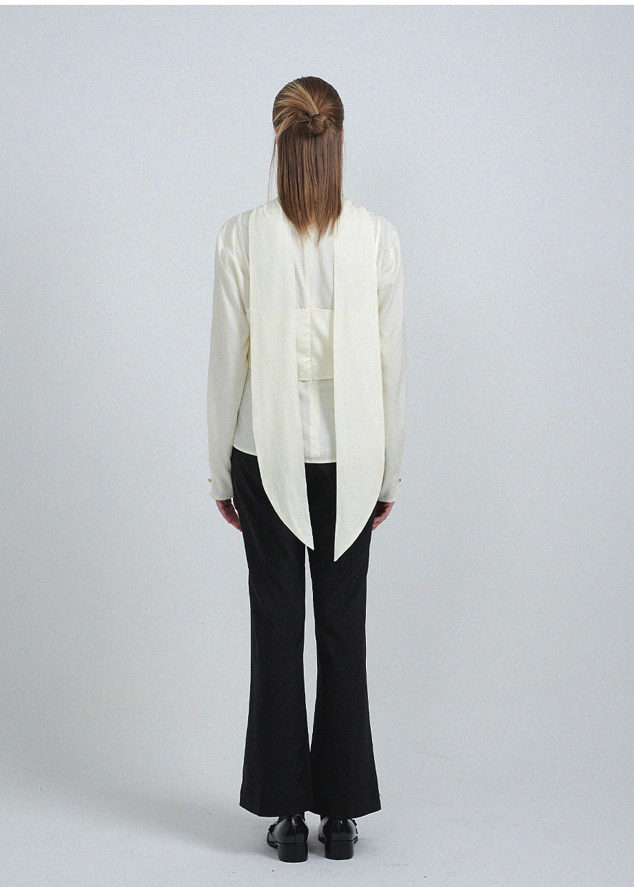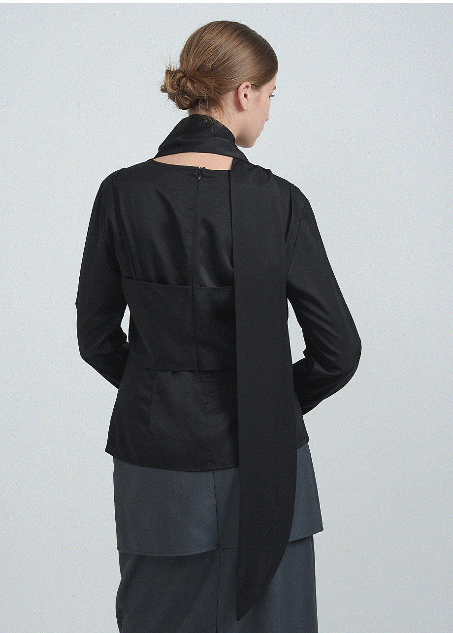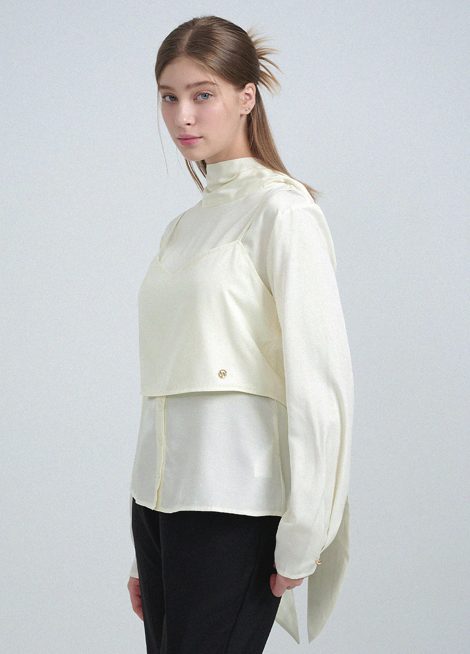 クラシックな雰囲気のブラウスです。柔らかく軽やかな生地で仕立てられており、快適な着心地が特徴です。派手すぎず、ほんのりとした光沢感のある生地が上品さを引き立てます。ペンダント付きのタイネックデザインは、結び方によってさまざまなスタイリングが楽しめます。ビスチェを重ねたようなレイヤード風のデザインが、より洗練されたムードを演出するおすすめの一着です。*装飾が施された製品のため、クリーニング専門店でのお手入れをおすすめいたします。