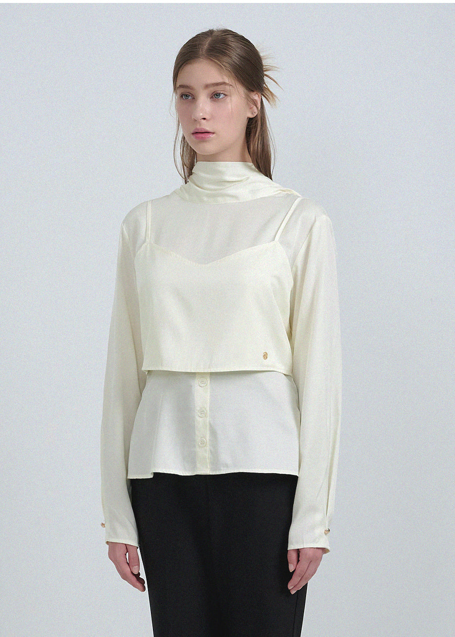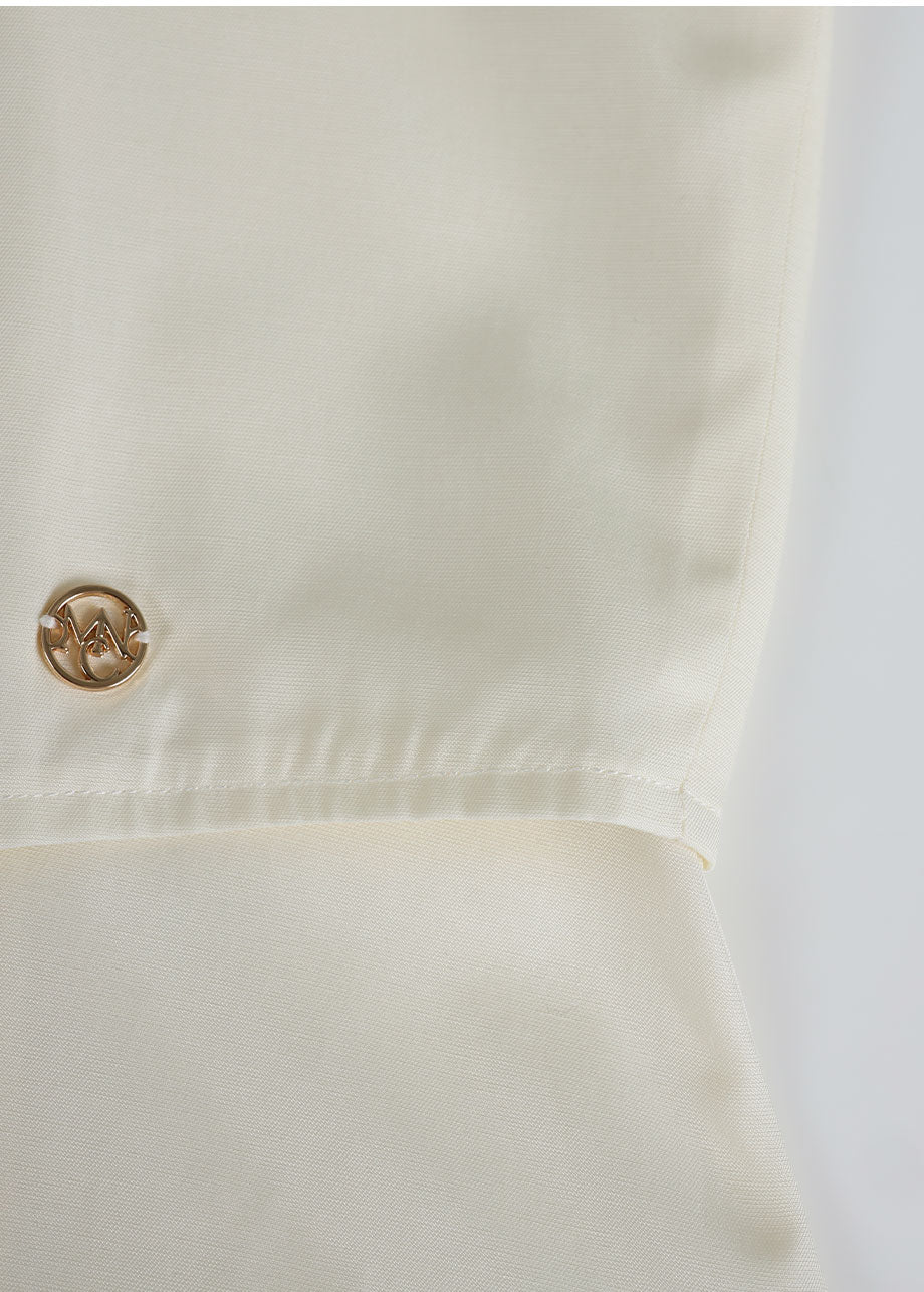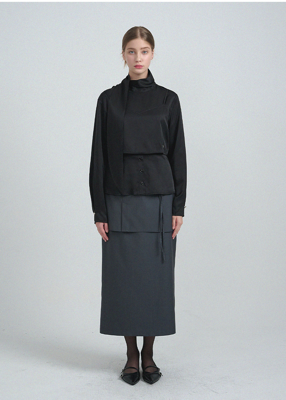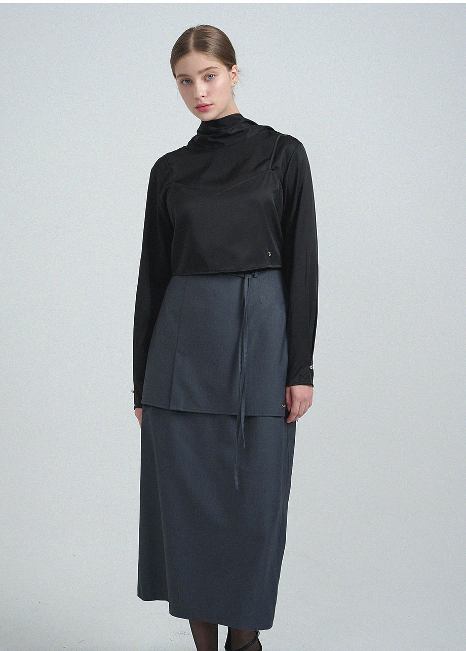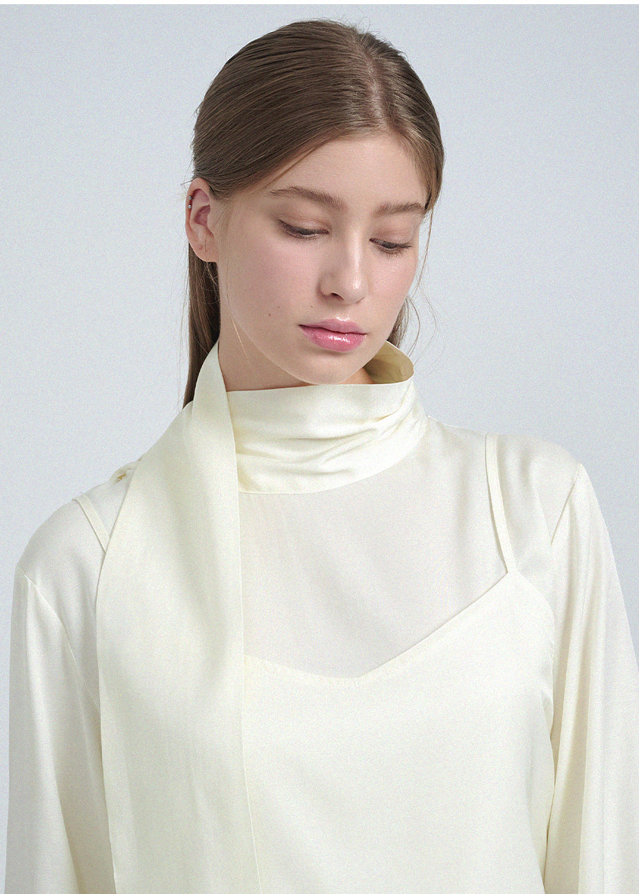 クラシックな雰囲気のブラウスです。柔らかく軽やかな生地で仕立てられており、快適な着心地が特徴です。派手すぎず、ほんのりとした光沢感のある生地が上品さを引き立てます。ペンダント付きのタイネックデザインは、結び方によってさまざまなスタイリングが楽しめます。ビスチェを重ねたようなレイヤード風のデザインが、より洗練されたムードを演出するおすすめの一着です。*装飾が施された製品のため、クリーニング専門店でのお手入れをおすすめいたします。