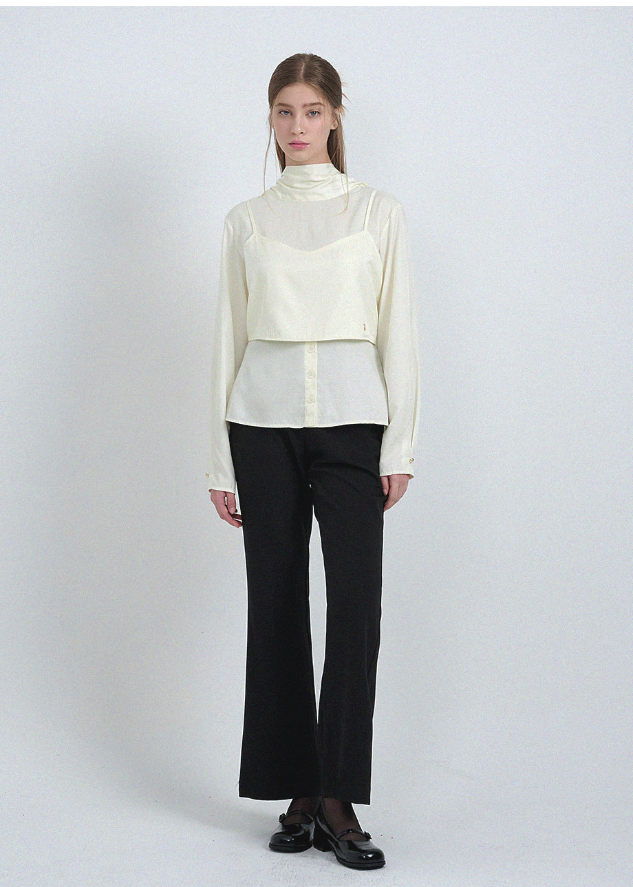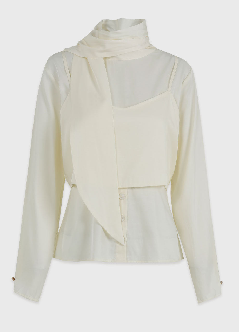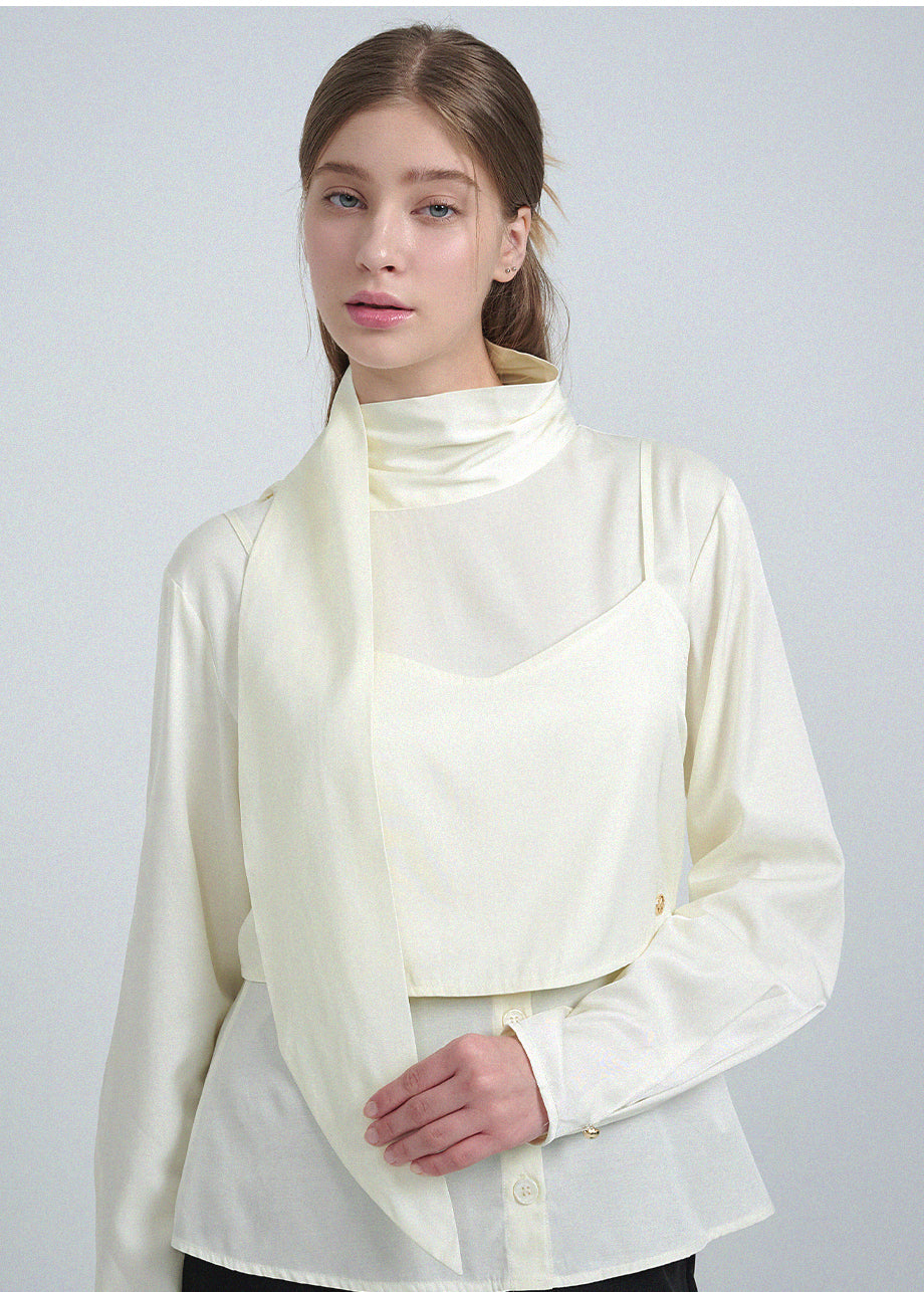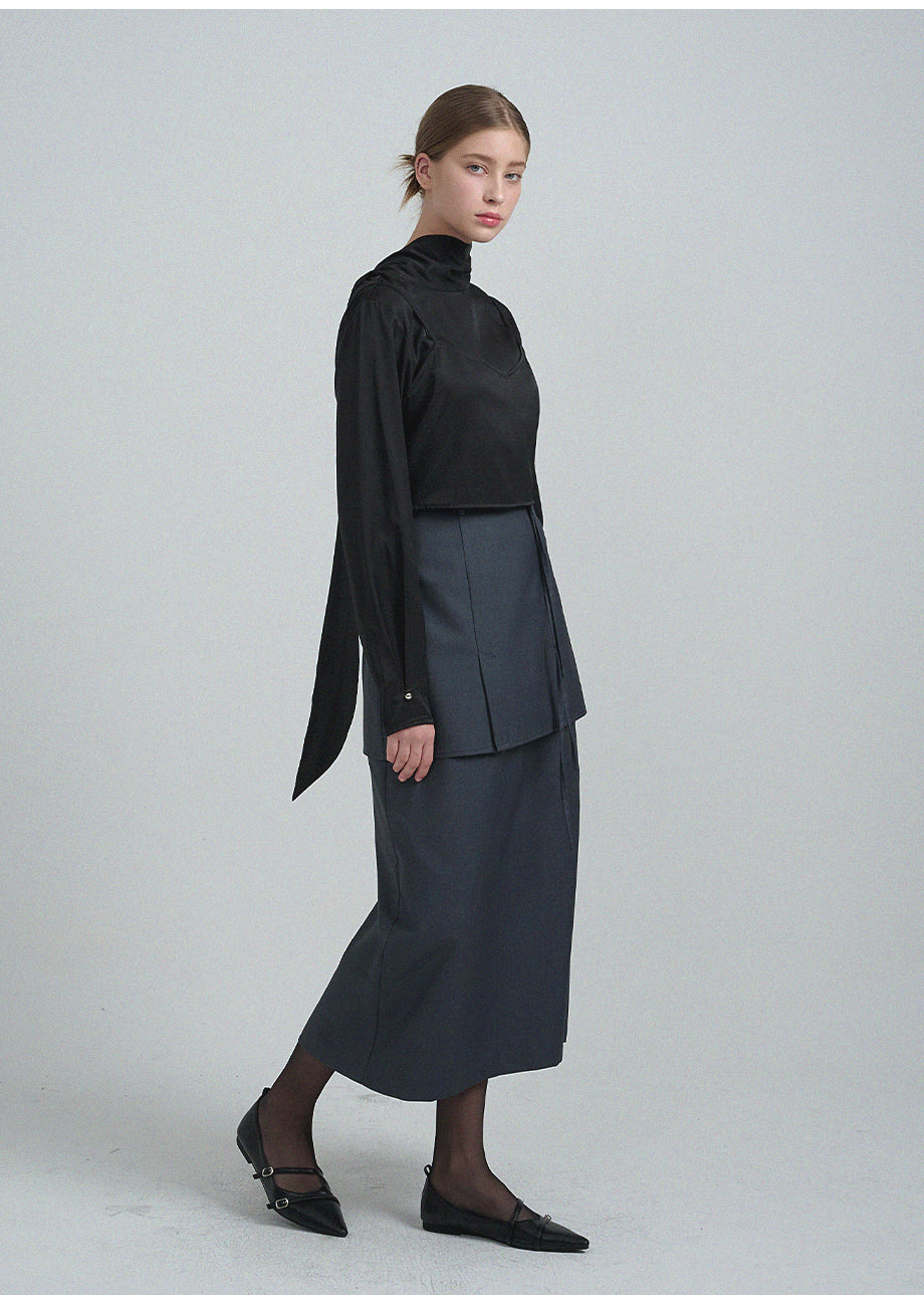 クラシックな雰囲気のブラウスです。柔らかく軽やかな生地で仕立てられており、快適な着心地が特徴です。派手すぎず、ほんのりとした光沢感のある生地が上品さを引き立てます。ペンダント付きのタイネックデザインは、結び方によってさまざまなスタイリングが楽しめます。ビスチェを重ねたようなレイヤード風のデザインが、より洗練されたムードを演出するおすすめの一着です。*装飾が施された製品のため、クリーニング専門店でのお手入れをおすすめいたします。
