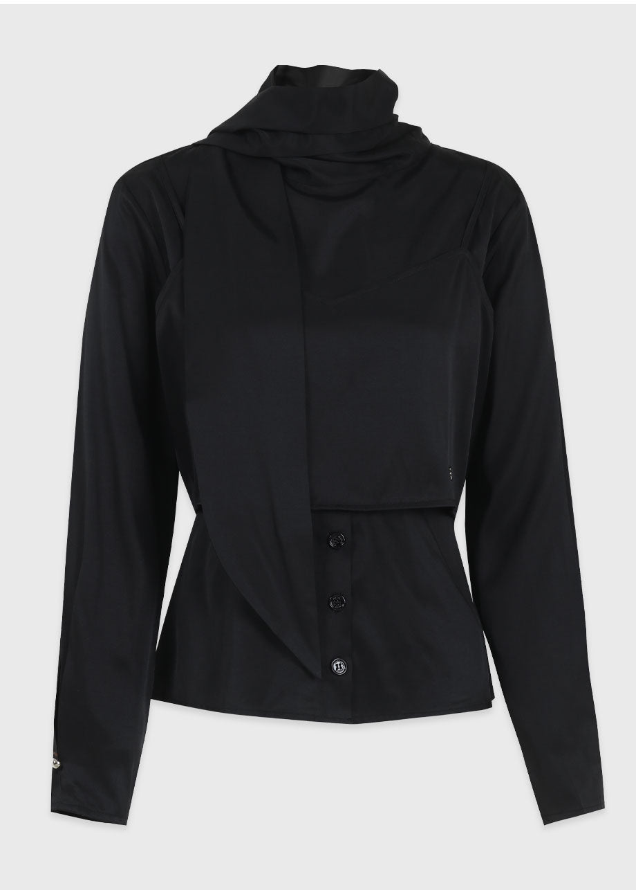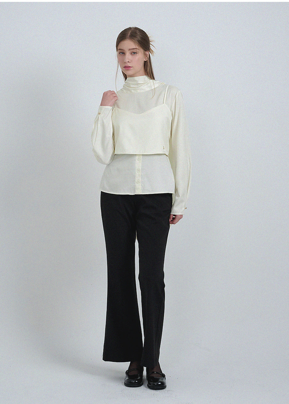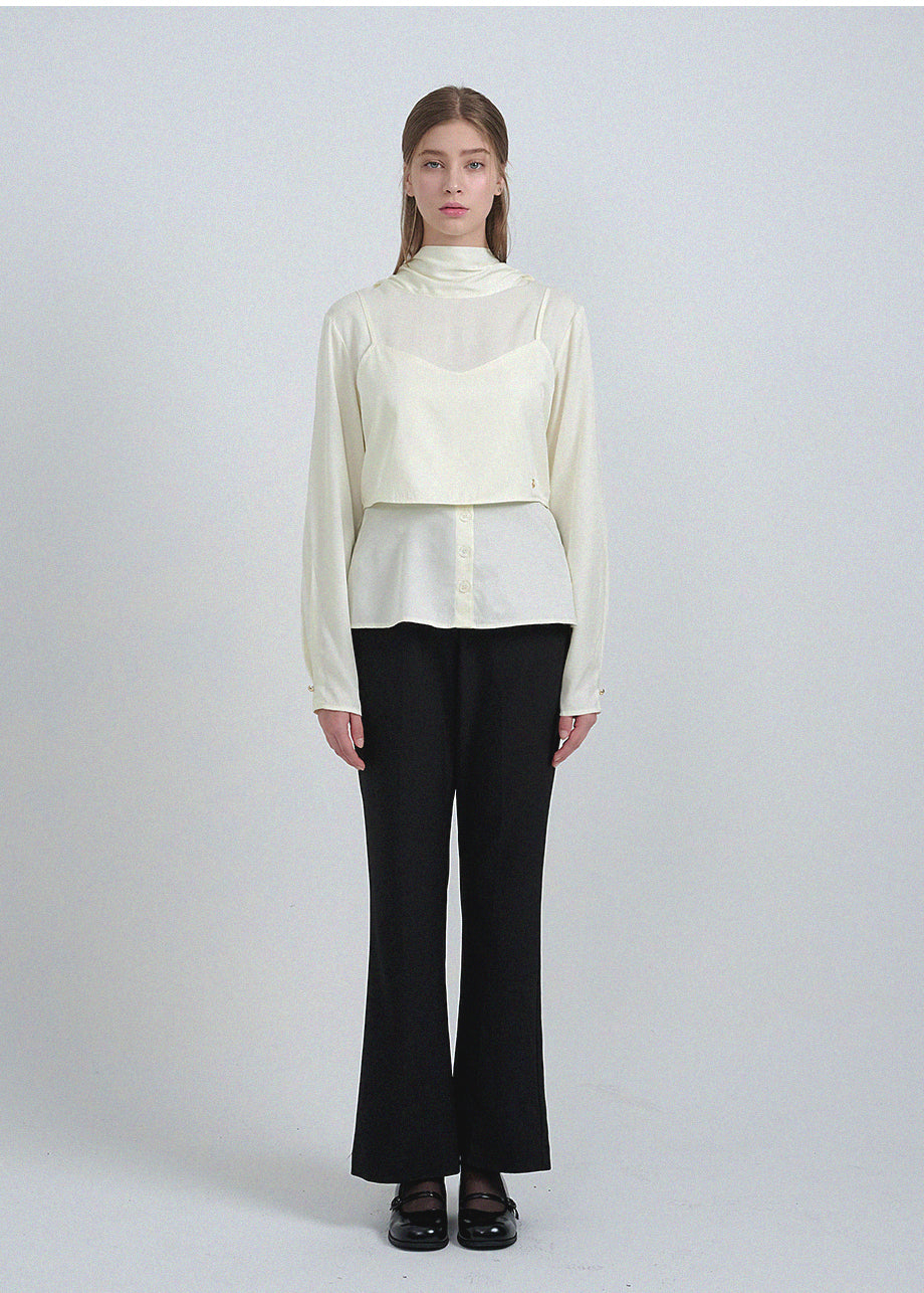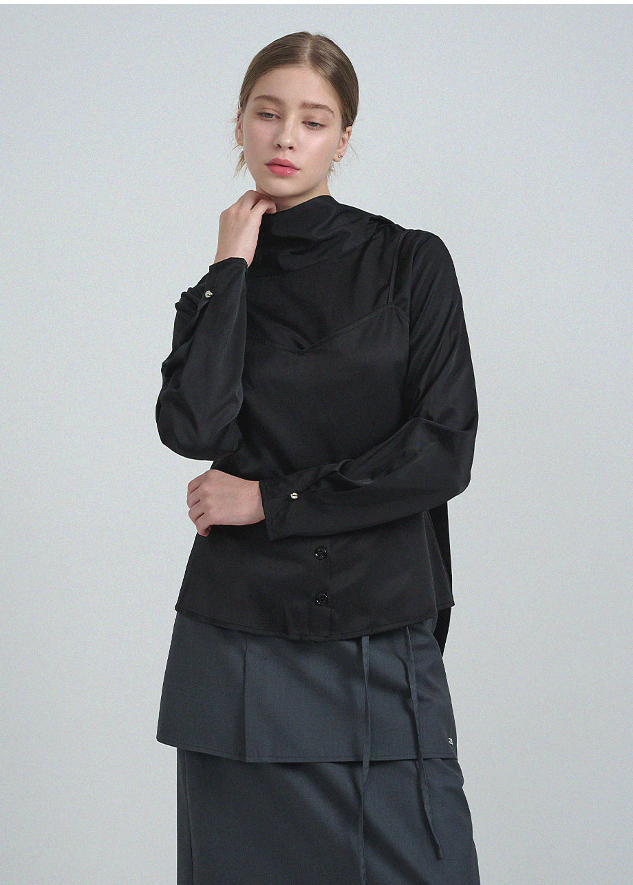 クラシックな雰囲気のブラウスです。柔らかく軽やかな生地で仕立てられており、快適な着心地が特徴です。派手すぎず、ほんのりとした光沢感のある生地が上品さを引き立てます。ペンダント付きのタイネックデザインは、結び方によってさまざまなスタイリングが楽しめます。ビスチェを重ねたようなレイヤード風のデザインが、より洗練されたムードを演出するおすすめの一着です。*装飾が施された製品のため、クリーニング専門店でのお手入れをおすすめいたします。