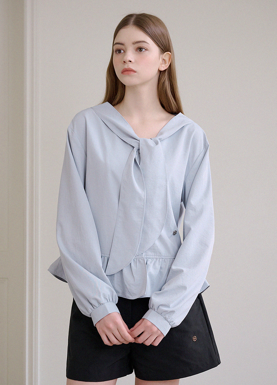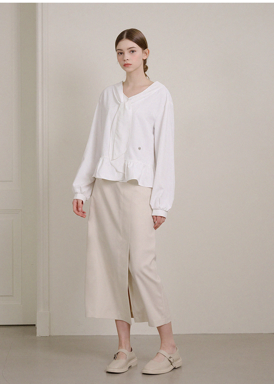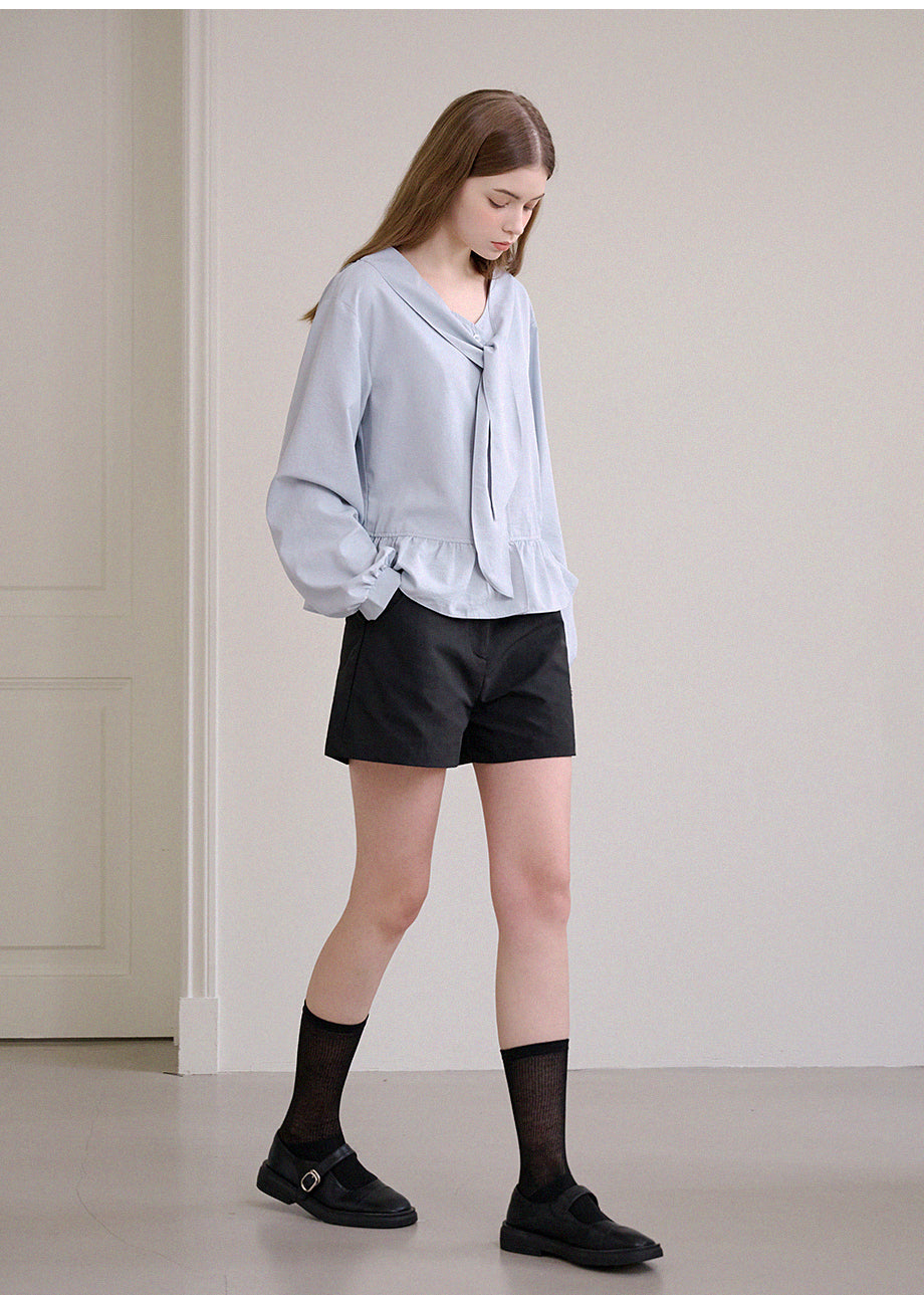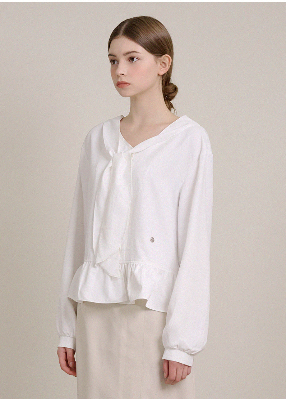 フェミニンな感性のあるタイ付きブラウスです。Vネックデザインに両肩にタイが施されており、お好みに合わせて結んだり垂らしたりして上品に演出いただけます。*装飾が施された製品のため、クリーニング専門店でのお手入れをおすすめいたします。