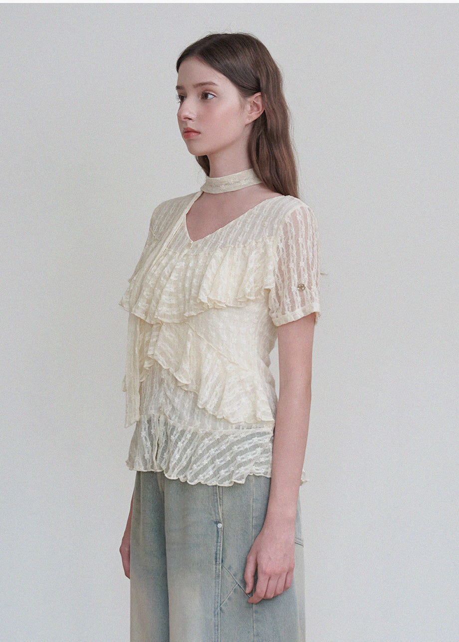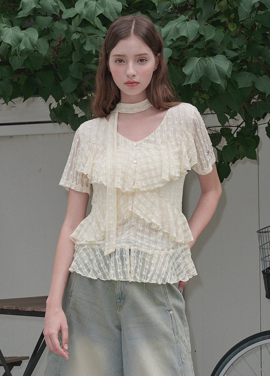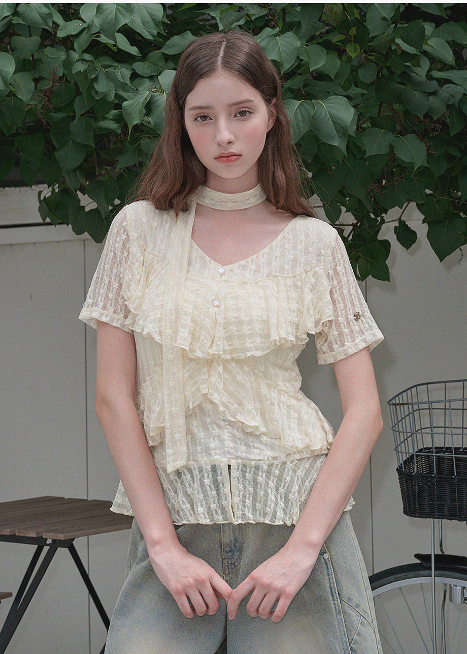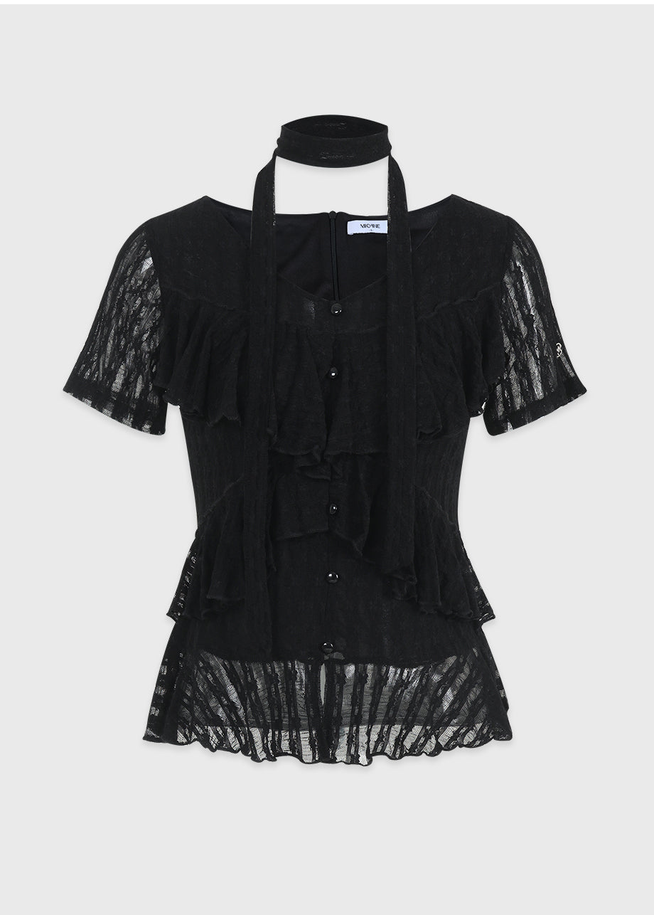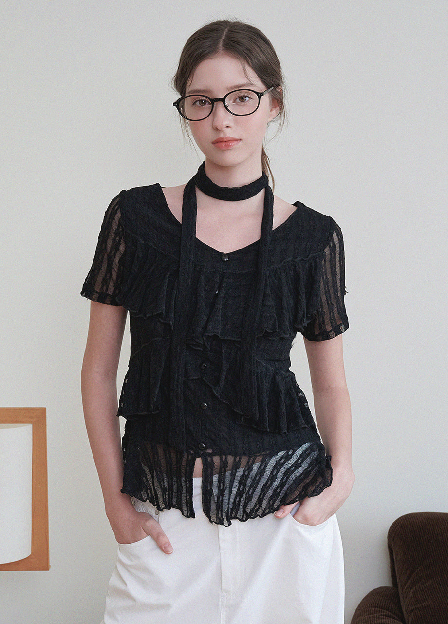 ヴィンテージ感のある半袖ブラウスです。Vネックデザインとスリムなフィット感でスッキリとしたシルエットを演出します。全体に施されたラッフルディテールがポイントで、ヴィンテージとラブリーな雰囲気を同時に楽しめます。ネックにはタイがセットされており、シンプルになりすぎずコーデのアクセントになります。*装飾や特殊なデザインが施された製品のため、クリーニング専門店でのお手入れをおすすめいたします。