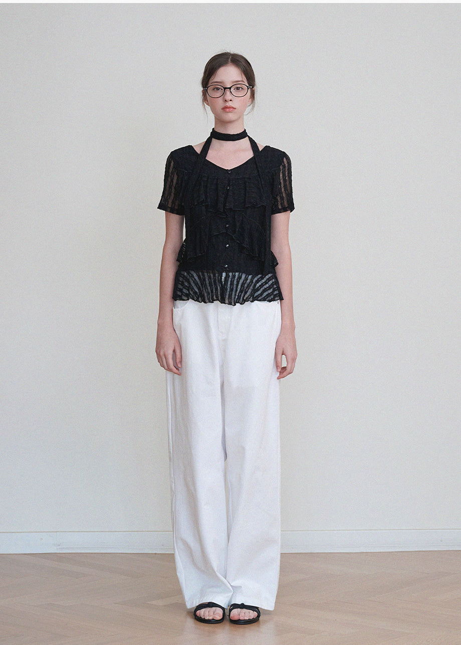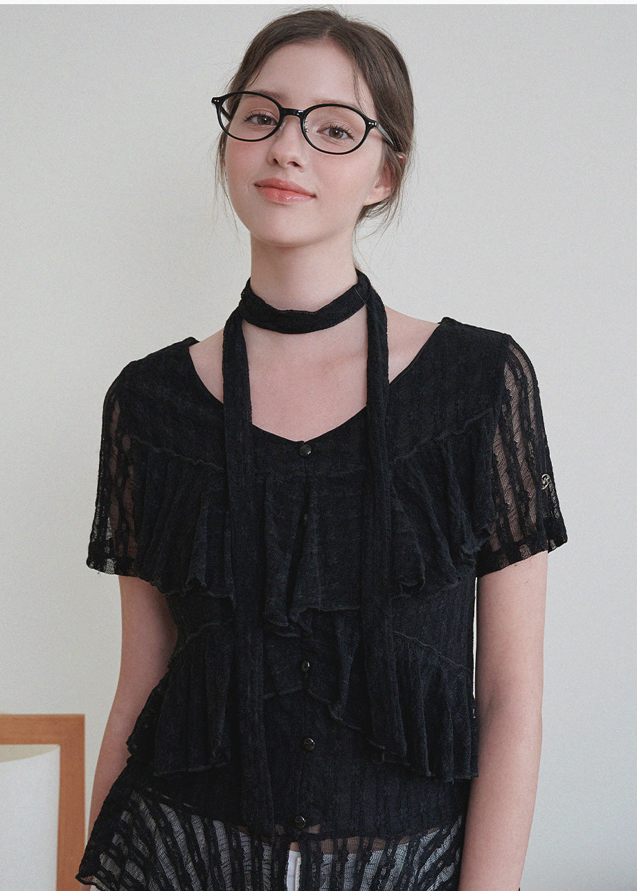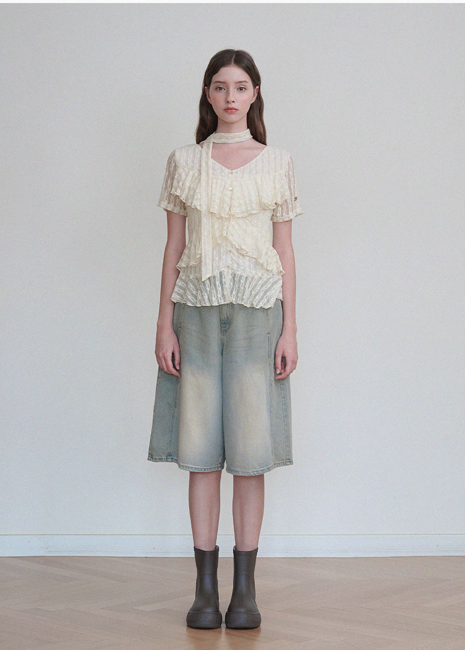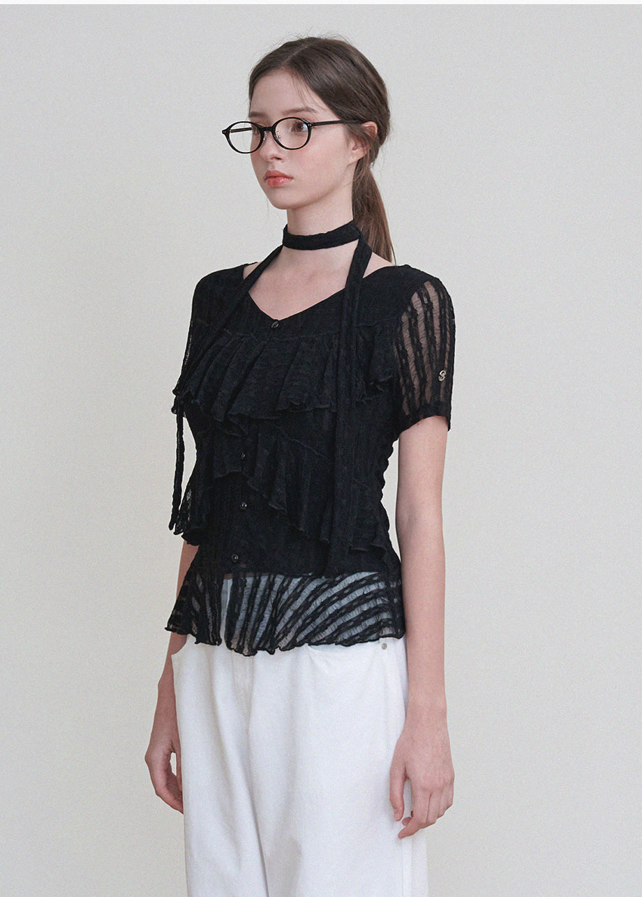 ヴィンテージ感のある半袖ブラウスです。Vネックデザインとスリムなフィット感でスッキリとしたシルエットを演出します。全体に施されたラッフルディテールがポイントで、ヴィンテージとラブリーな雰囲気を同時に楽しめます。ネックにはタイがセットされており、シンプルになりすぎずコーデのアクセントになります。*装飾や特殊なデザインが施された製品のため、クリーニング専門店でのお手入れをおすすめいたします。