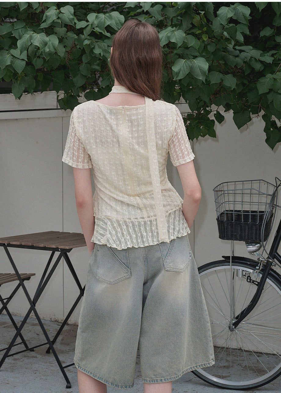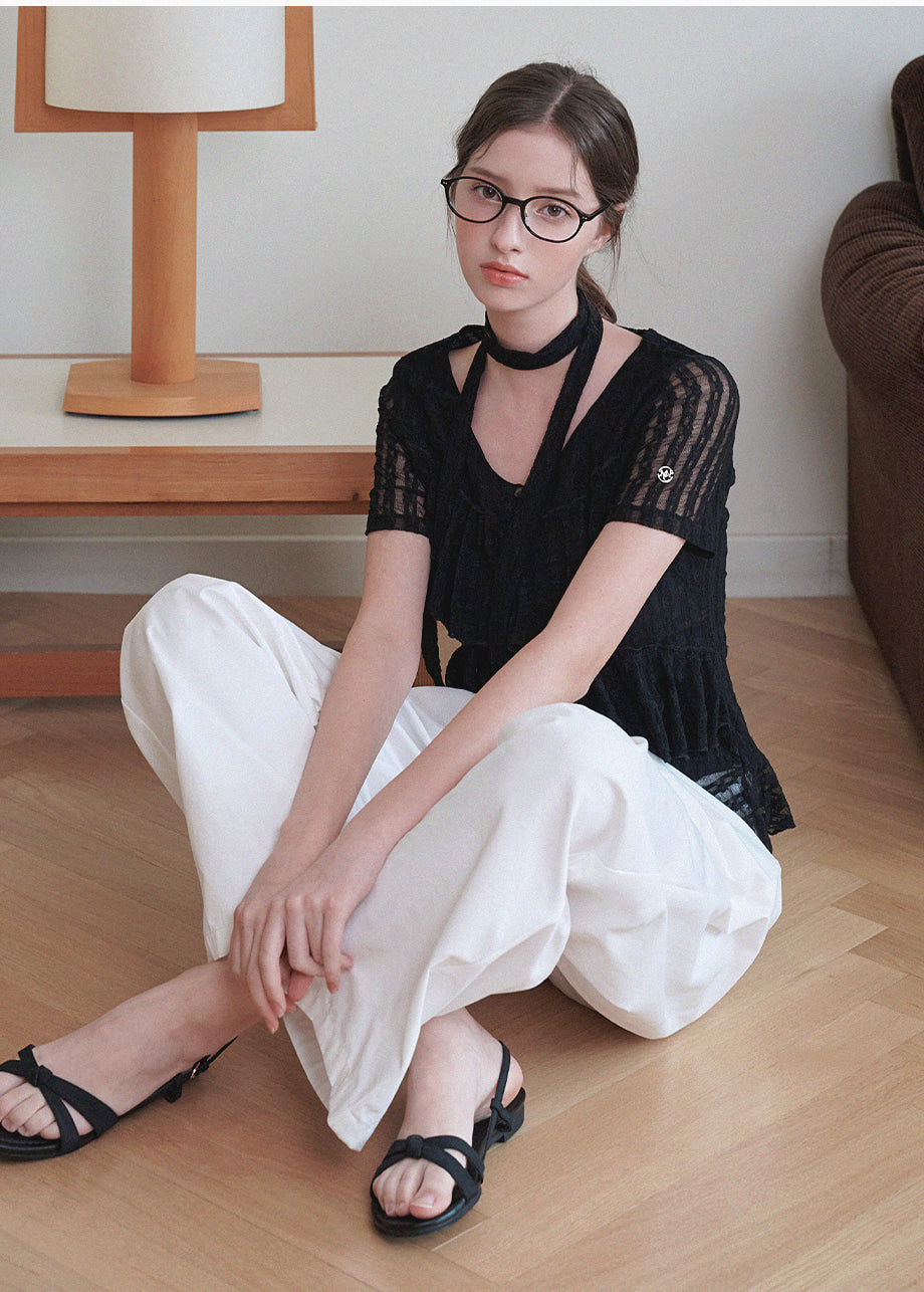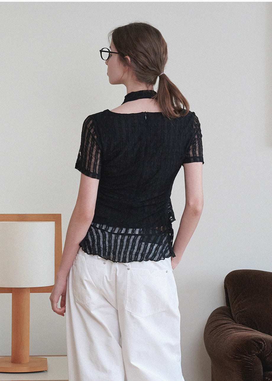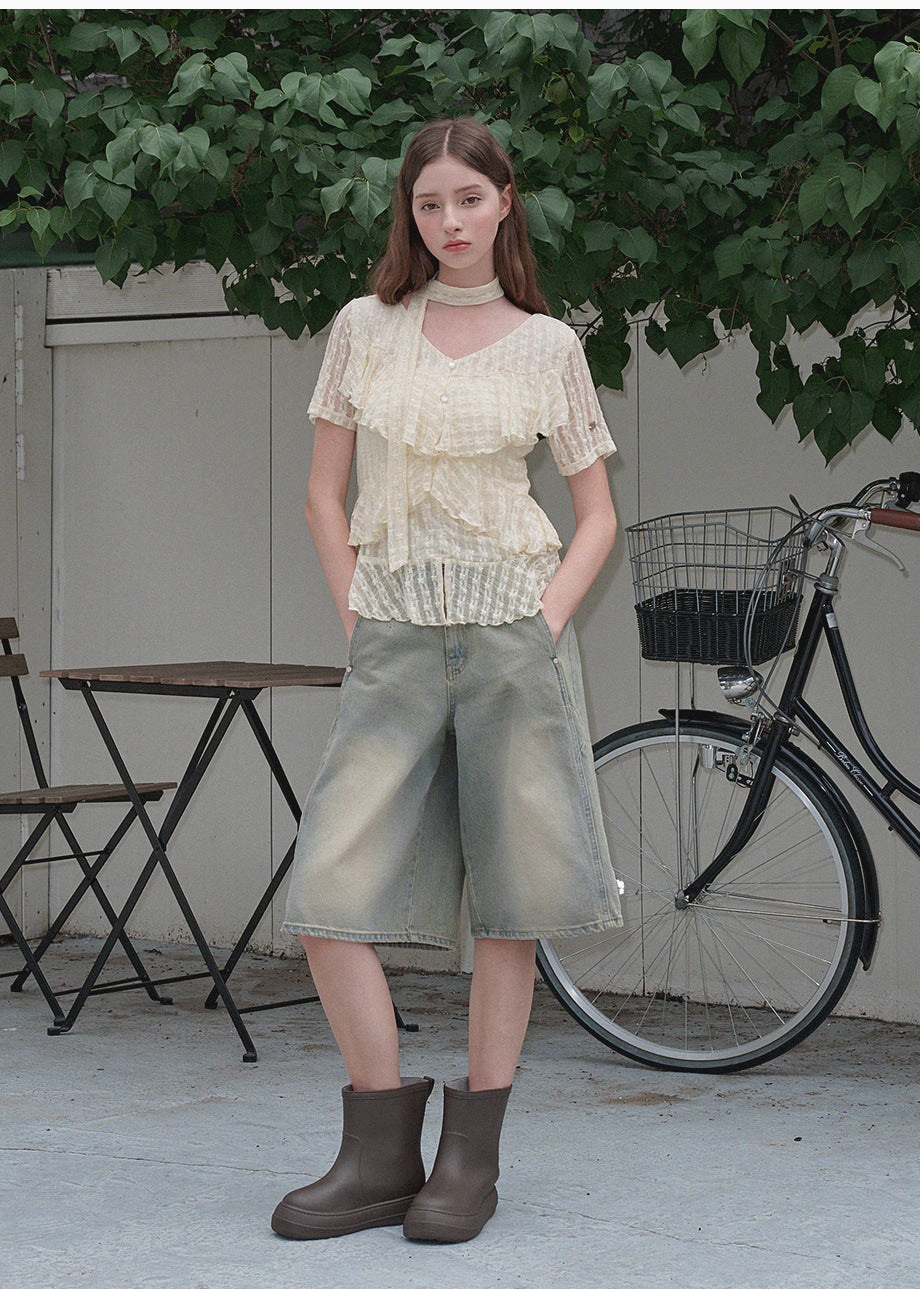 ヴィンテージ感のある半袖ブラウスです。Vネックデザインとスリムなフィット感でスッキリとしたシルエットを演出します。全体に施されたラッフルディテールがポイントで、ヴィンテージとラブリーな雰囲気を同時に楽しめます。ネックにはタイがセットされており、シンプルになりすぎずコーデのアクセントになります。*装飾や特殊なデザインが施された製品のため、クリーニング専門店でのお手入れをおすすめいたします。