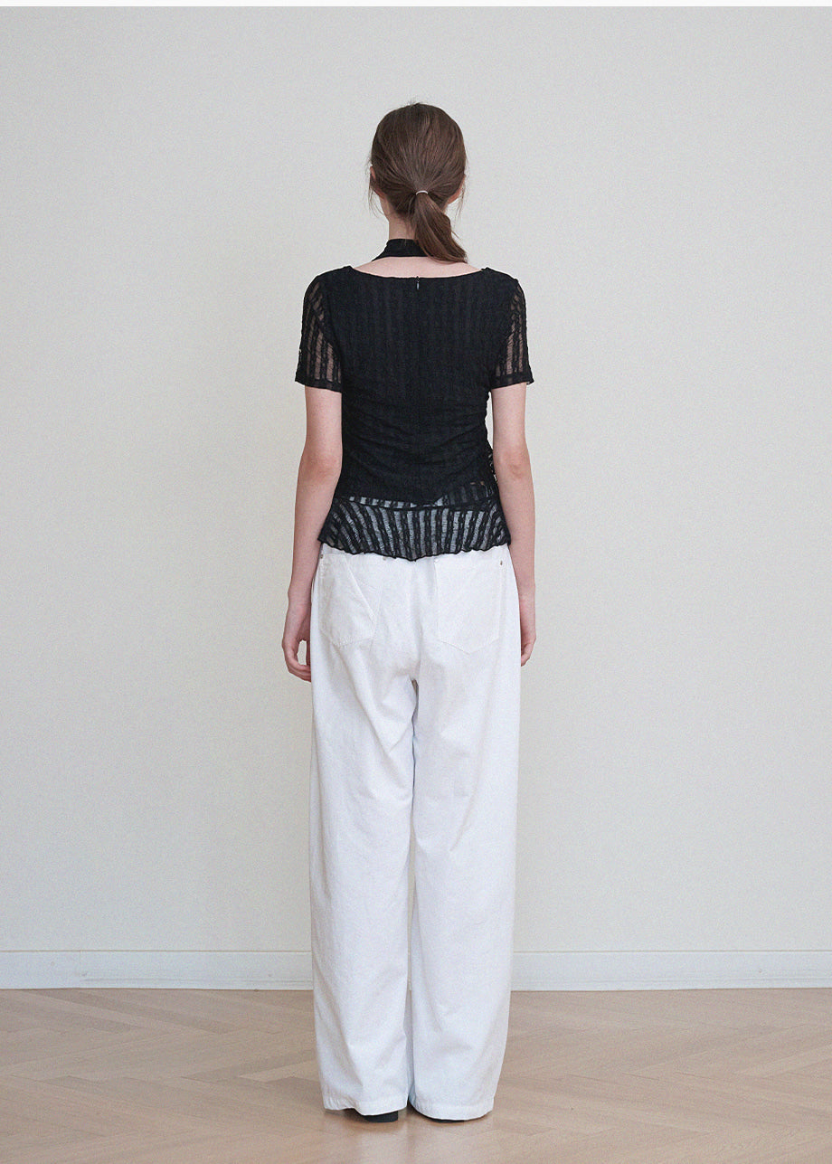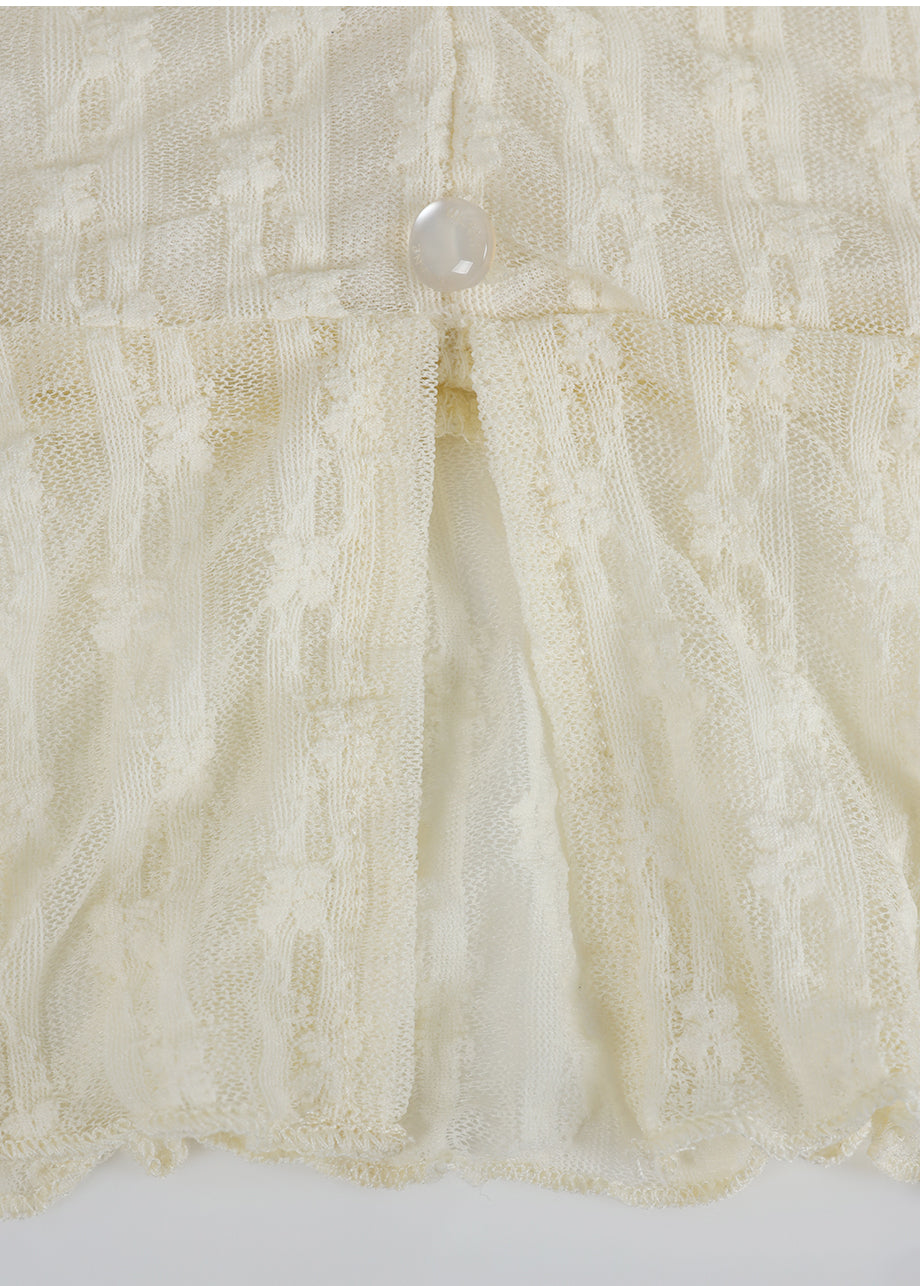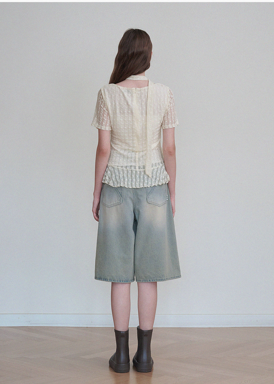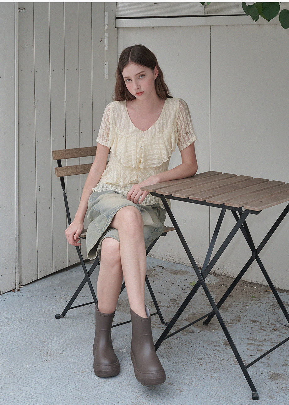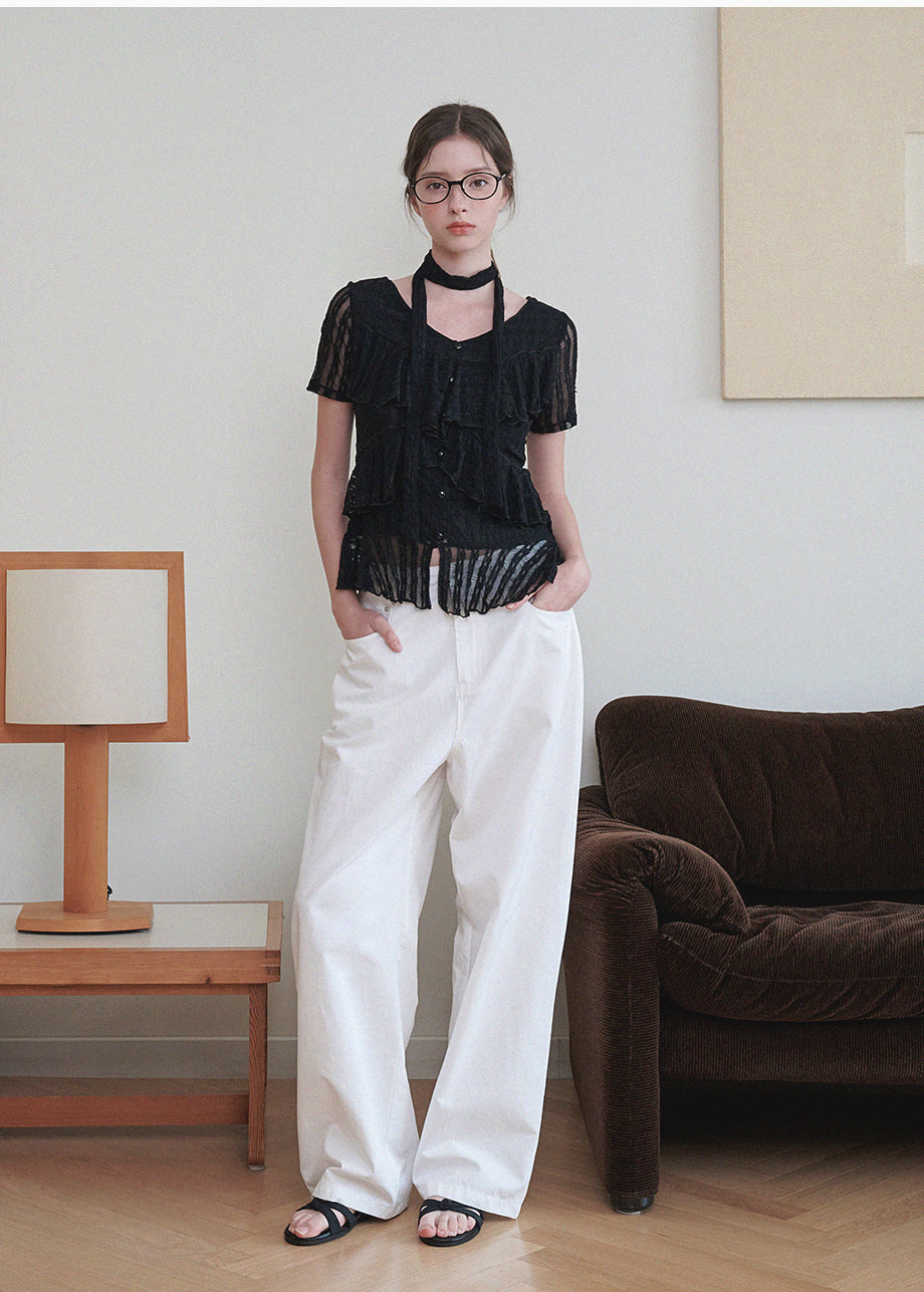 ヴィンテージ感のある半袖ブラウスです。Vネックデザインとスリムなフィット感でスッキリとしたシルエットを演出します。全体に施されたラッフルディテールがポイントで、ヴィンテージとラブリーな雰囲気を同時に楽しめます。ネックにはタイがセットされており、シンプルになりすぎずコーデのアクセントになります。*装飾や特殊なデザインが施された製品のため、クリーニング専門店でのお手入れをおすすめいたします。