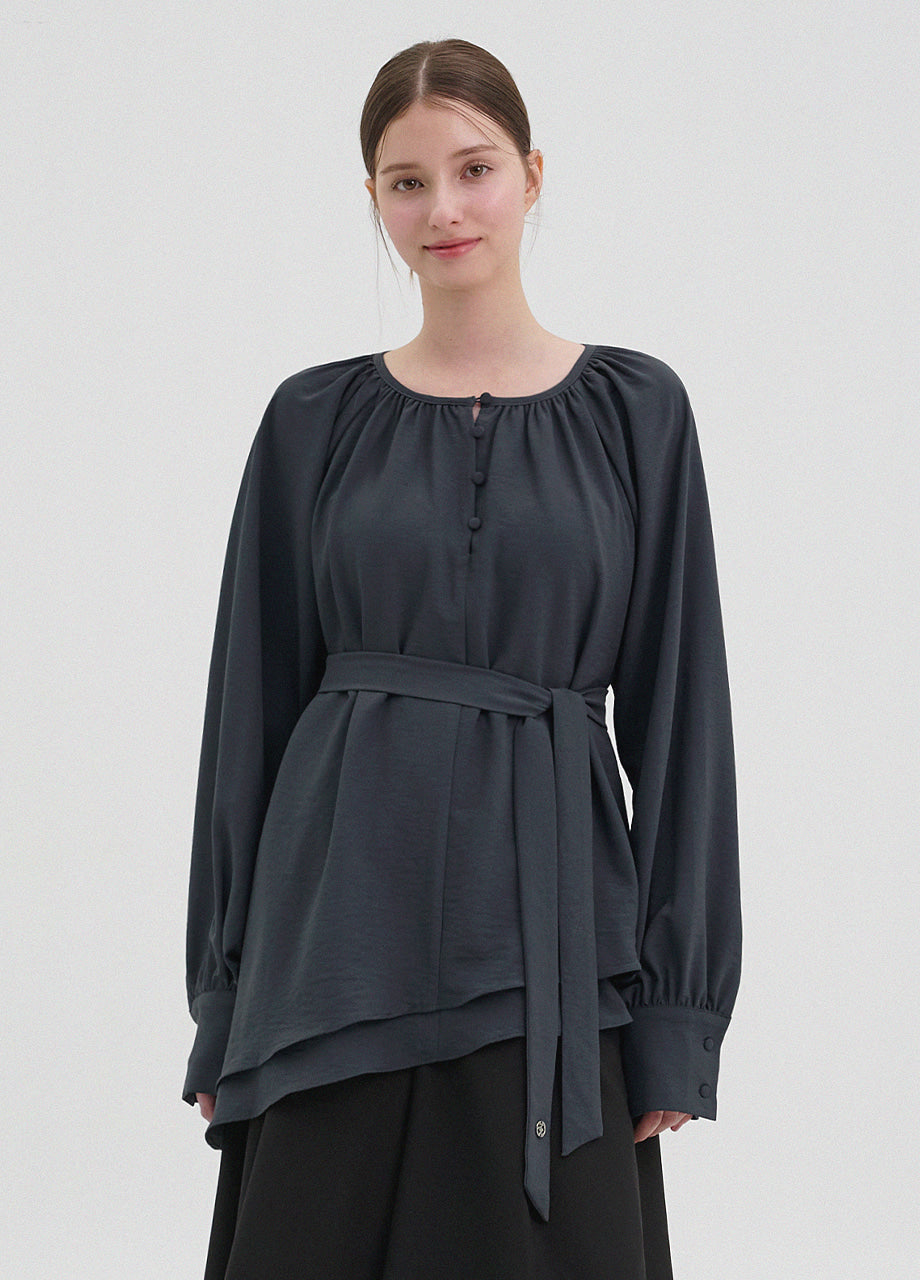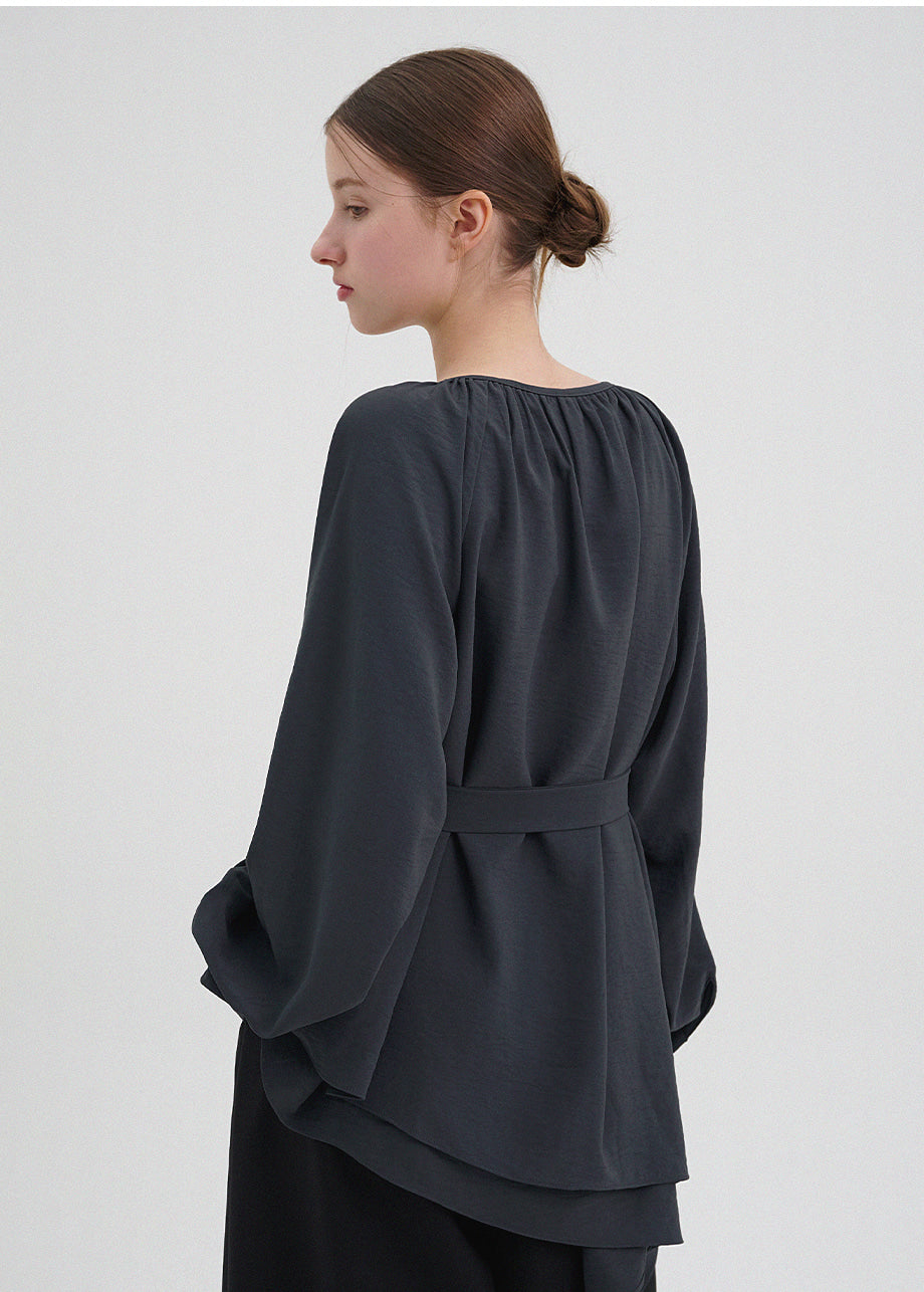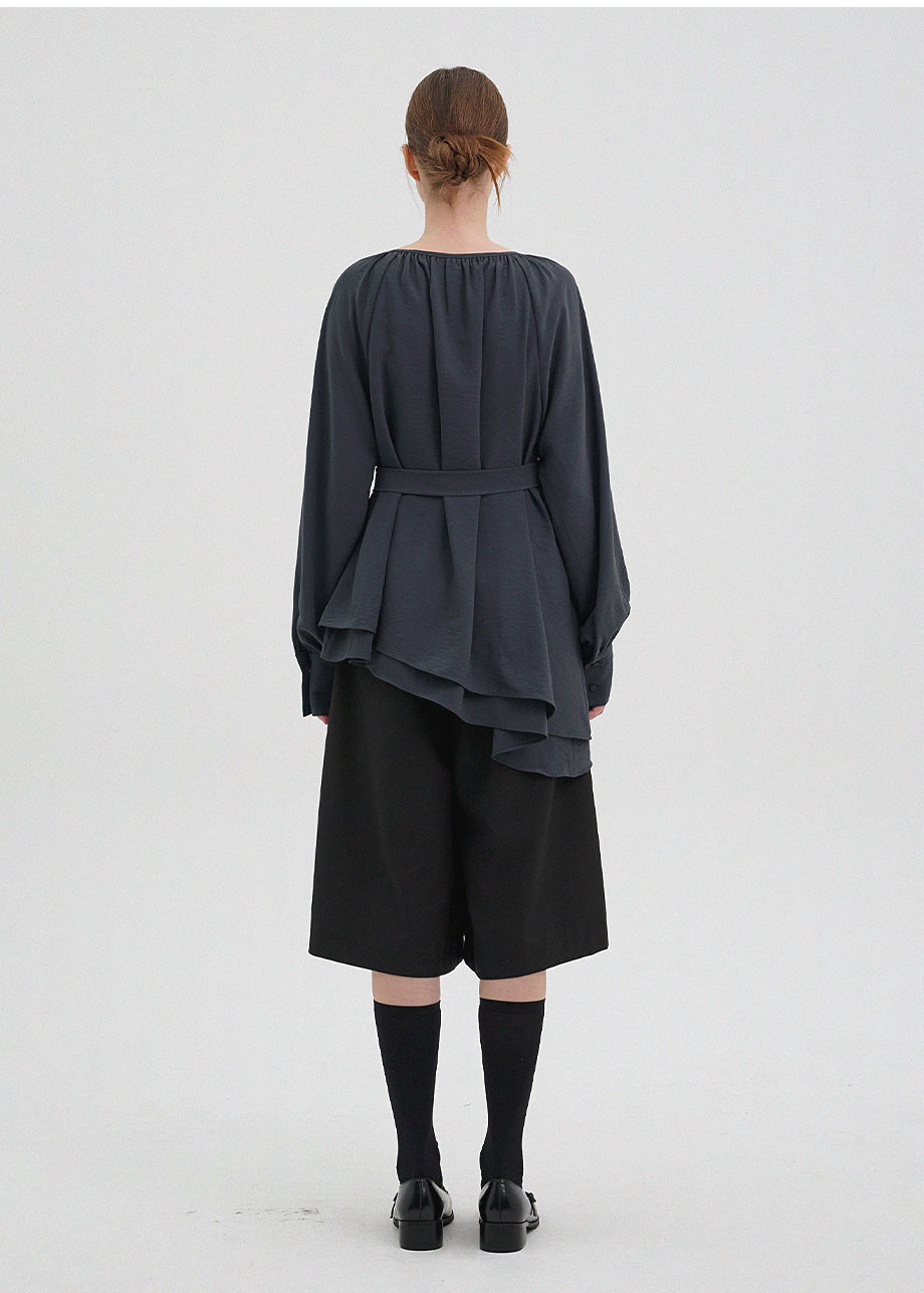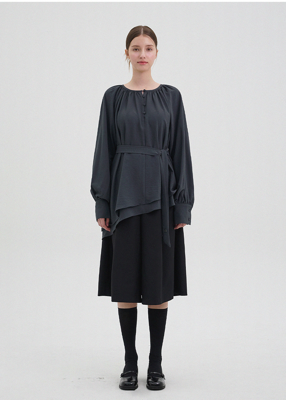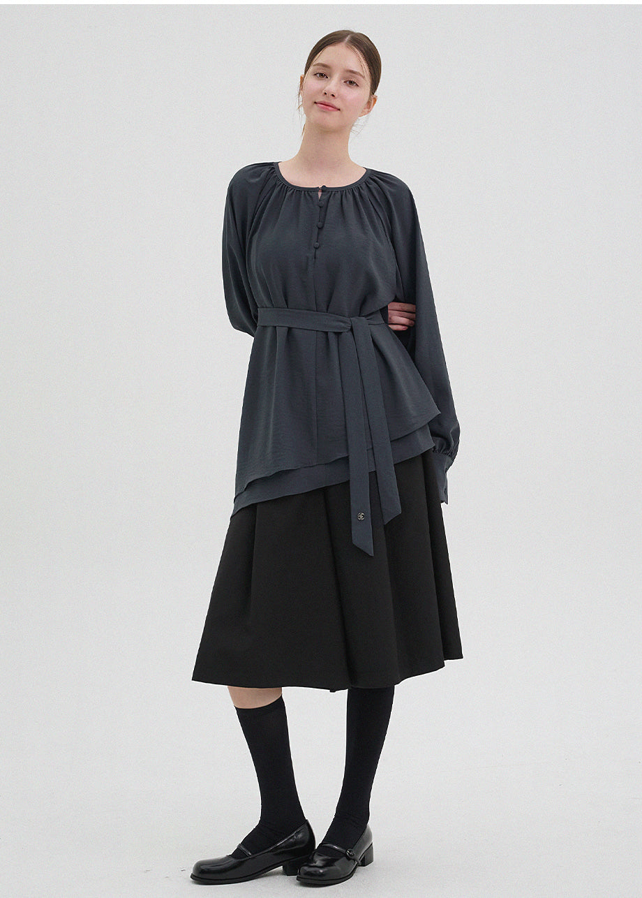 フェミニンムードのブラウス。やわらかな肌触りと高い耐久性を兼ね備えた生地を使用し、軽やかで快適な着心地を実現。ラウンドネックとルーズフィットでリラックスして着られ、ヒップをカバーする丈感にティアードデザインを重ね、より女性らしいシルエットを演出します。同素材のストラップがセットになっており、タイやウエストベルトとしてアレンジ可能。ストラップの先端にはペンダント装飾をあしらい、ディテールにもこだわりました。*装飾が施された製品のため、クリーニング専門店でのお手入れをおすすめいたします。