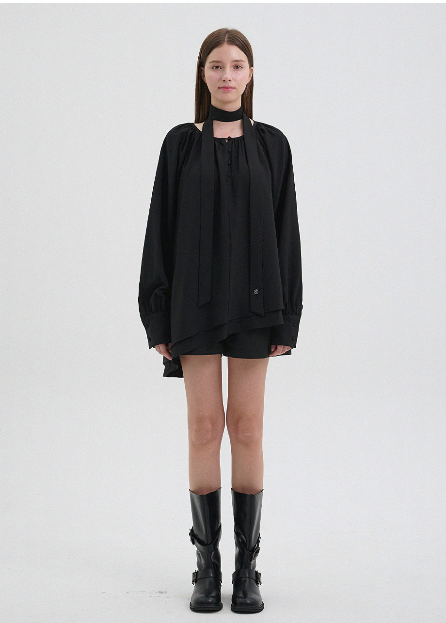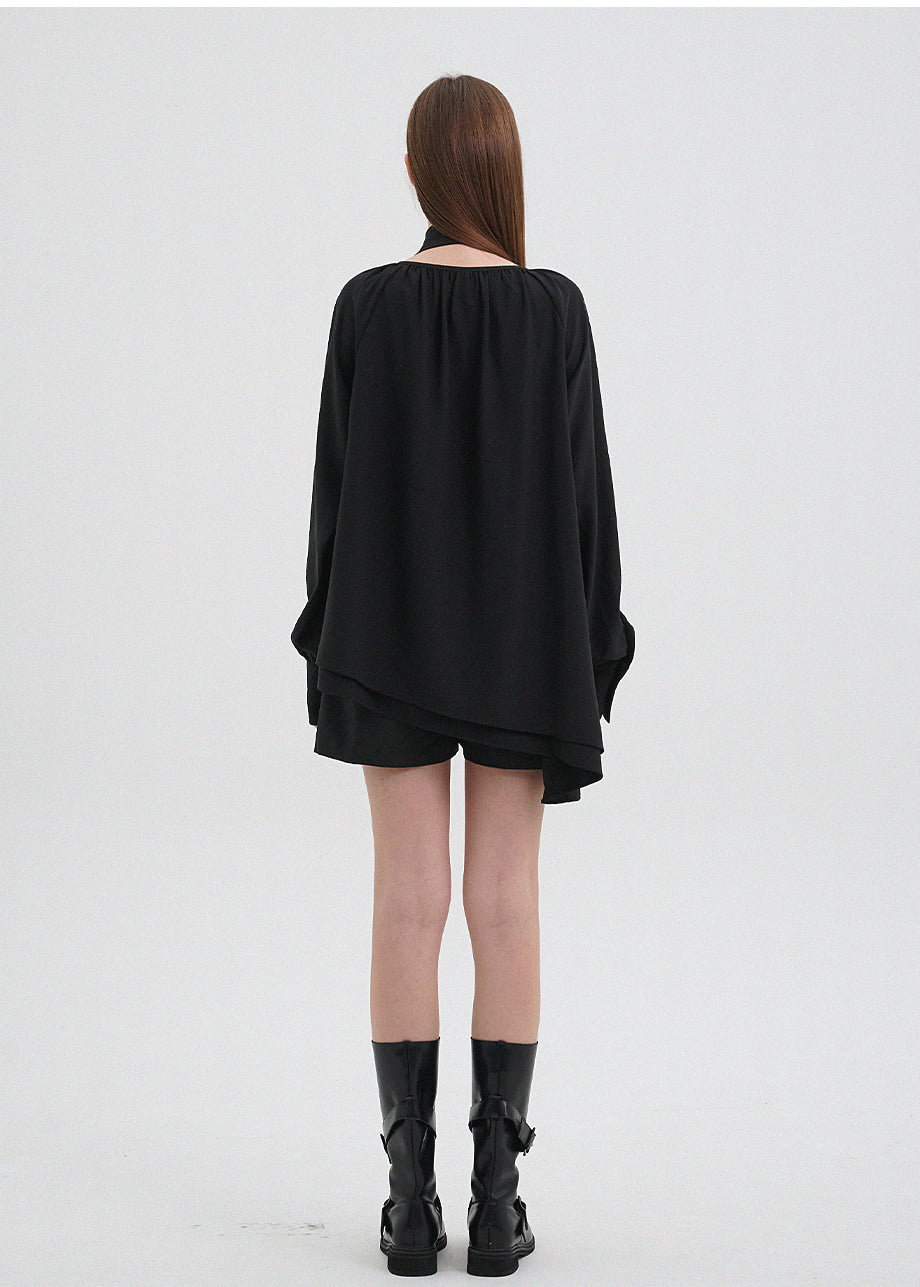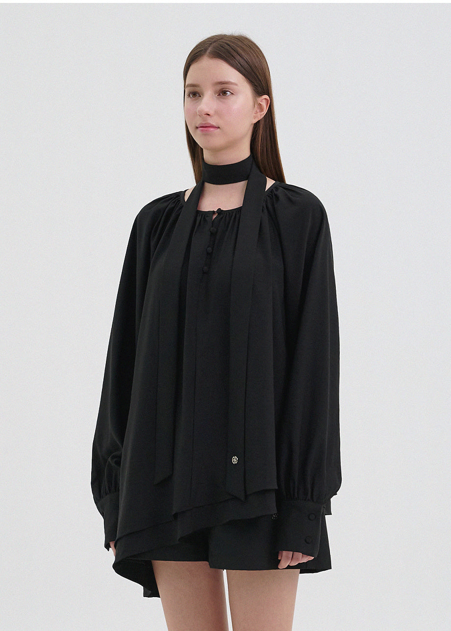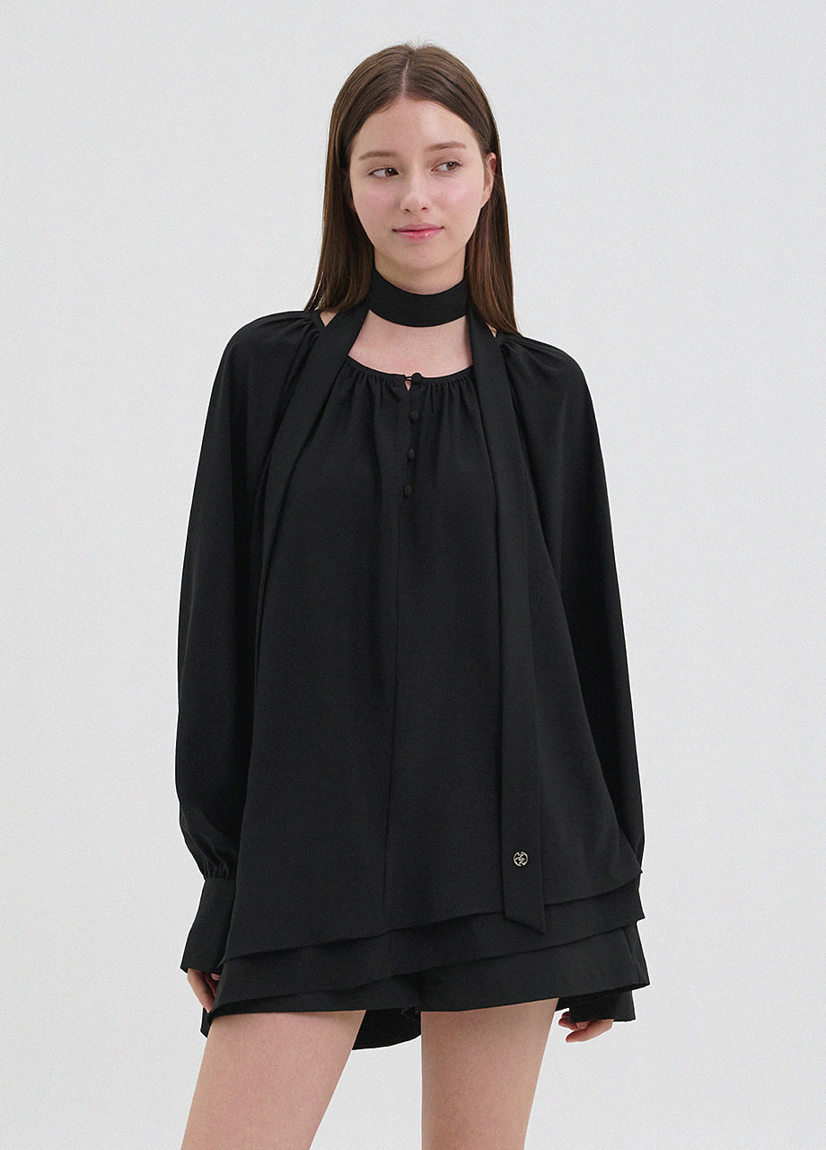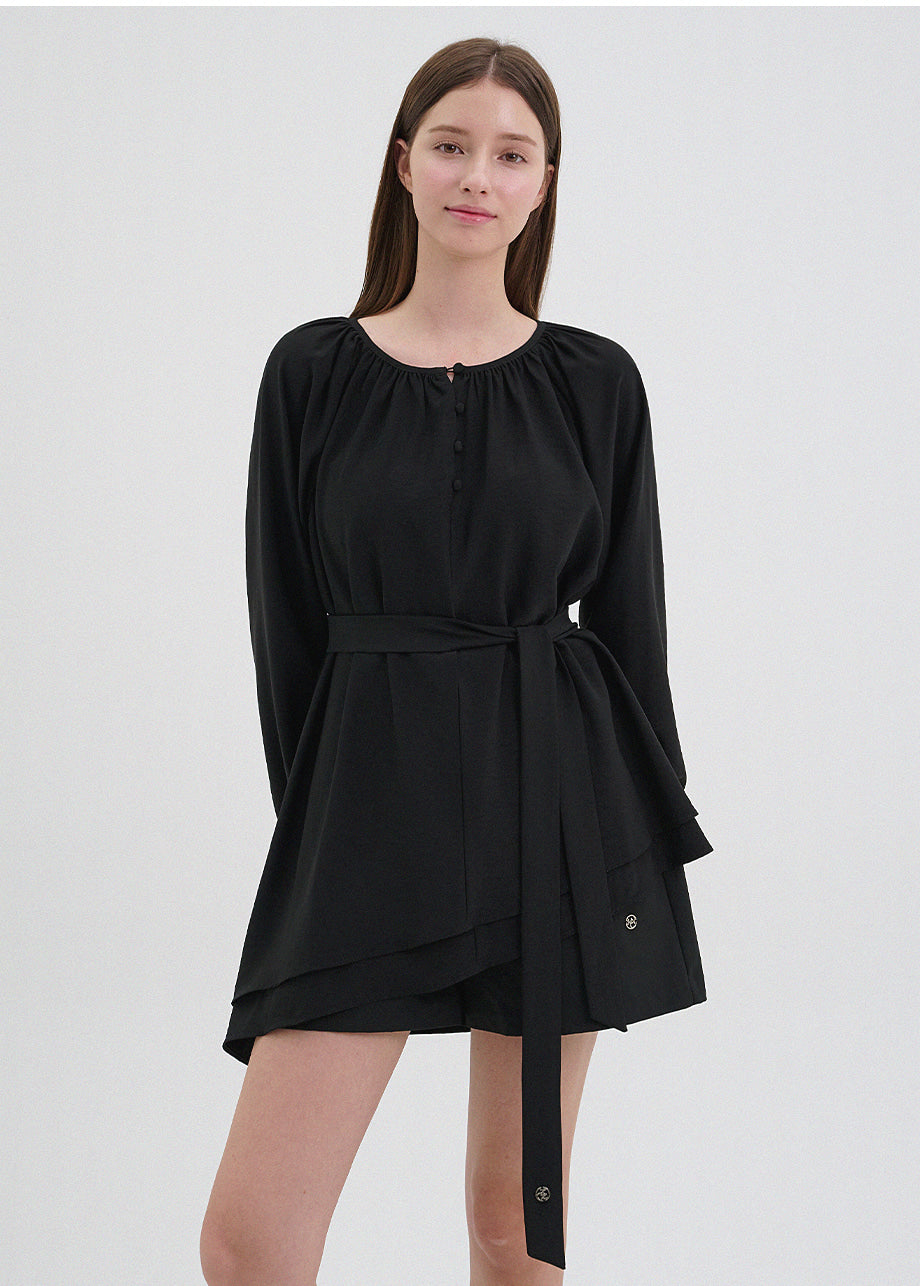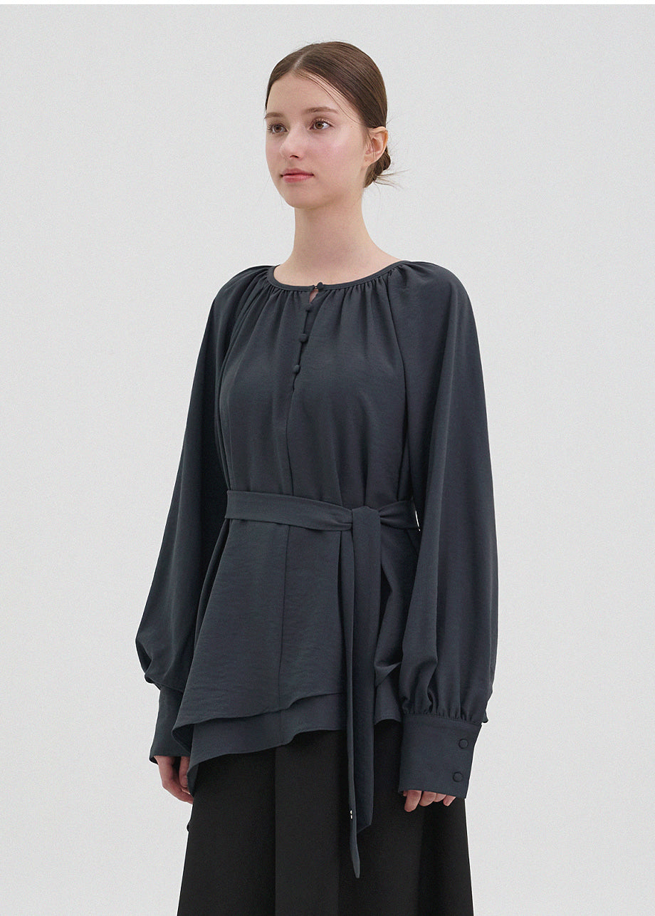 フェミニンムードのブラウス。やわらかな肌触りと高い耐久性を兼ね備えた生地を使用し、軽やかで快適な着心地を実現。ラウンドネックとルーズフィットでリラックスして着られ、ヒップをカバーする丈感にティアードデザインを重ね、より女性らしいシルエットを演出します。同素材のストラップがセットになっており、タイやウエストベルトとしてアレンジ可能。ストラップの先端にはペンダント装飾をあしらい、ディテールにもこだわりました。*装飾が施された製品のため、クリーニング専門店でのお手入れをおすすめいたします。