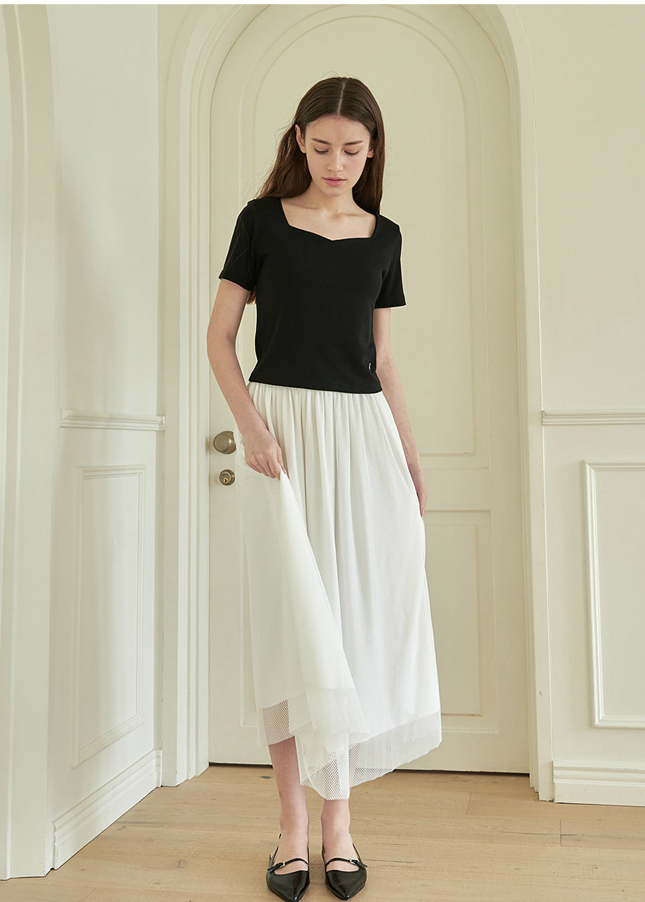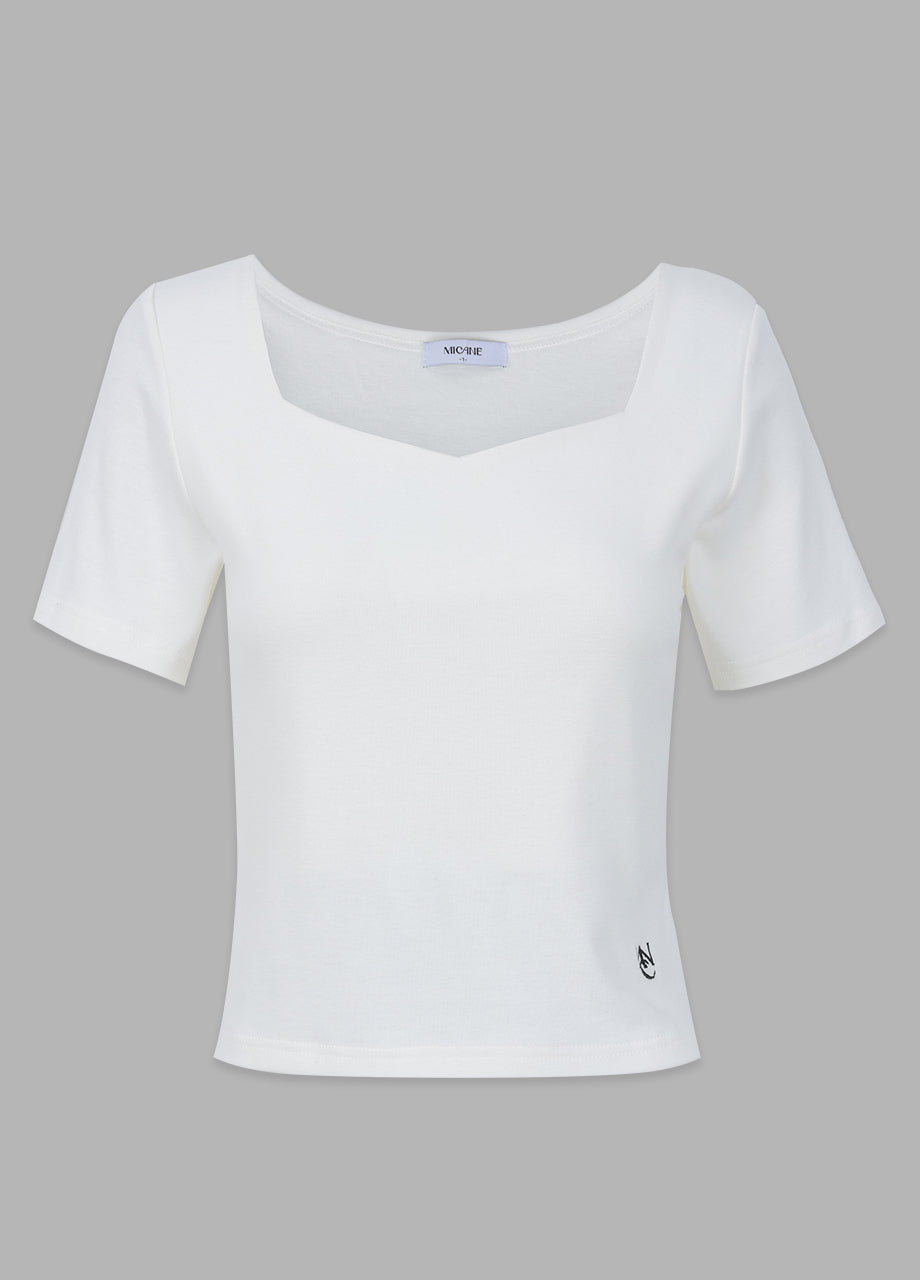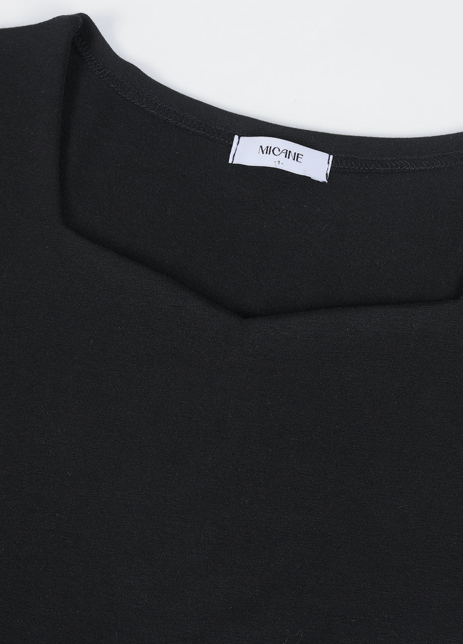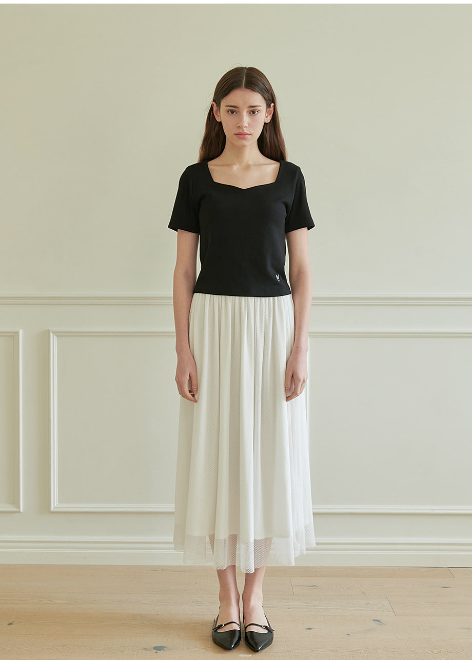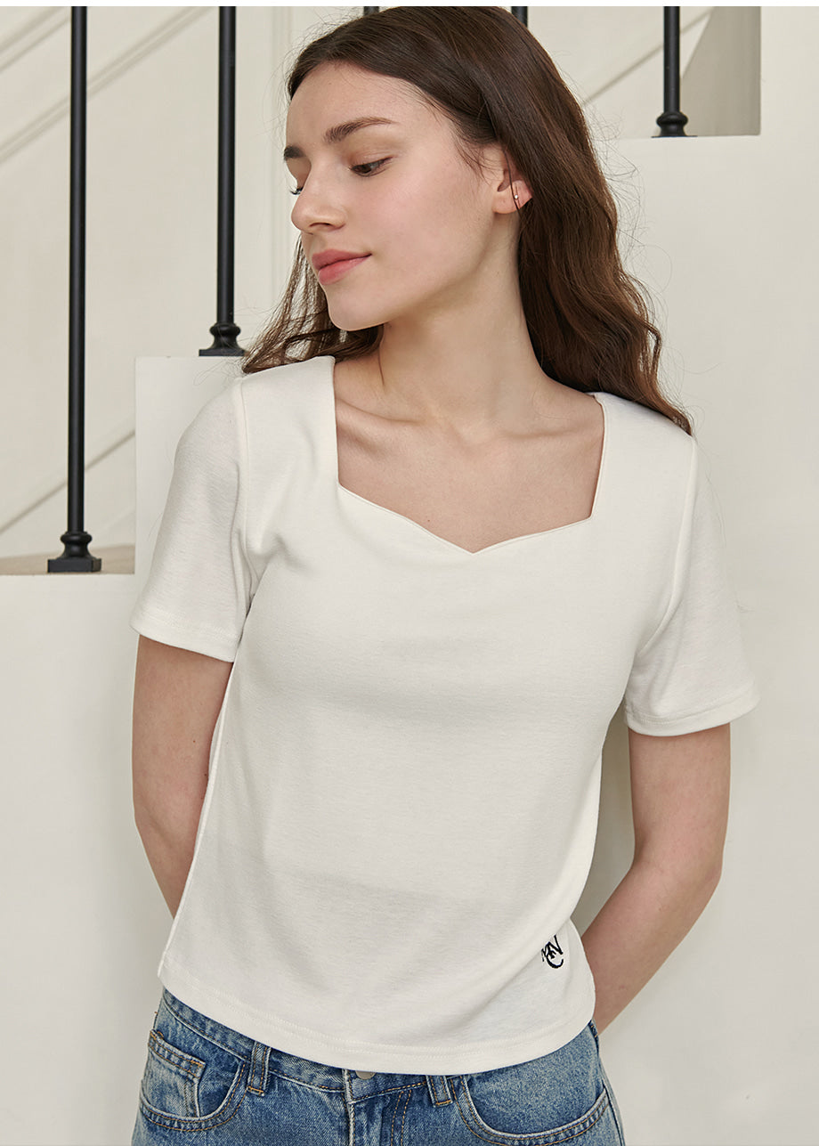 柔らかな素材感で肌への刺激を気にせず着用できる一枚です。スクエアネックにハートラインのポイントで、スリムでフェミニンなムードを演出します。