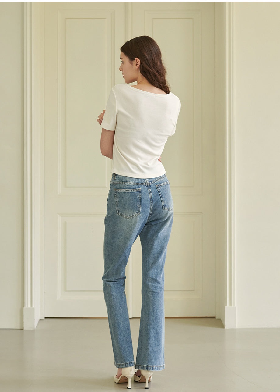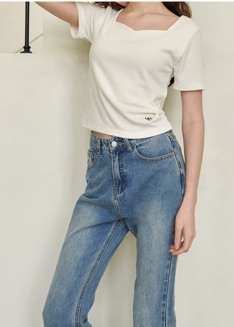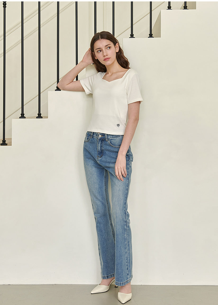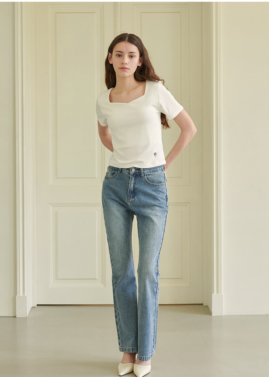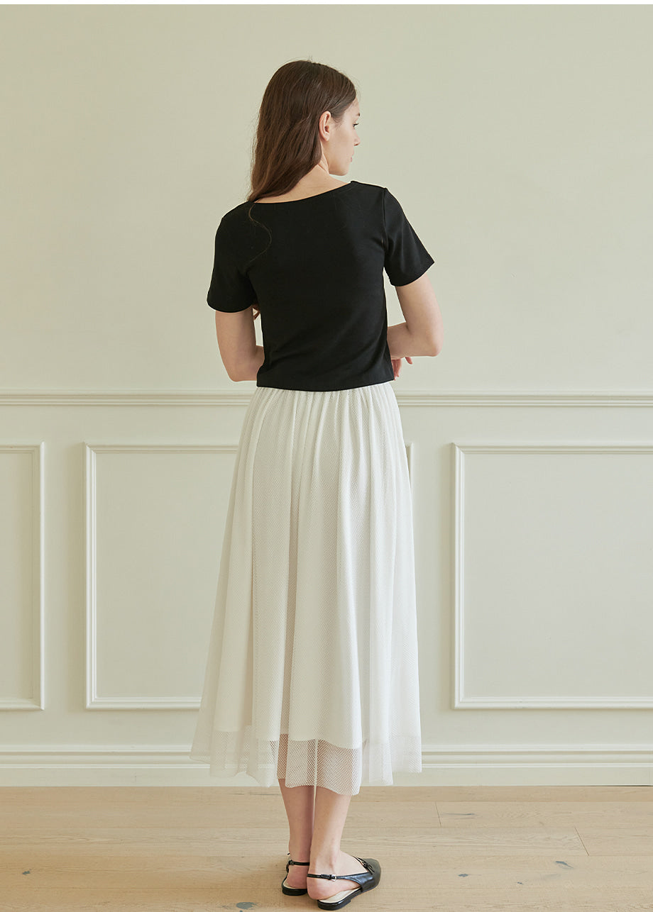 柔らかな素材感で肌への刺激を気にせず着用できる一枚です。スクエアネックにハートラインのポイントで、スリムでフェミニンなムードを演出します。