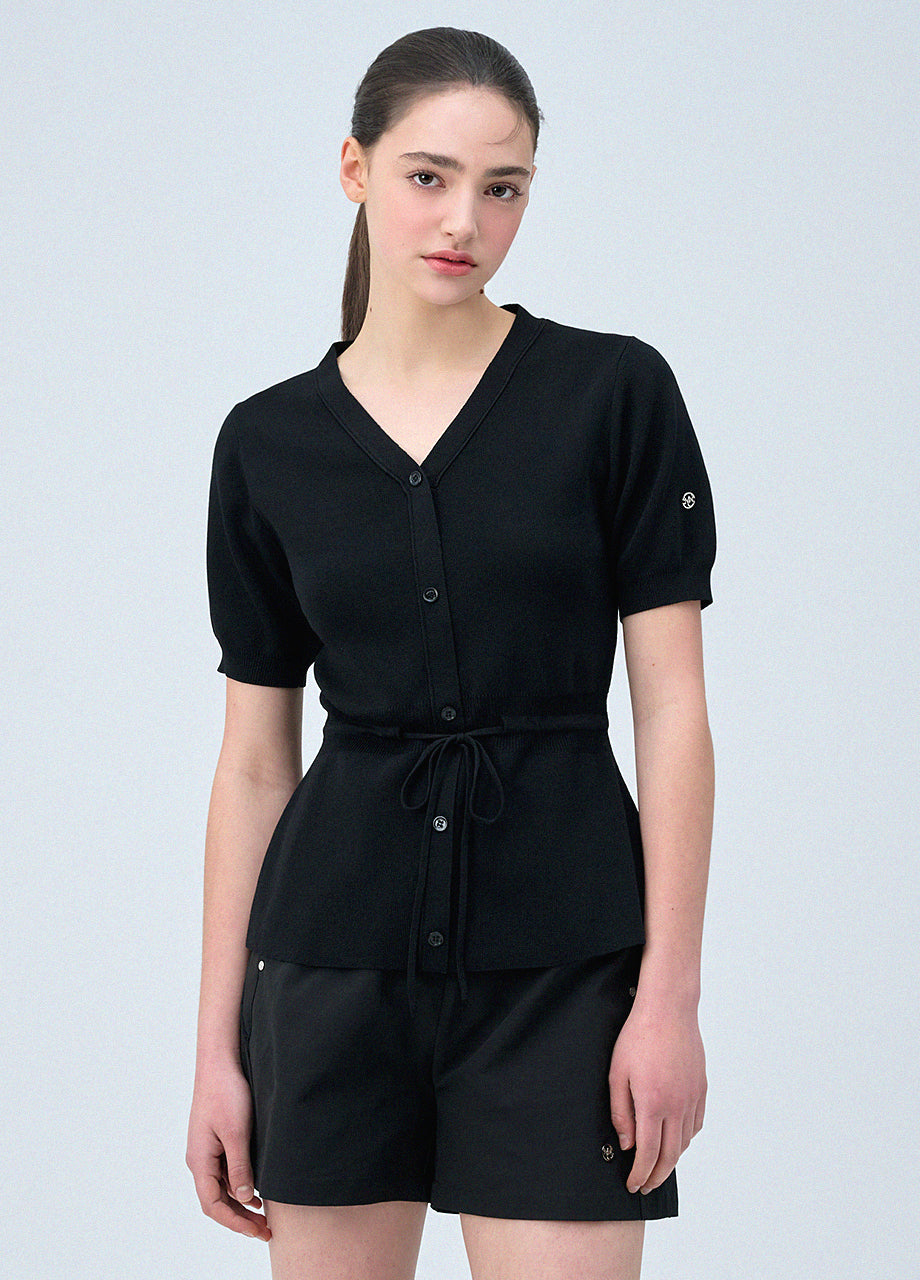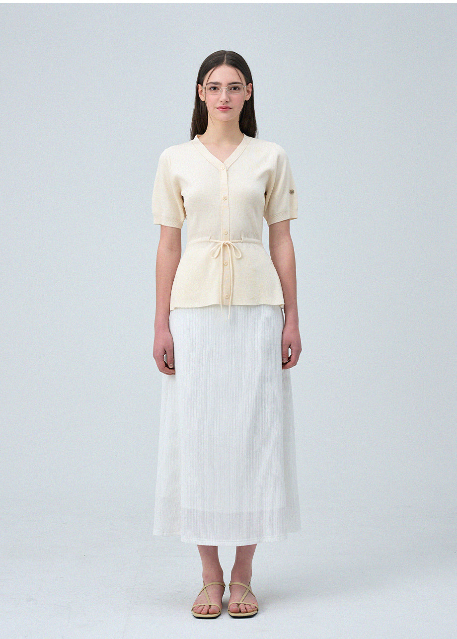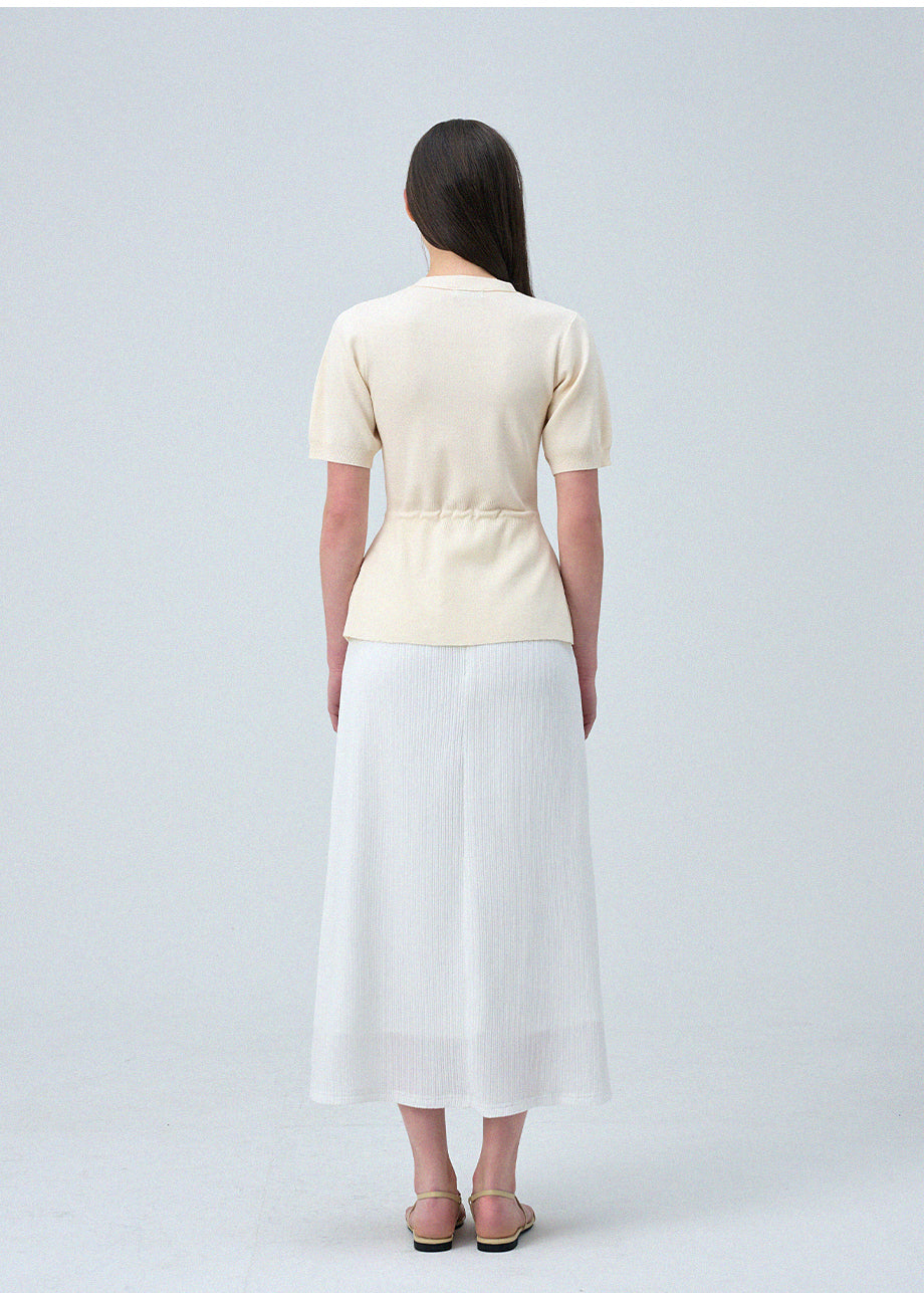 クラシックな感性のあるニットです。Vネックデザインにヒップを覆う丈感で気軽に着用できます。調整可能なウエストストリング入りのフレアシルエットが、体型カバーとスリムなラインを演出します。*装飾が施された製品のため、クリーニング専門店でのお手入れをおすすめいたします。