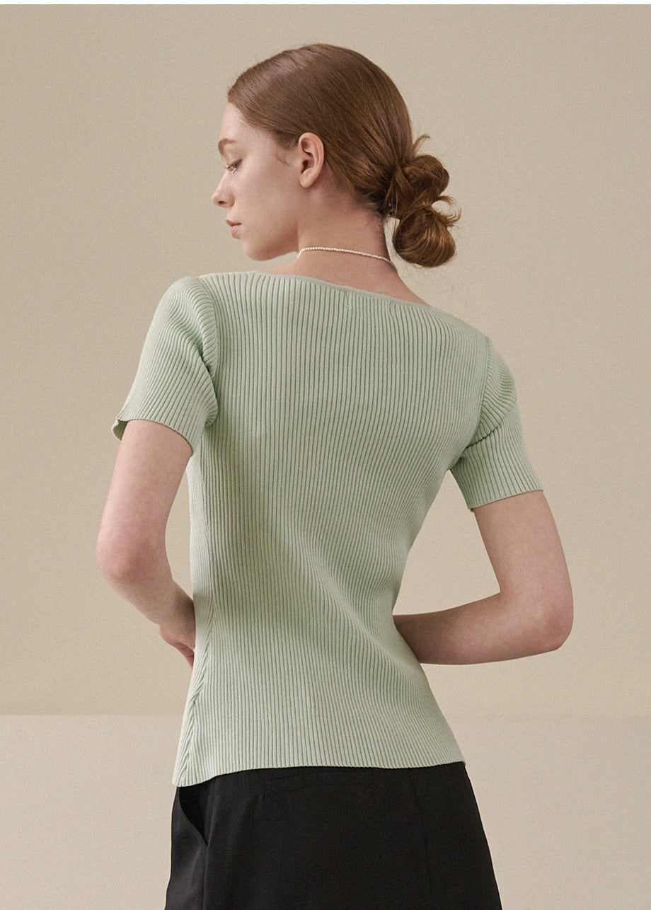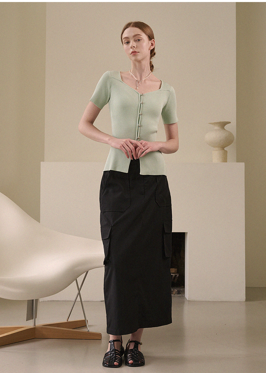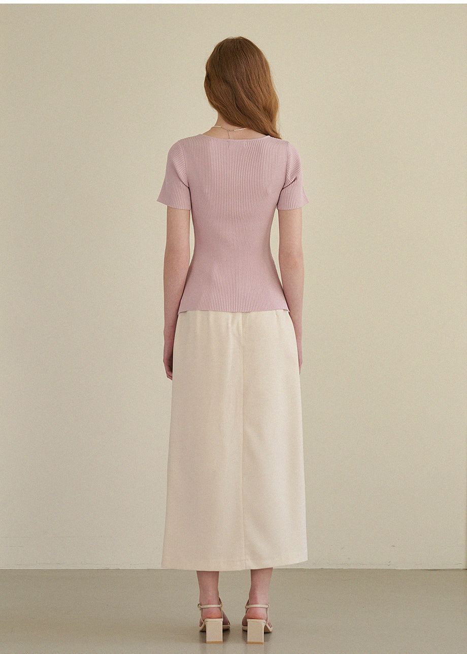 フェミニンでデイリーなムードのニットです。スクエアハートネックラインが華奢さとラブリーさを演出し、デコルテと首元を美しく見せてくれます。