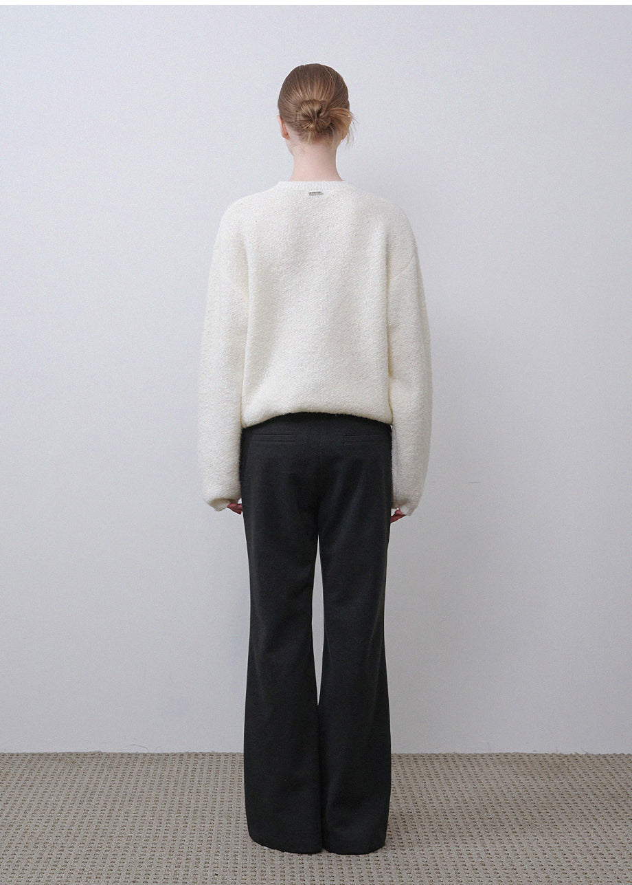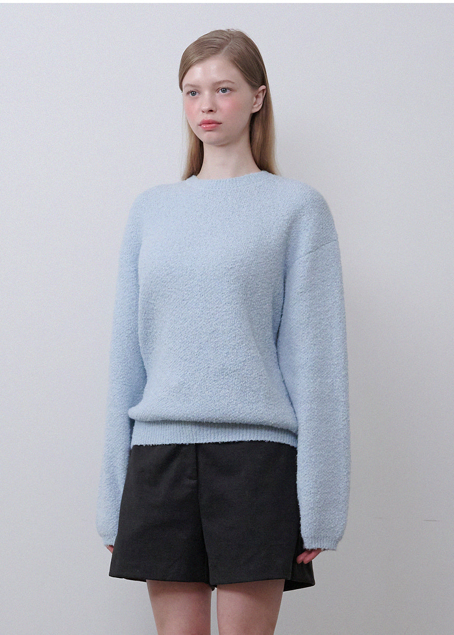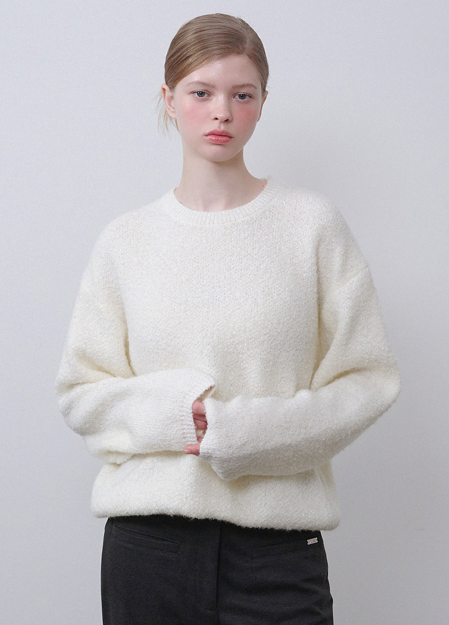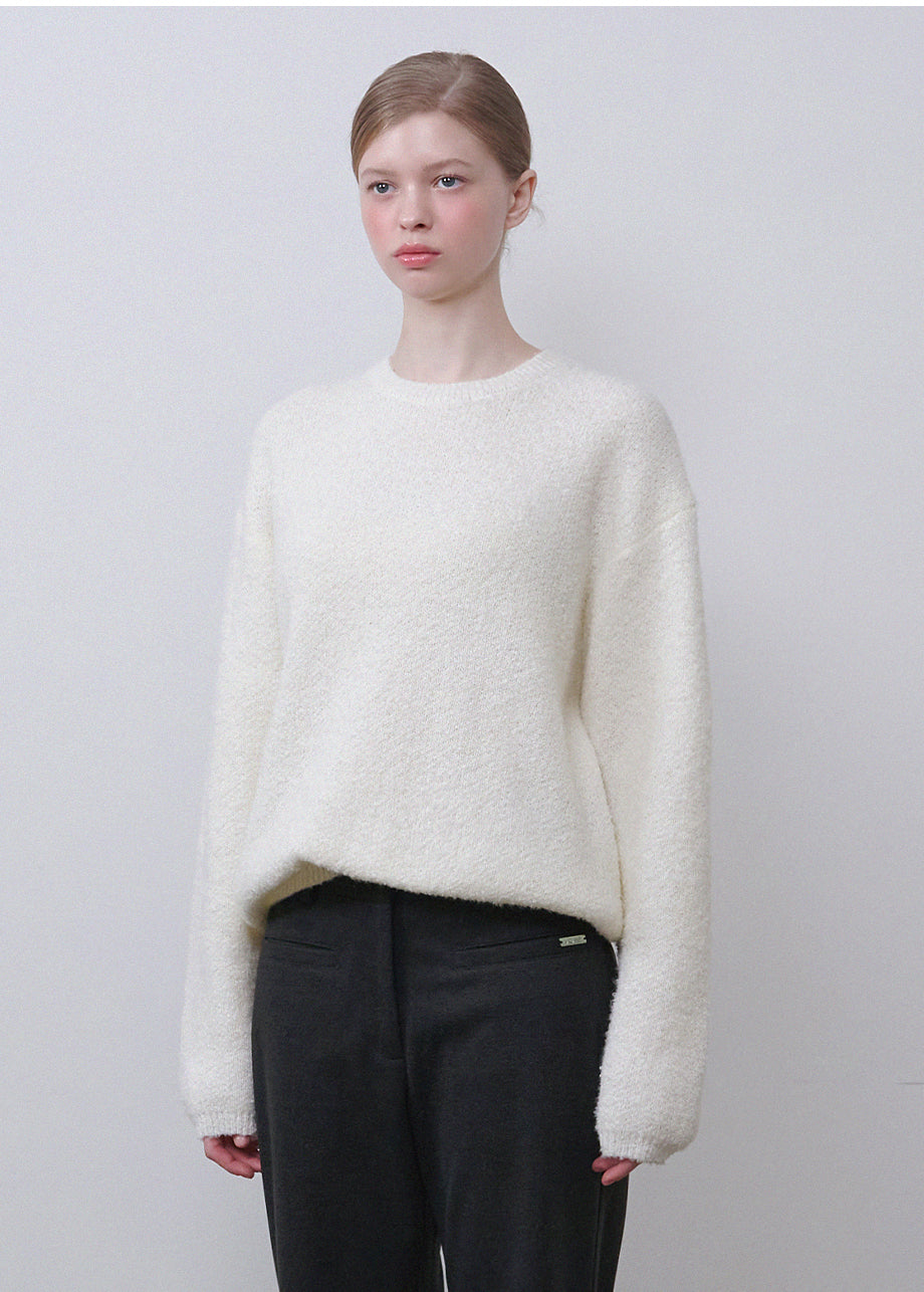 クラシックでカジュアルなムードのブークレニットです。柔らかなブークレテクスチャーの糸を使用しており、保温性に優れ快適な着心地が魅力です。適度なルーズフィットで様々なアイテムと組み合わせやすく、リブ部分の伸縮性が全体のシルエットを引き立てます。カジュアルなデザインで単品でもインナーとしても幅広く活用でき、後ろネック中央にはペンダント装飾を加え上品に仕上げました。*装飾や特殊な素材を使用した製品のため、クリーニング専門店でのお手入れをおすすめいたします。