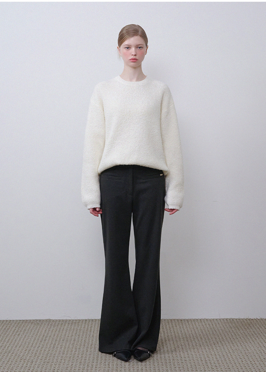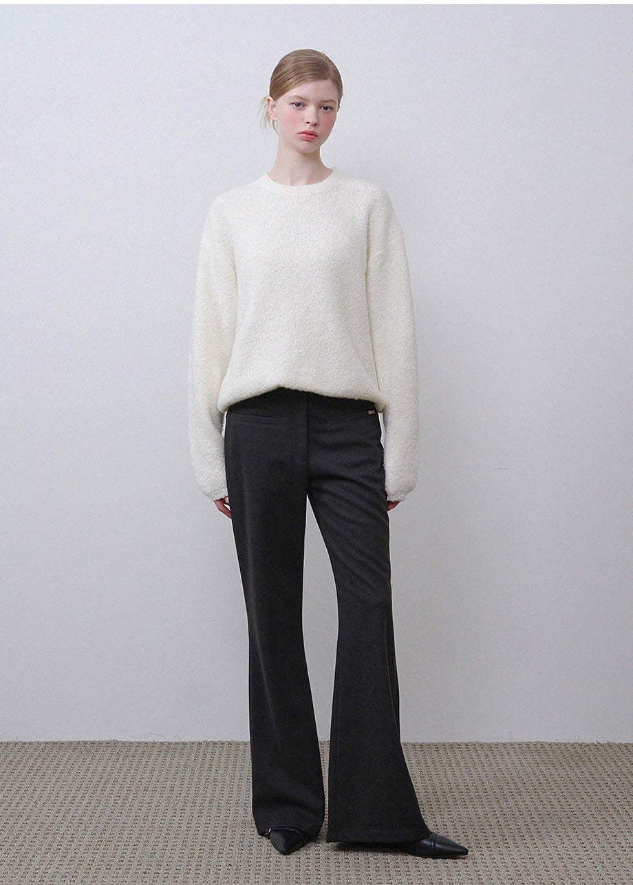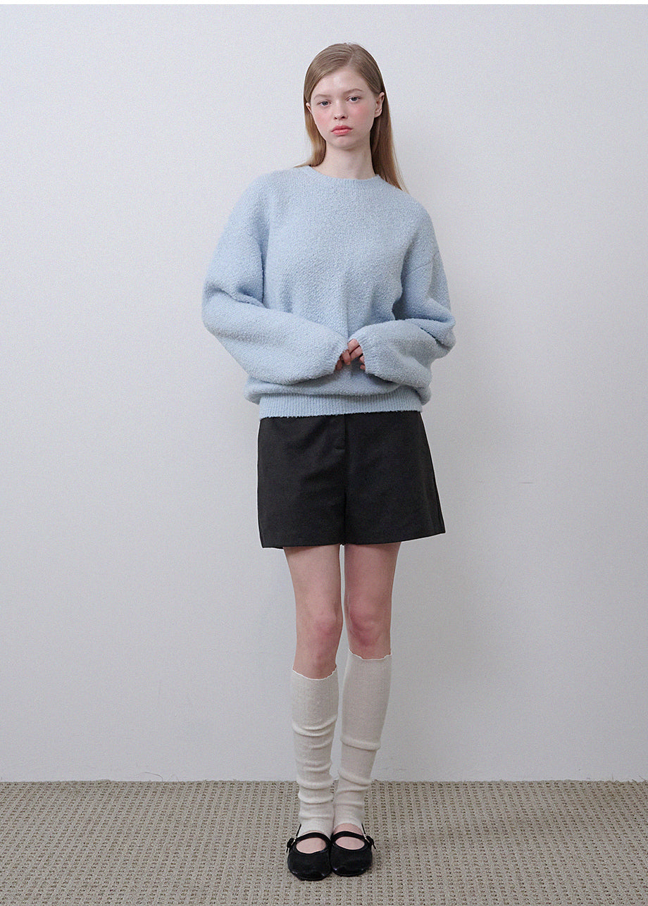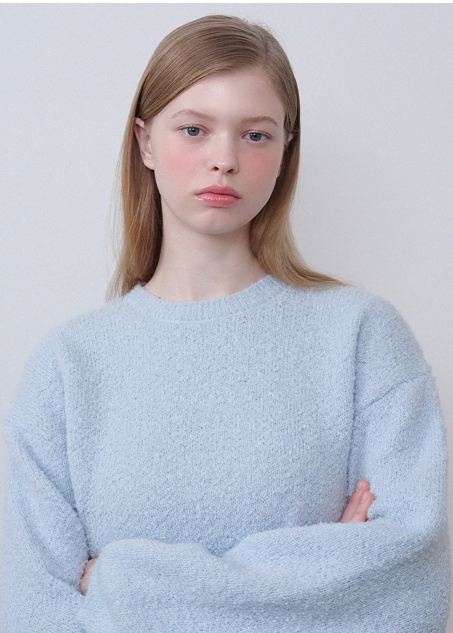 クラシックでカジュアルなムードのブークレニットです。柔らかなブークレテクスチャーの糸を使用しており、保温性に優れ快適な着心地が魅力です。適度なルーズフィットで様々なアイテムと組み合わせやすく、リブ部分の伸縮性が全体のシルエットを引き立てます。カジュアルなデザインで単品でもインナーとしても幅広く活用でき、後ろネック中央にはペンダント装飾を加え上品に仕上げました。*装飾や特殊な素材を使用した製品のため、クリーニング専門店でのお手入れをおすすめいたします。