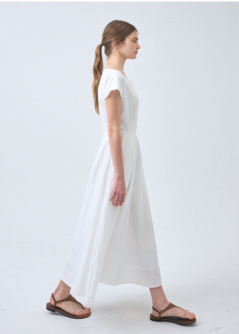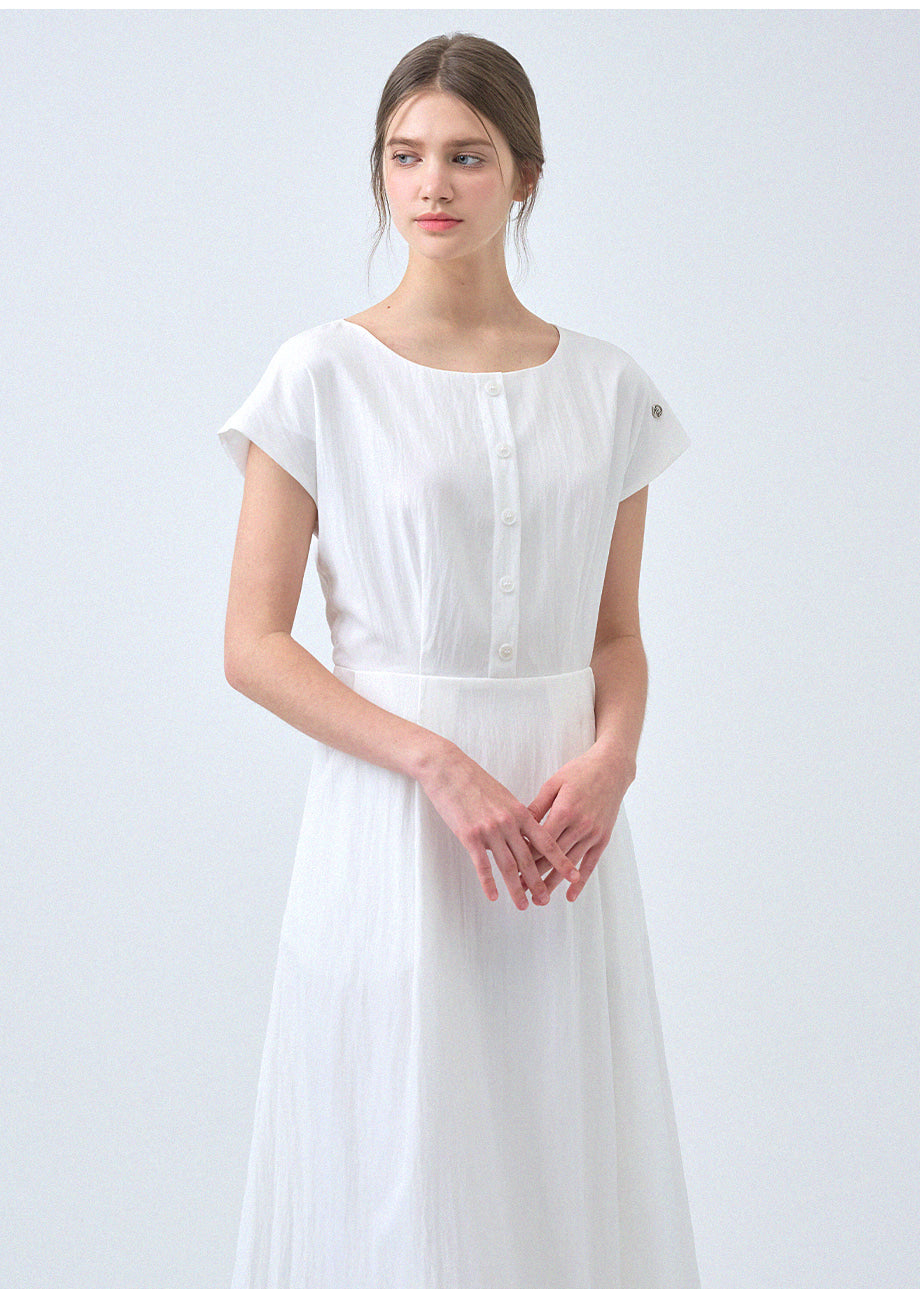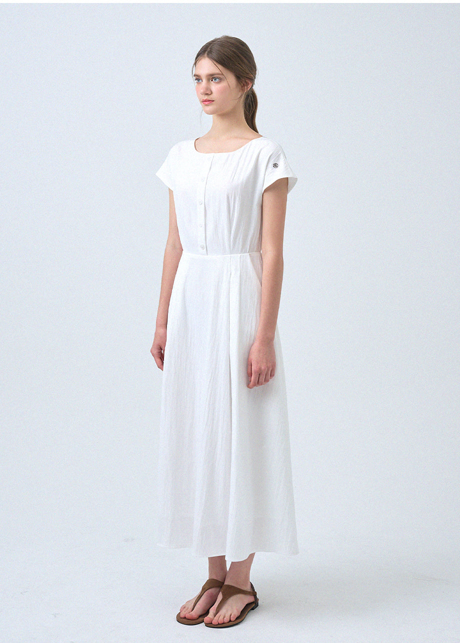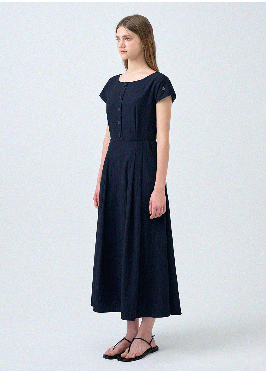クラシックな感性のあるロングワンピースです。カップスリーブのデザインと程よい丈感で気軽に着用でき、ワイドなボートネックがフェミニンなムードを演出します。*装飾が施された製品のため、クリーニング専門店でのお手入れをおすすめいたします。