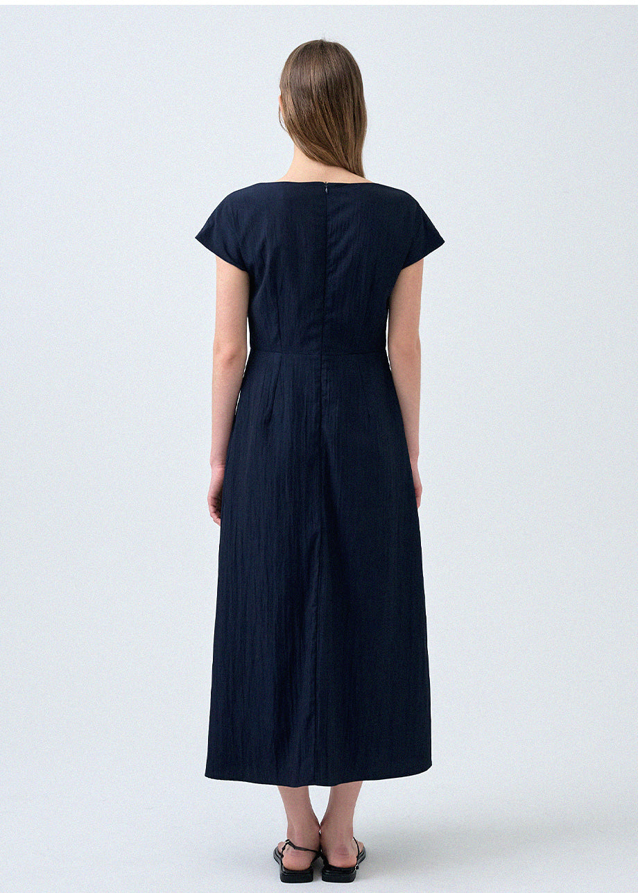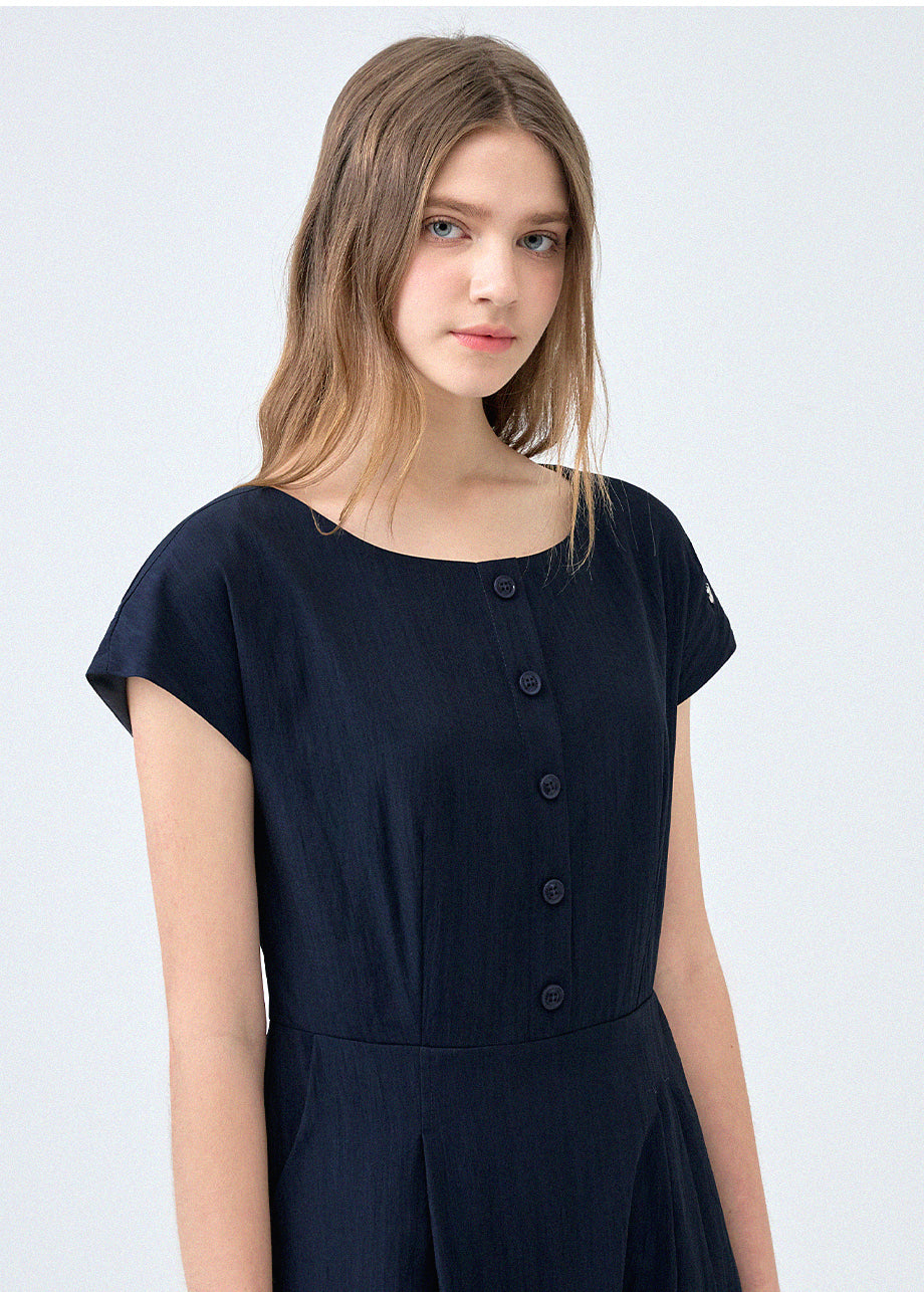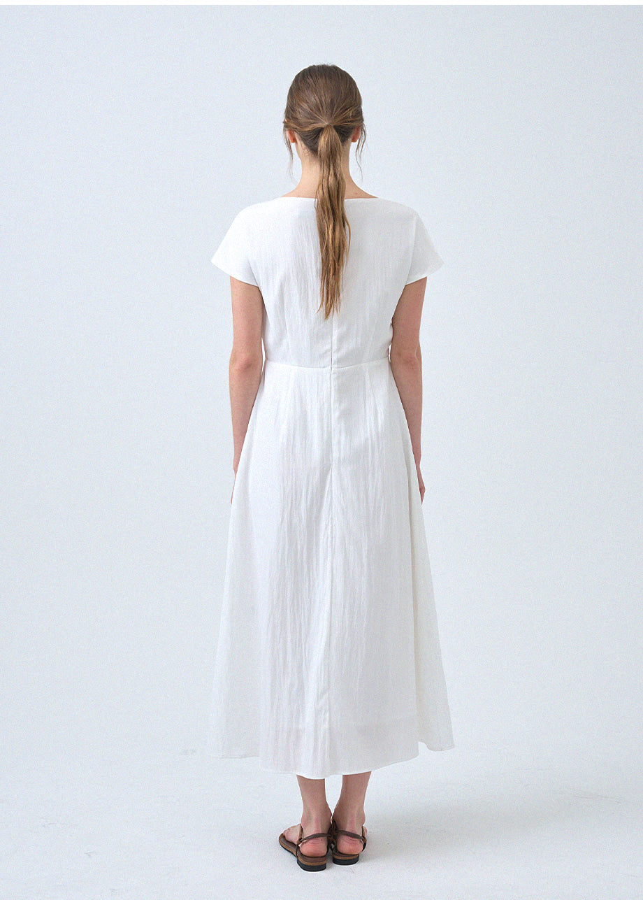 クラシックな感性のあるロングワンピースです。カップスリーブのデザインと程よい丈感で気軽に着用でき、ワイドなボートネックがフェミニンなムードを演出します。*装飾が施された製品のため、クリーニング専門店でのお手入れをおすすめいたします。