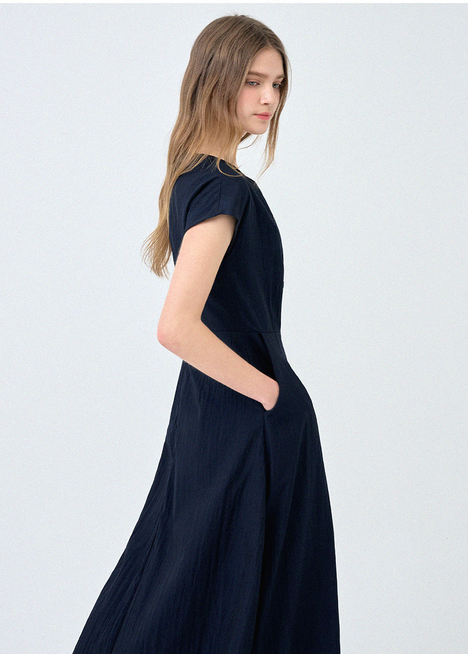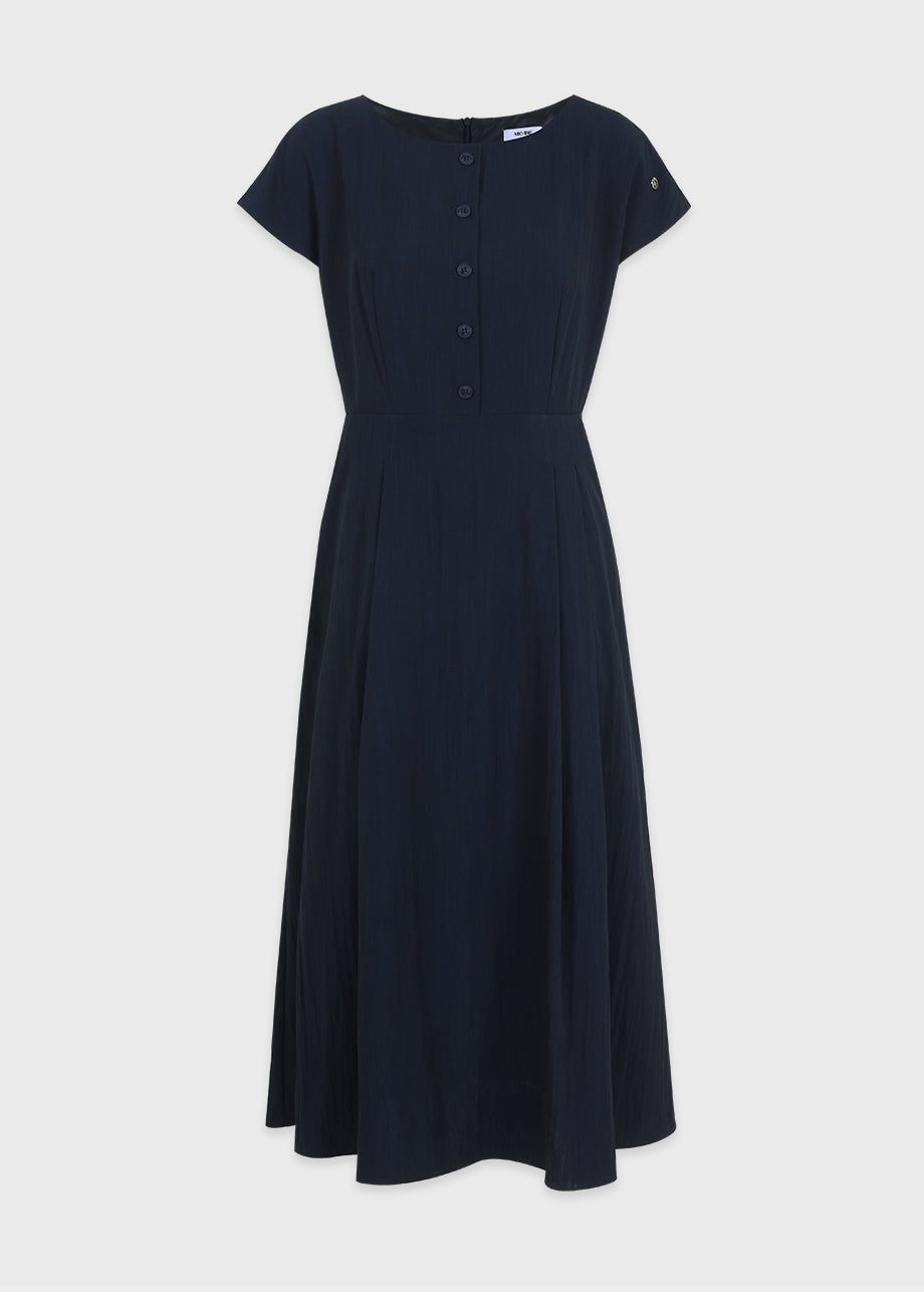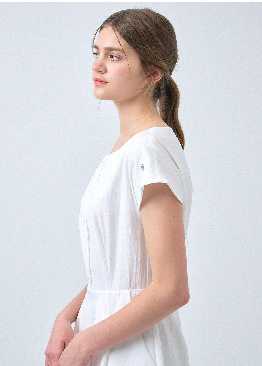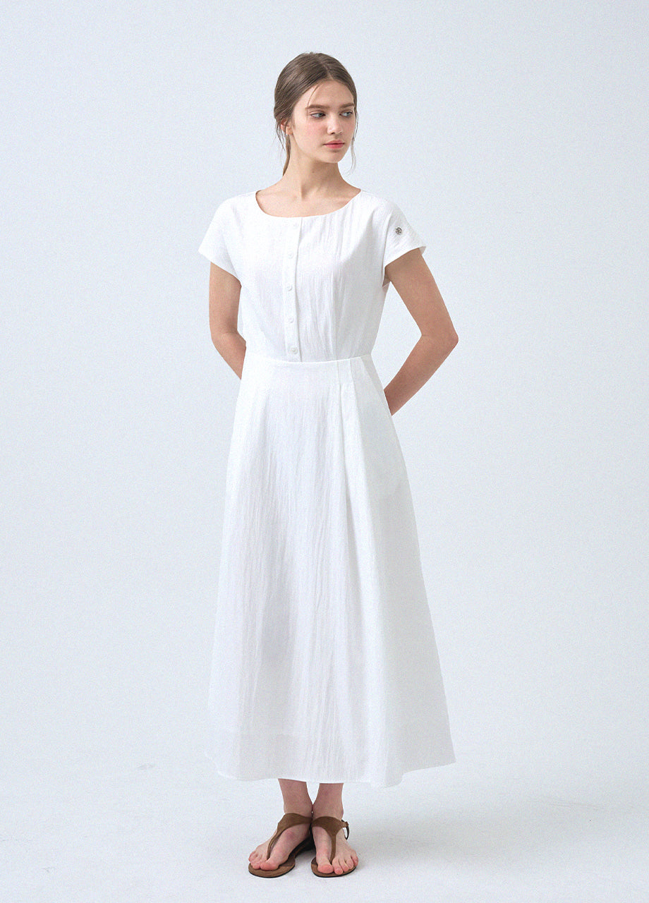 クラシックな感性のあるロングワンピースです。カップスリーブのデザインと程よい丈感で気軽に着用でき、ワイドなボートネックがフェミニンなムードを演出します。*装飾が施された製品のため、クリーニング専門店でのお手入れをおすすめいたします。