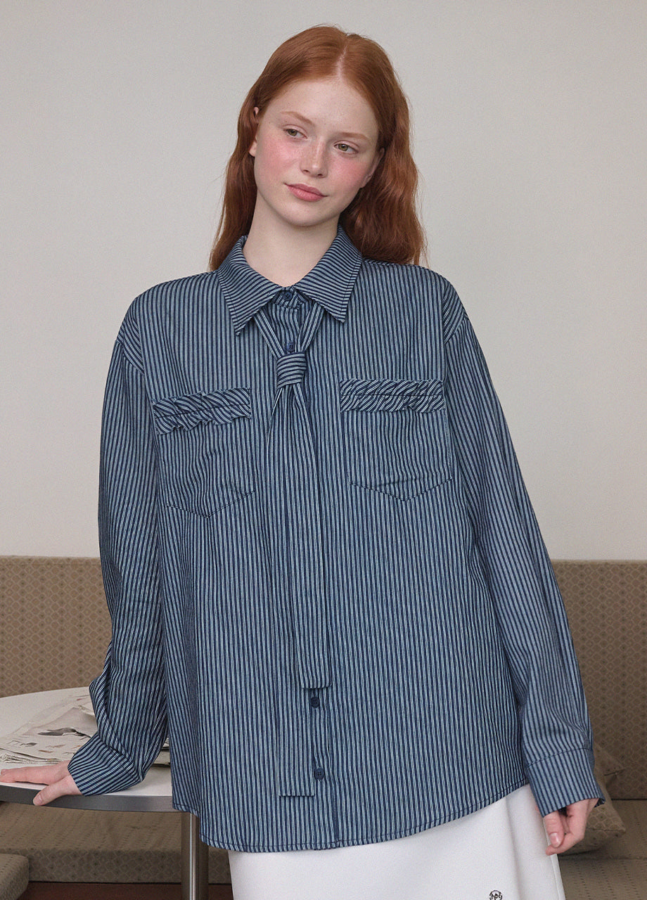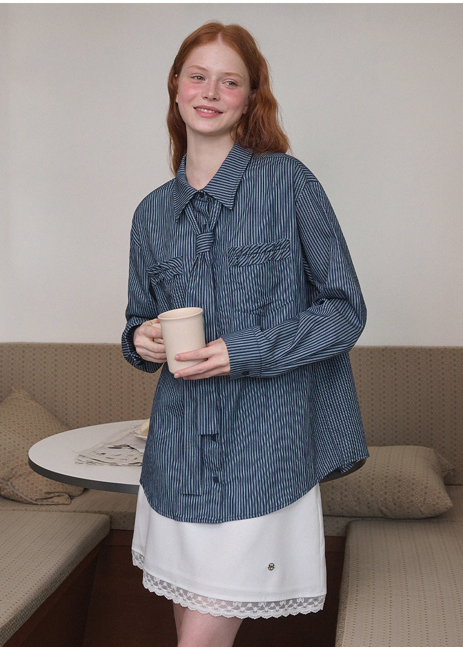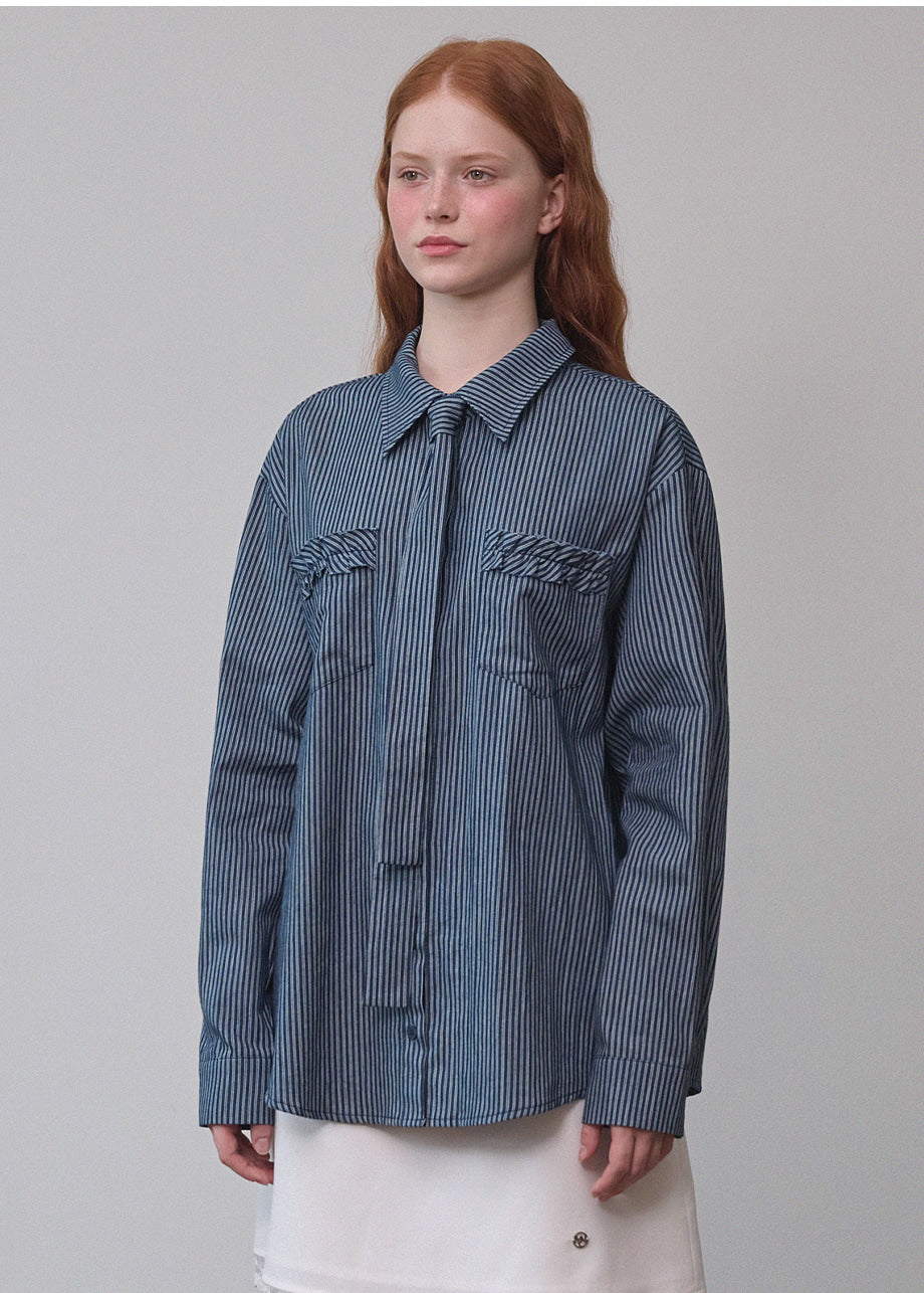 ヴィンテージ感のあるストライプデニムを使用したユニークなシャツ。フリル付きポケットや付属のストラップで、ネクタイ風やウエストマークなど自在なアレンジが楽しめます。ゆったりとしたシルエットで気軽に着用できます。*装飾が施された製品のため、クリーニング専門店でのお手入れをおすすめいたします。生デニム特有の色移りがあるため、商品到着後は単独で冷水洗いを行い、濃色のアイテムと合わせてご着用するのをおすすめいたします。