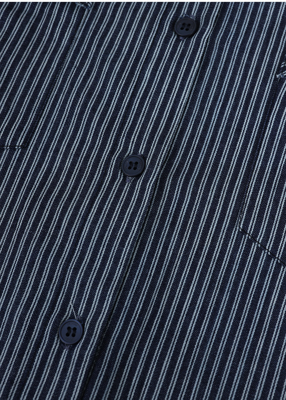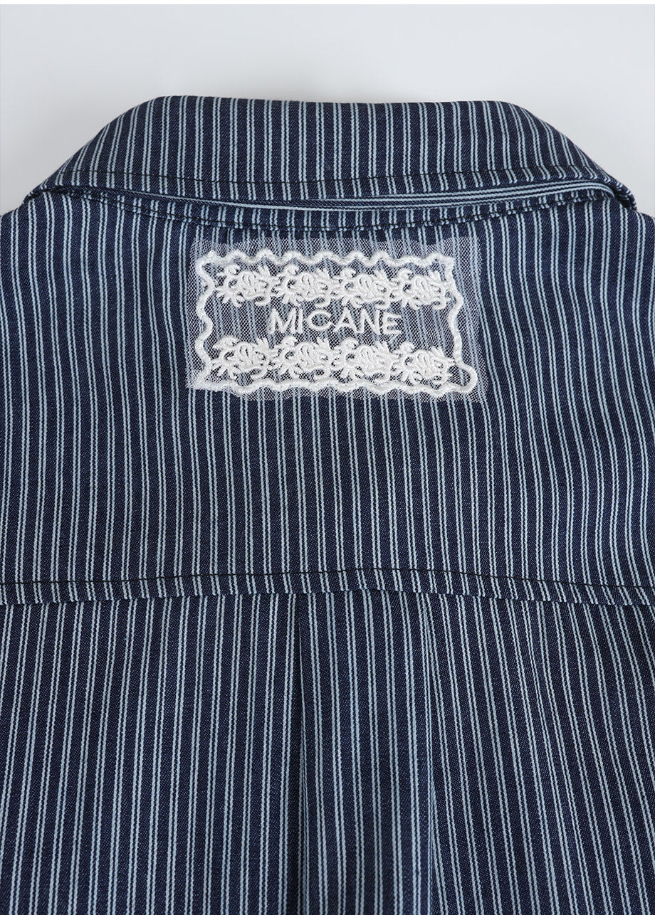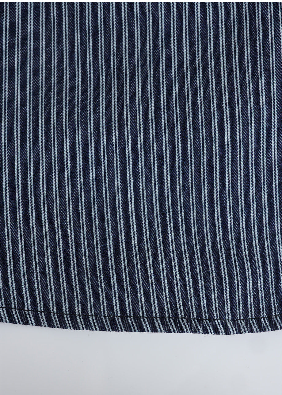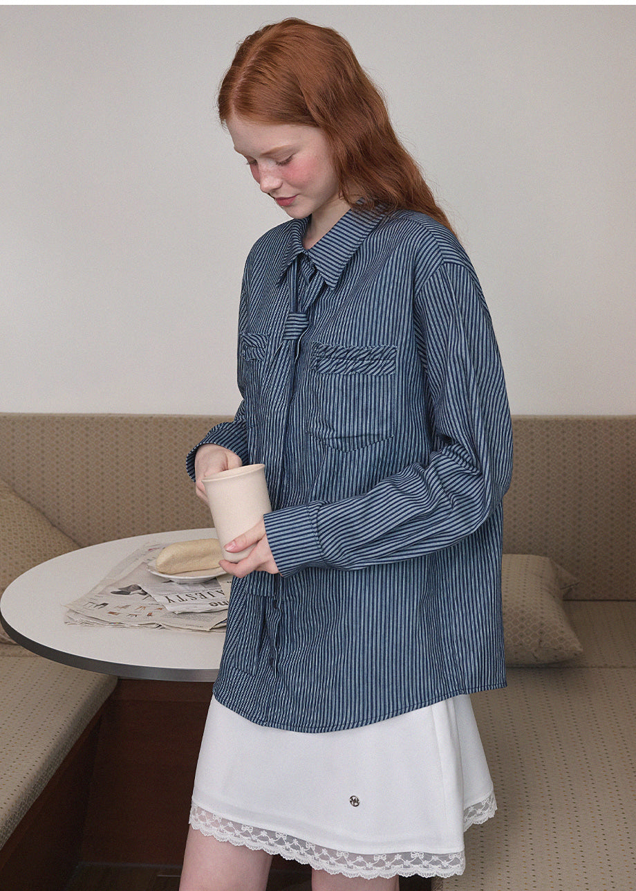 ヴィンテージ感のあるストライプデニムを使用したユニークなシャツ。フリル付きポケットや付属のストラップで、ネクタイ風やウエストマークなど自在なアレンジが楽しめます。ゆったりとしたシルエットで気軽に着用できます。*装飾が施された製品のため、クリーニング専門店でのお手入れをおすすめいたします。生デニム特有の色移りがあるため、商品到着後は単独で冷水洗いを行い、濃色のアイテムと合わせてご着用するのをおすすめいたします。